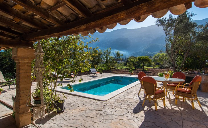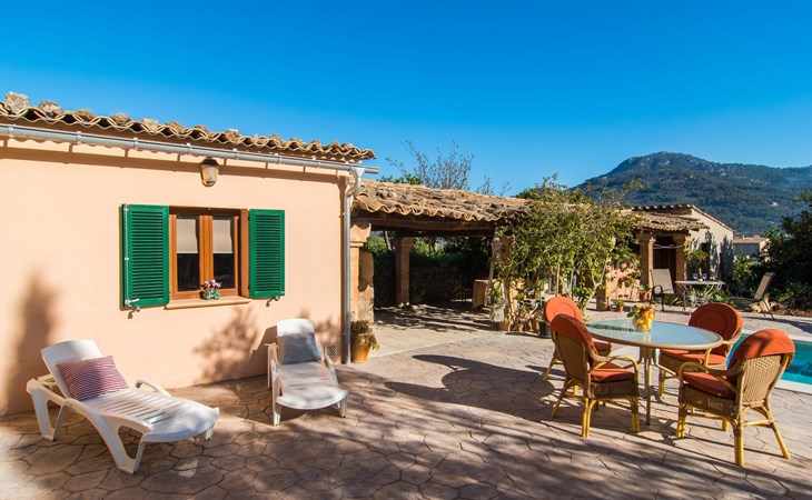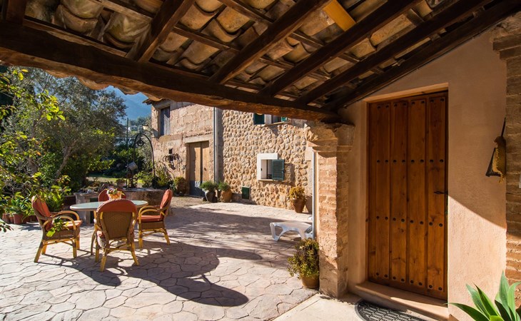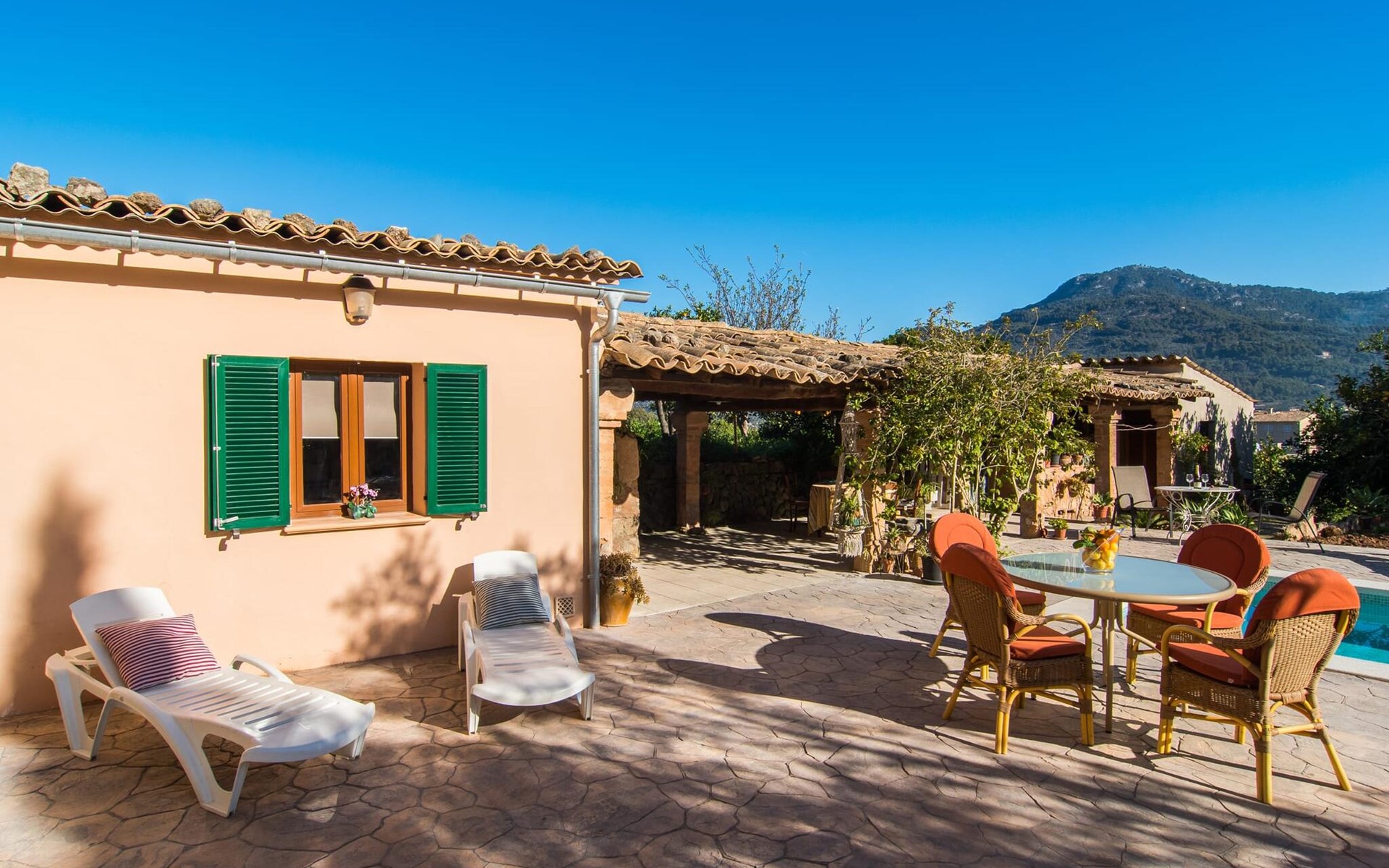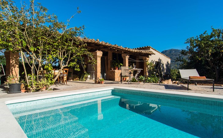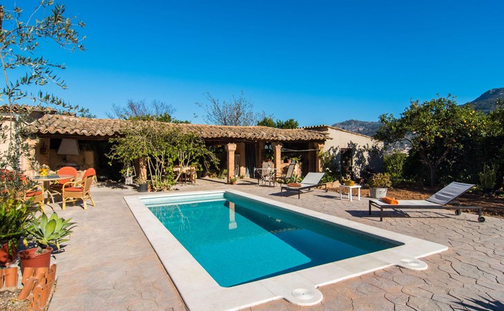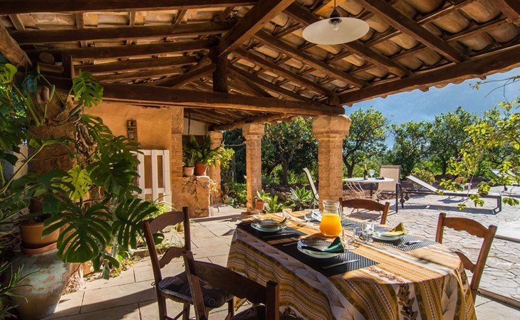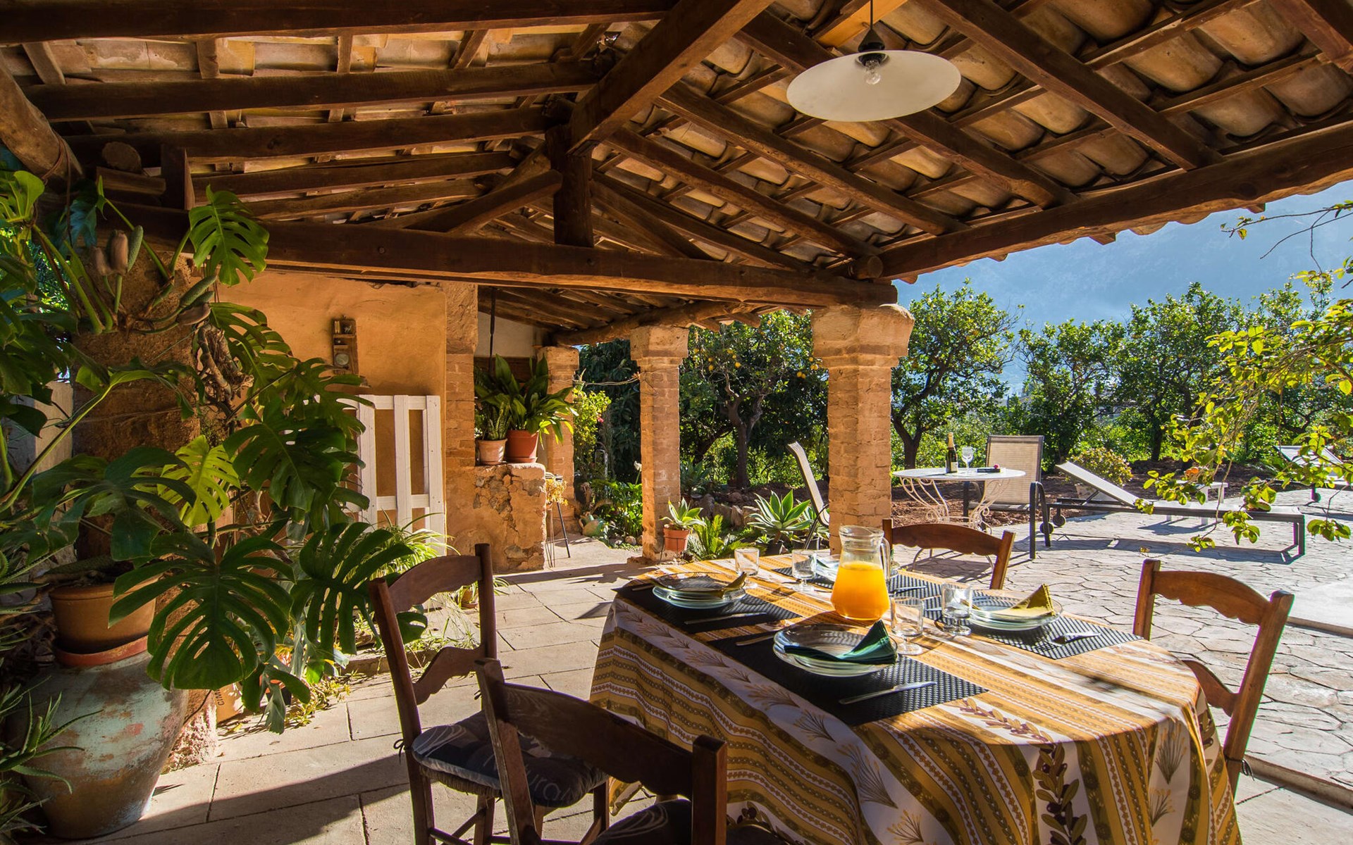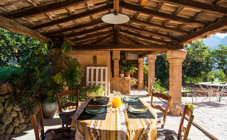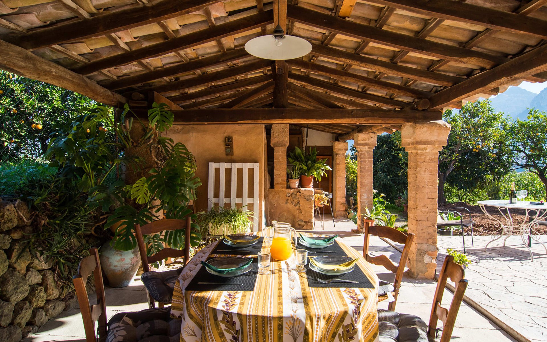 Dit fantastische huis is romantisch omringd door citroen- en sinaasappelboomgaarden in de vruchtbare, gouden vallei van Mallorca te midden van een fascinerend berglandschap. Een landgoed van 5.000 m² met een romantische tuin vol mediterrane plantenpracht verwelkomt je met een verscheidenheid aan inheemse bloemen, palmbomen en fruitbomen. Het adembenemende uitzicht op de sublieme bergwereld laat het alledaagse leven achter je. Geniet van je ontbijt buiten aan de houten eettafel op het ruime, overdekte terras voordat je op weg gaat naar de activiteiten van de dag. De houtskoolbarbecue is perfect om 's avonds heerlijke barbecuespecialiteiten op tafel te toveren. Op het zonneterras staan comfortabele ligstoelen klaar. Hier vind je nog een eettafel waar je kunt genieten van een café con leche terwijl je een goed boek leest waar je thuis geen tijd voor hebt gevonden. De woning heeft ook een buitentoilet. Omdat je huis geen directe buren heeft, kun je genieten van 100% privacy en nieuwe energie opdoen.