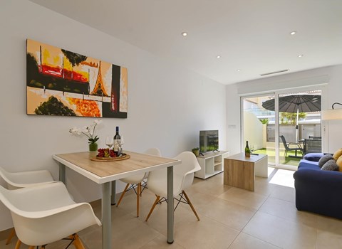 Goed onderhouden rijtjeshuis in de urbanisatie Pueblo Lucero. Je kinderen kunnen vrij rondlopen en het gemeenschappelijke zwembad is gemakkelijk te zien. Bij een bezoek aan Torrevieja, waarvan de twee grote zoutmeren het herkenningspunt vormen, is een bezoek aan een zoutfabriek een must. En het onlangs aangelegde Parque Aromático wacht op je voor een heerlijke geurbeleving. Lavendel, jasmijn, tijm, rozemarijn, salie, enz. maken het een echte plek voor aromatherapie. Pergola's, kronkelende kalkstenen paden en kinderspeelplaatsen maken het plaatje van dit volledig omheinde park compleet.