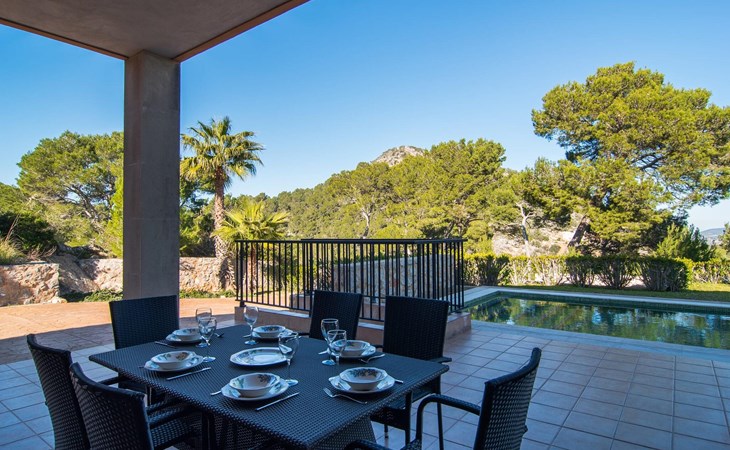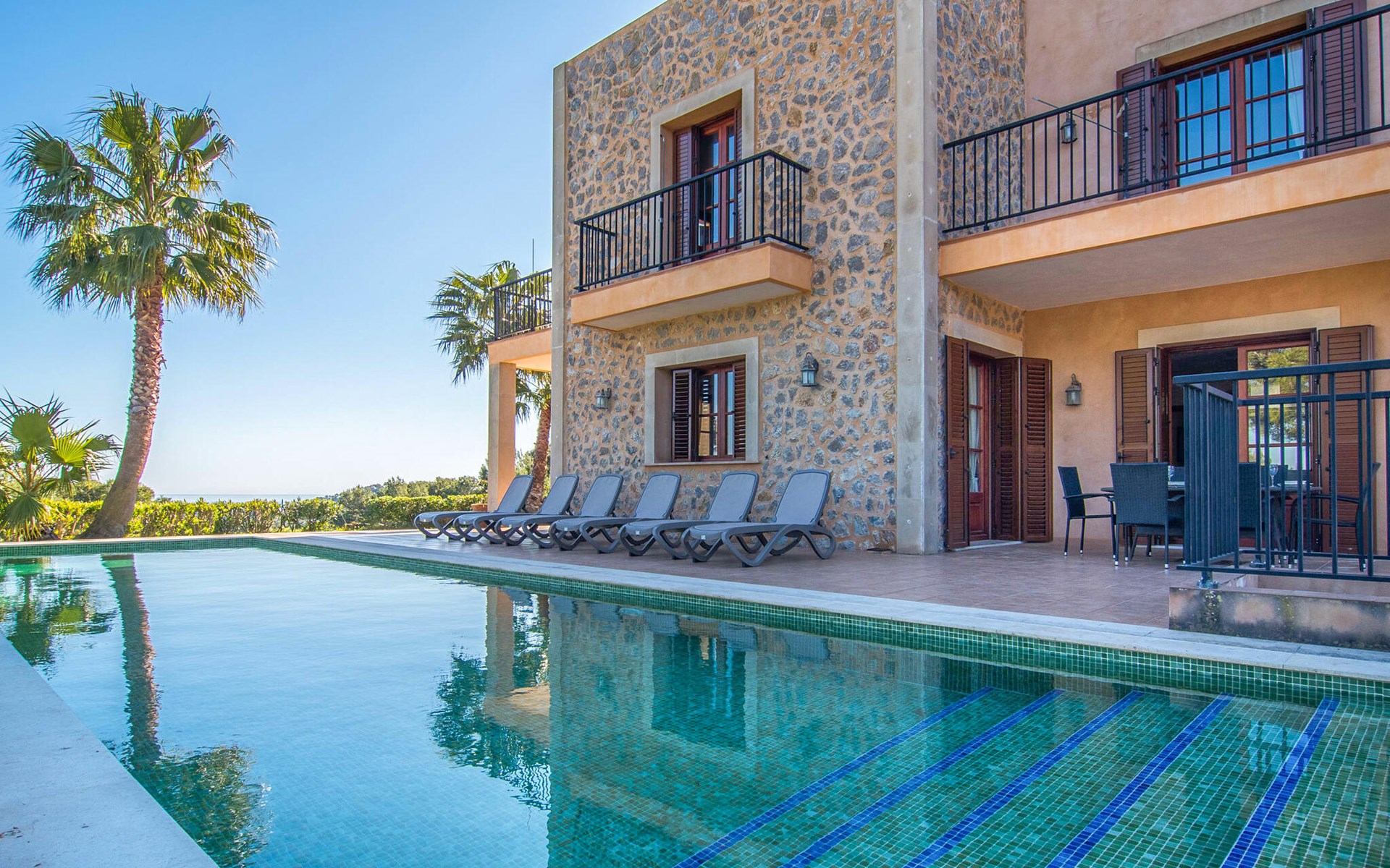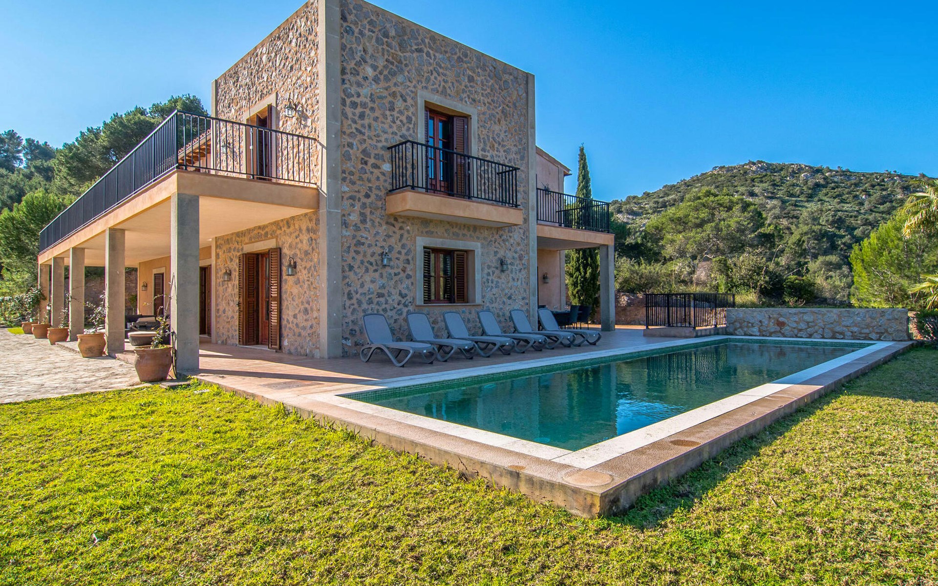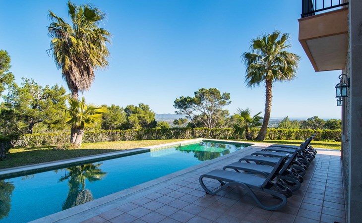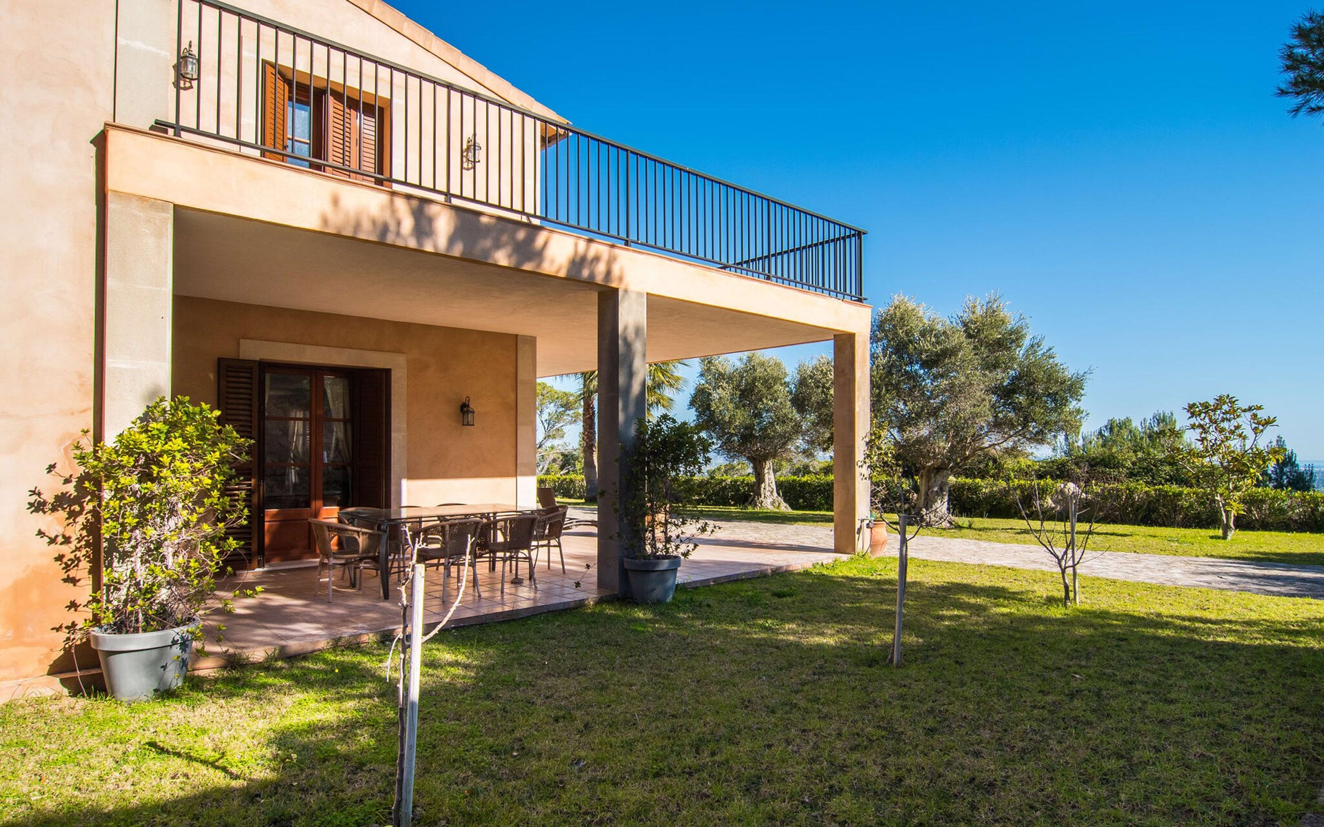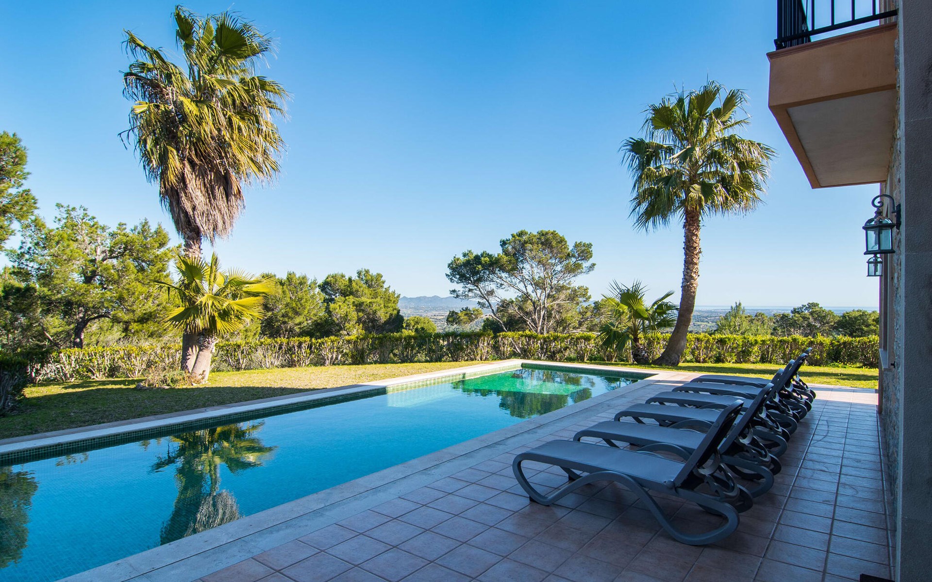 Ken je dat gevoel? Je komt voor het eerst een huis binnen en weet meteen: hier wil ik blijven. Dat gevoel krijg je hier waarschijnlijk ook, want Villa Dues betoverde ons meteen. Op het uitgestrekte landgoed van 30.000 m² is met veel vakmanschap en oog voor detail een plek gecreëerd die de ziel streelt en je gegarandeerd doet glimlachen. Haal diep adem en beleef een absoluut magisch moment wanneer de zon over de bergketen beweegt en het landschap in goudkleurig licht baadt: Het grandioze uitzicht geeft een gevoel van uitgestrektheid. Direct naast het huis is er een overdekt terras met een grote eettafel en barbecue, evenals een gebied met ligstoelen om te ontspannen en een gezellige outdoor lounge. Hou je van de zon? Er zijn extra ligstoelen bij het zwembad om lang te kunnen zonnebaden. Het grote, uitnodigende zwembad biedt niet alleen verfrissing op warme dagen, maar is ook de perfecte plek voor je ochtendtraining of een picknick bij zonsondergang dankzij het aangrenzende gazon. De bovenste verdieping van het twee verdiepingen tellende gebouw wordt omringd door verschillende balkons: Vanaf hier kun je ver over het eiland naar de zee kijken.
