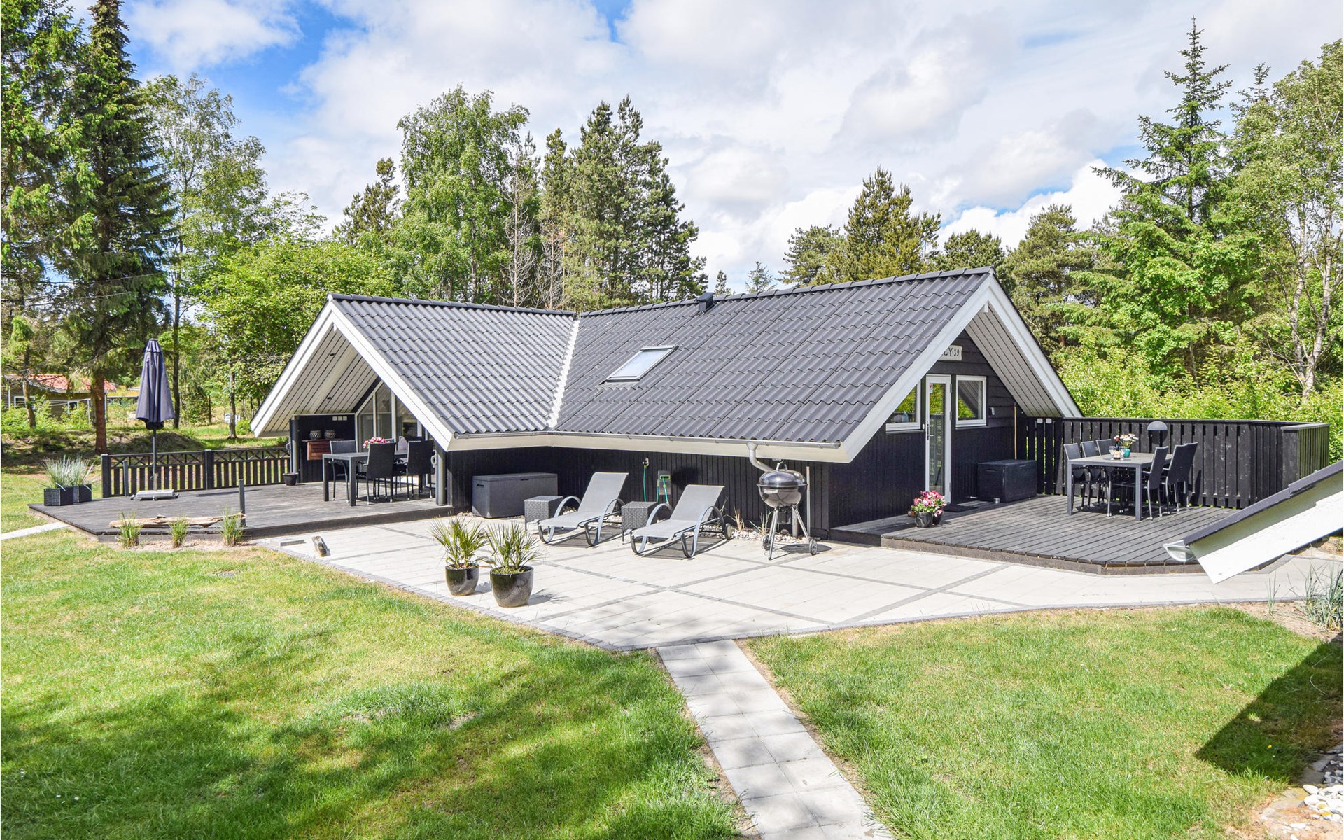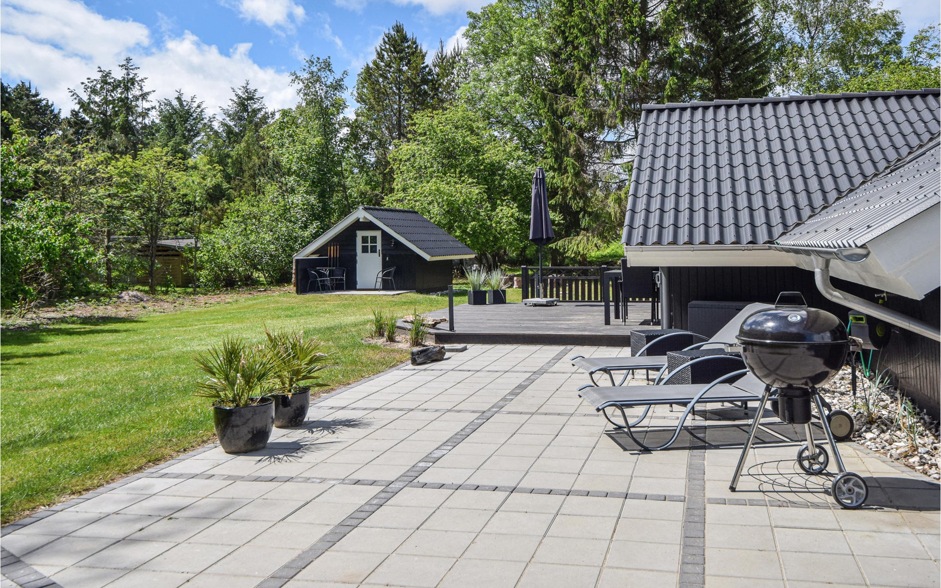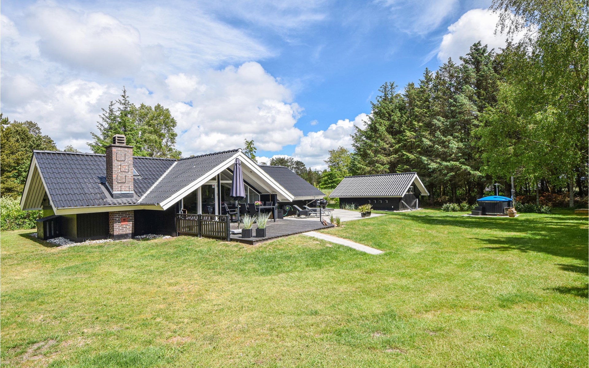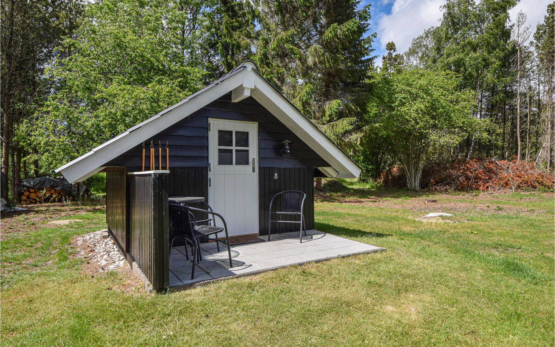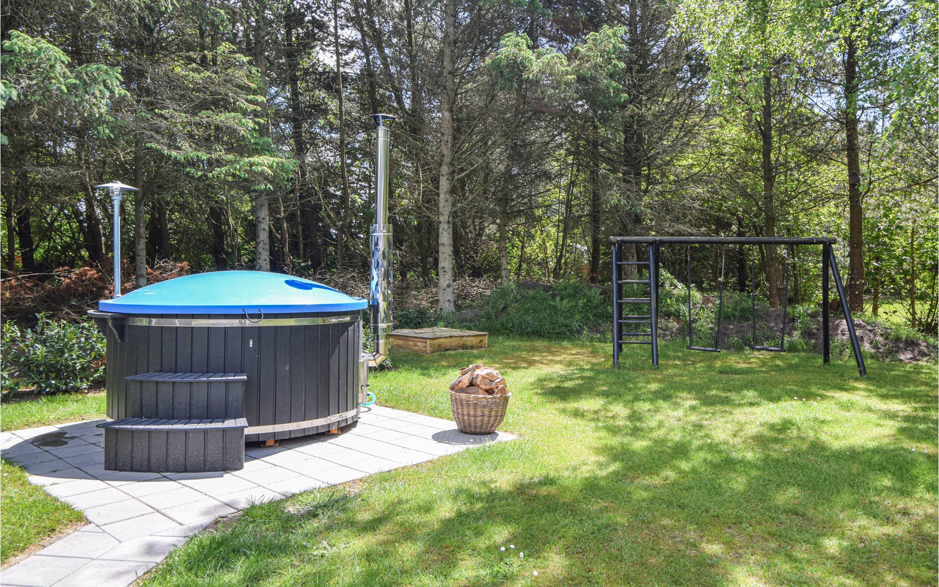 Het prachtige natuurlijke perceel is groot en omgeven door bomen en struiken, zodat u altijd de mogelijkheid heeft om aangename schaduw te vinden. In de tuin is er een schommel, kampvuurkuil, ruimte om met de bal te spelen en verstoppertje te spelen. Op het terrein staat een zogenaamd Wildmark bad voor 4 personen. Dit is een outdoor hot tub waar u ook op koude dagen en onder de sterrenhemel kunt genieten van het warme water.