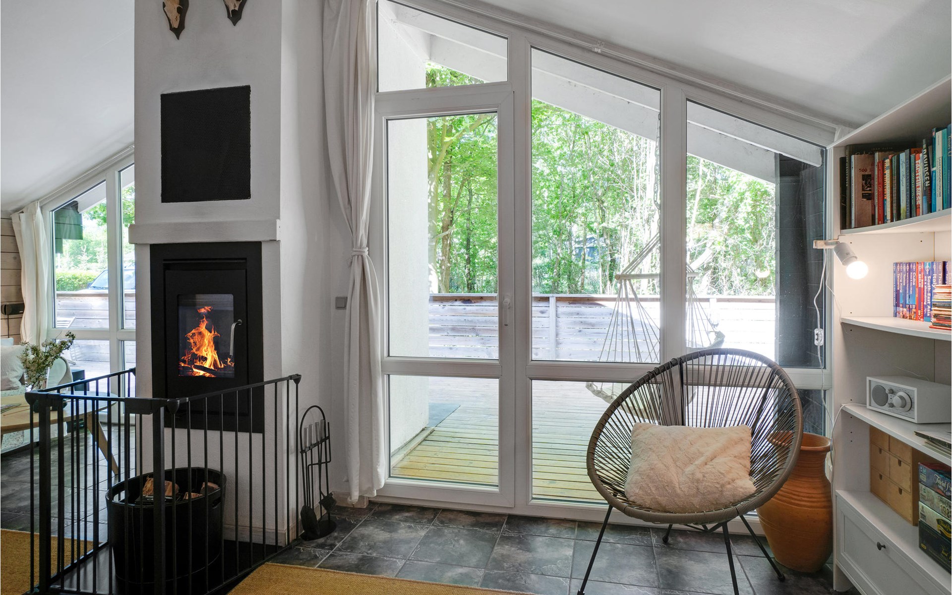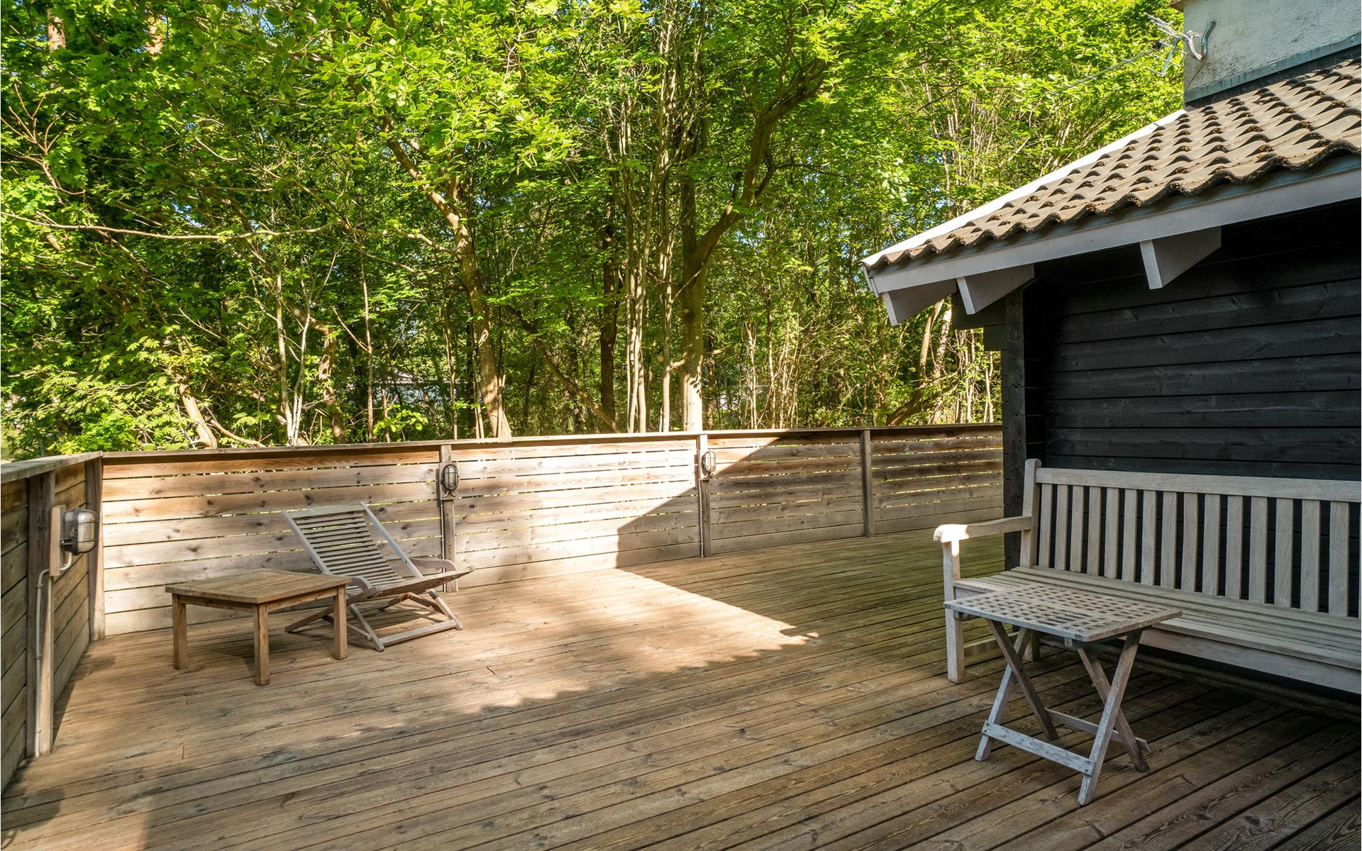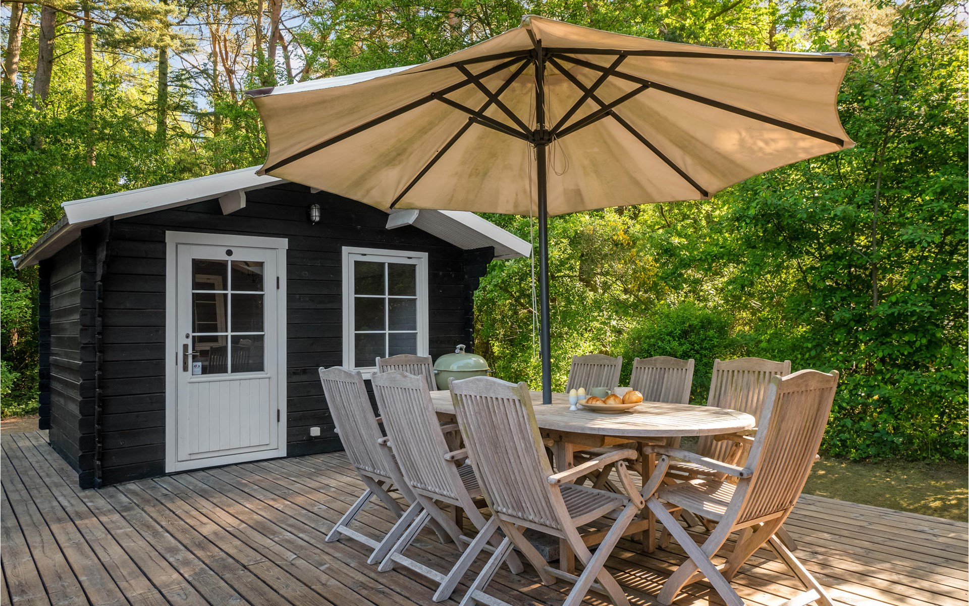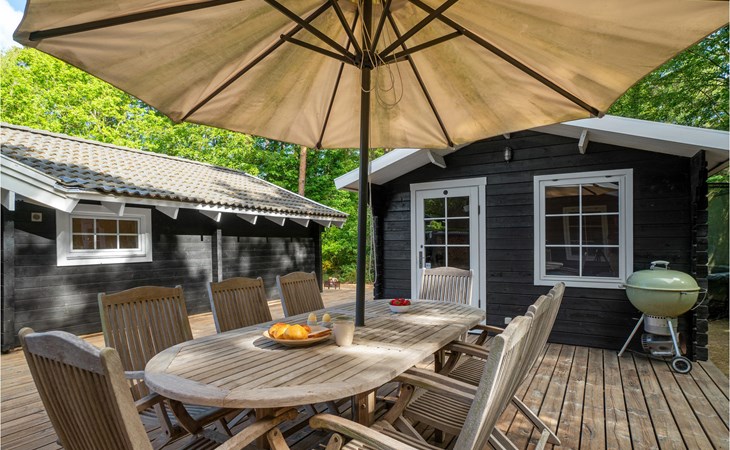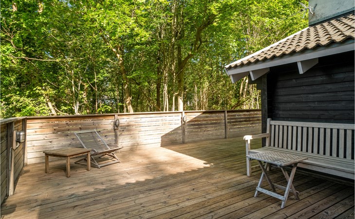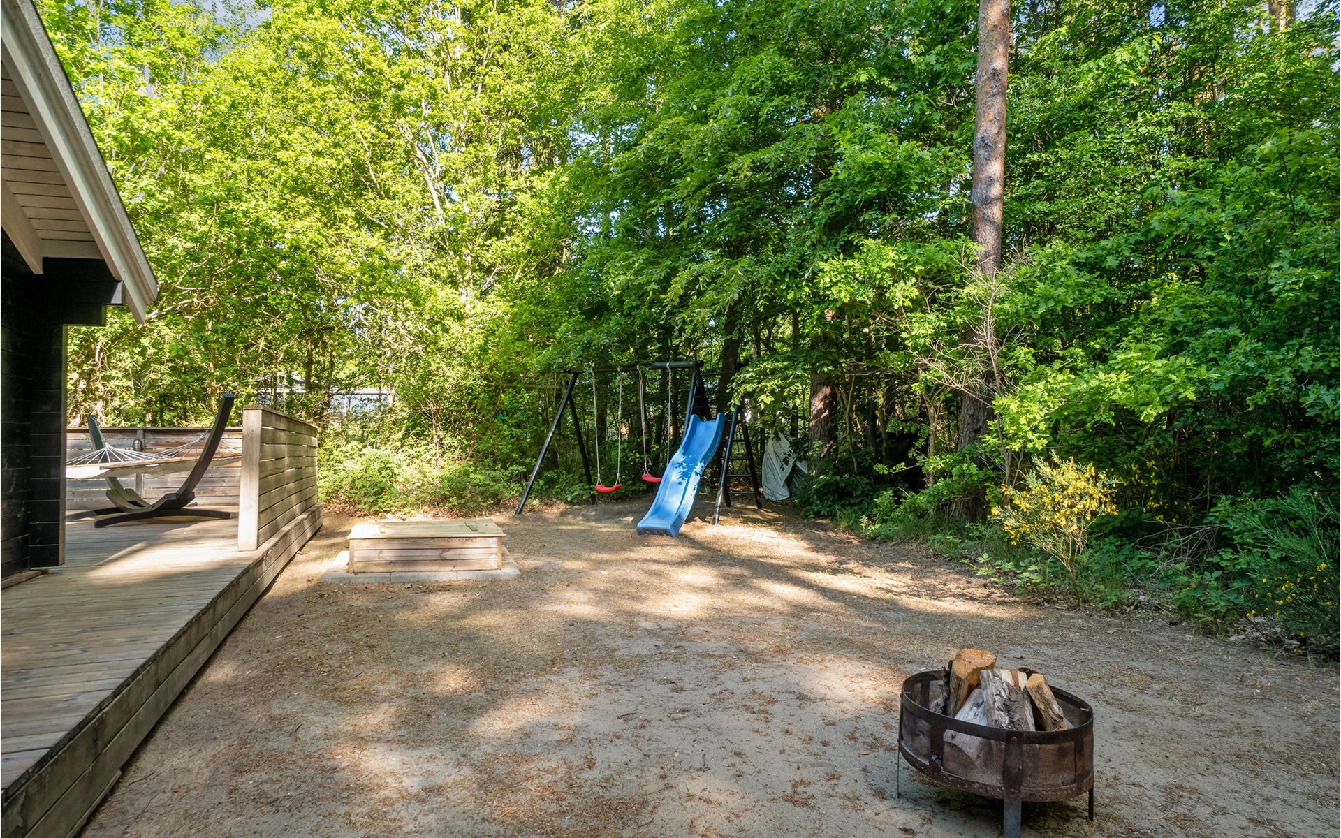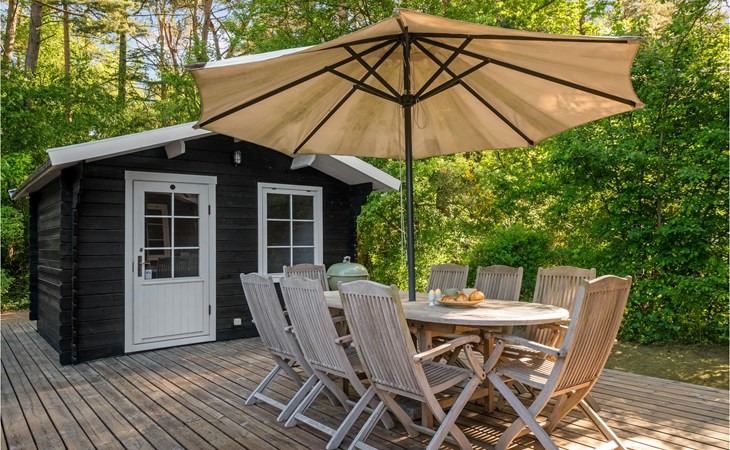 Het huis wordt omringd door een groot houten terras, dat ook het bijgebouw met het hoofdgebouw verbindt. Kom hier samen om te barbecueën en te ontspannen in de schaduw van de bomen en plannen te maken voor jullie komende vakantie. Daarna kunnen je kinderen spelen in de tuin of kun je samenkomen rond de vuurschaal.