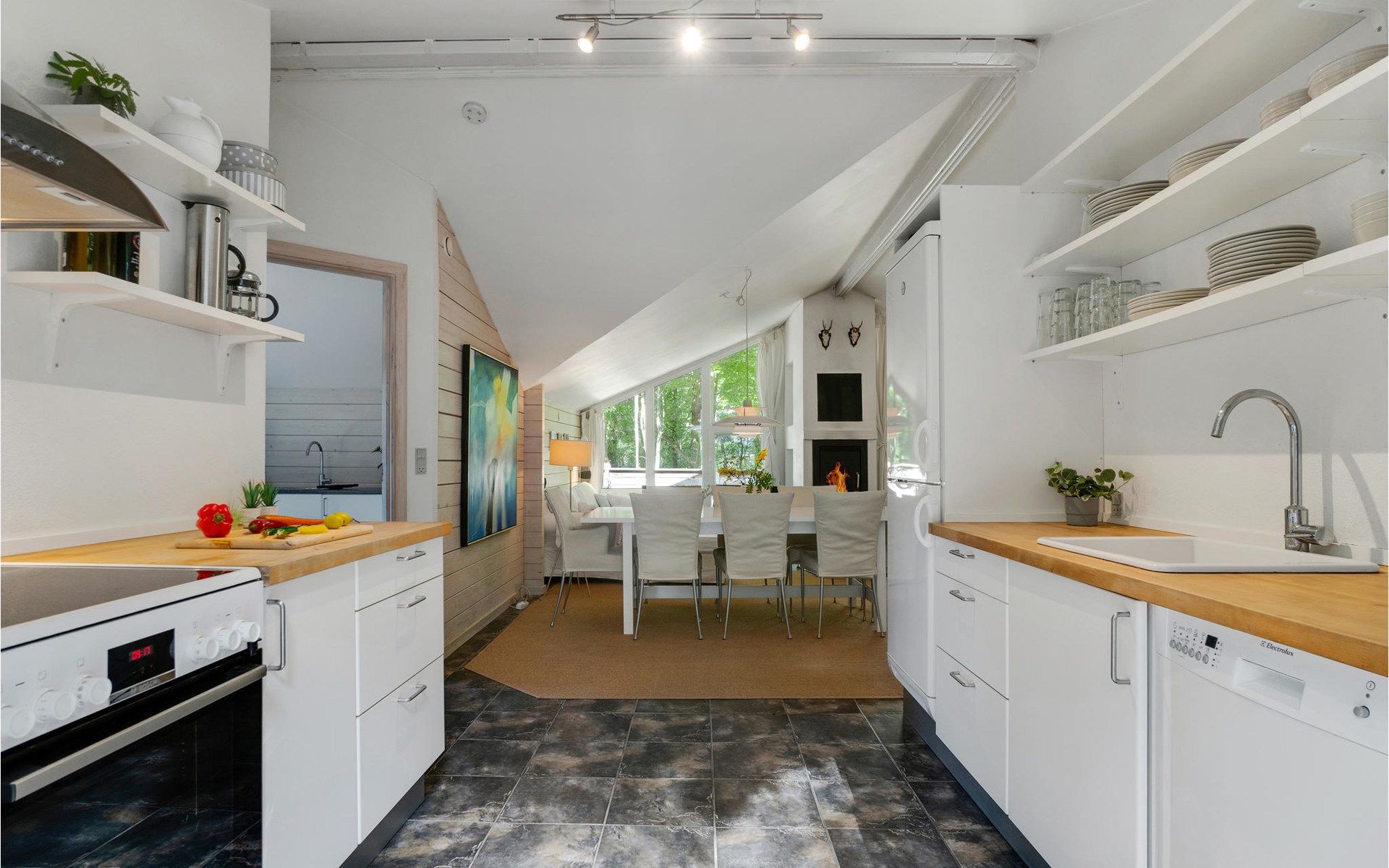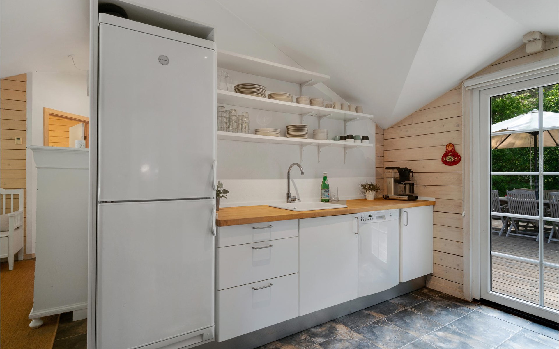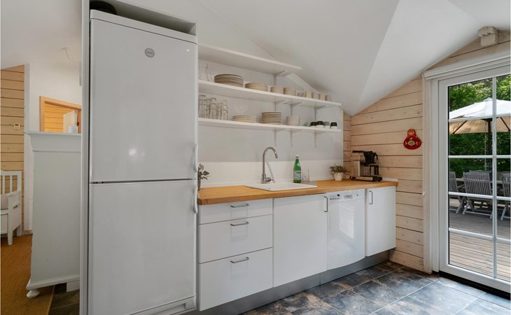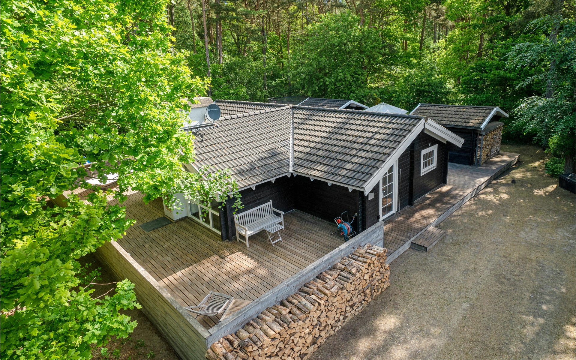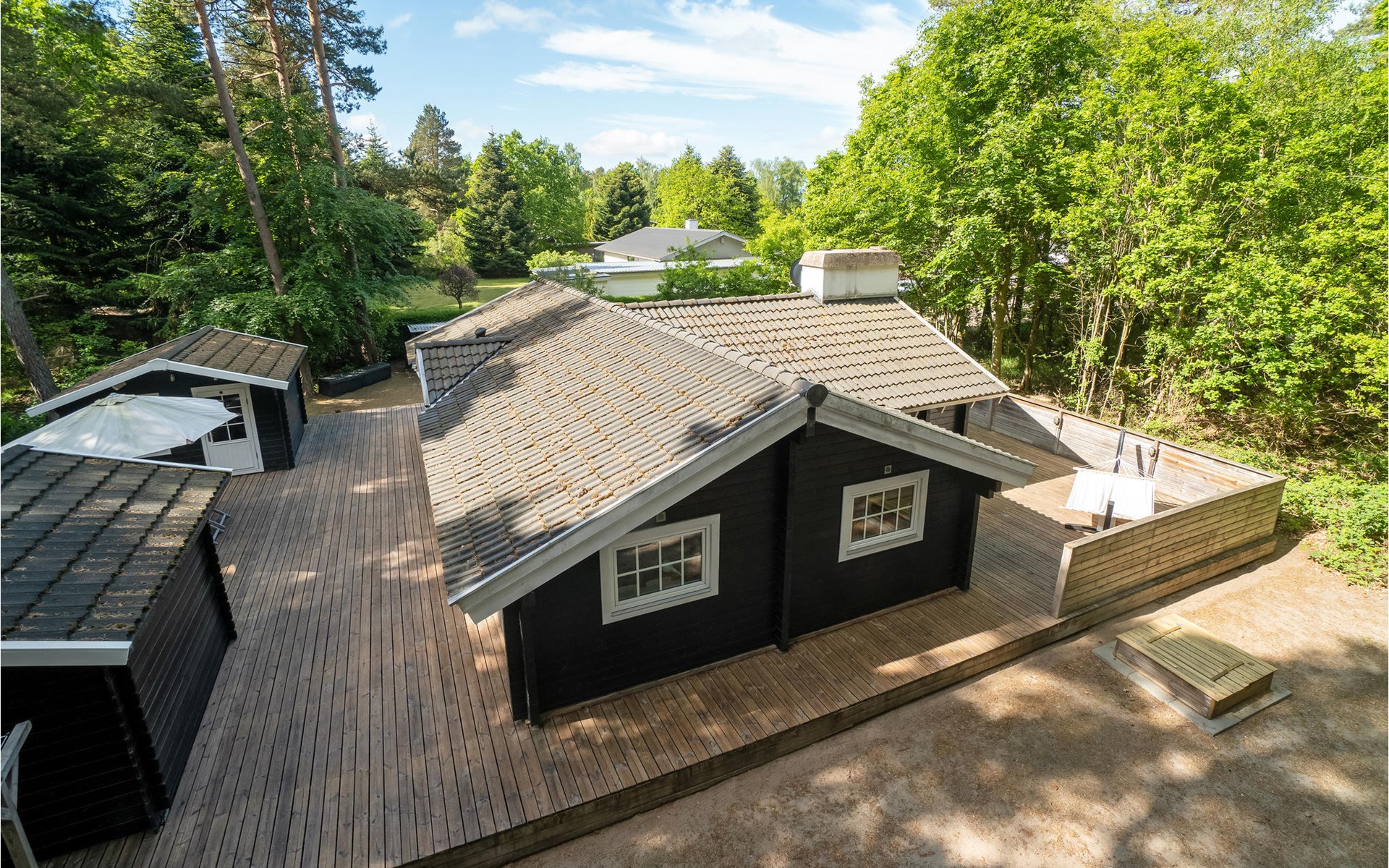 Het huis wordt omringd door een groot houten terras, dat ook het bijgebouw met het hoofdgebouw verbindt. Kom hier samen om te barbecueën en te ontspannen in de schaduw van de bomen en plannen te maken voor jullie komende vakantie. Daarna kunnen je kinderen spelen in de tuin of kun je samenkomen rond de vuurschaal.