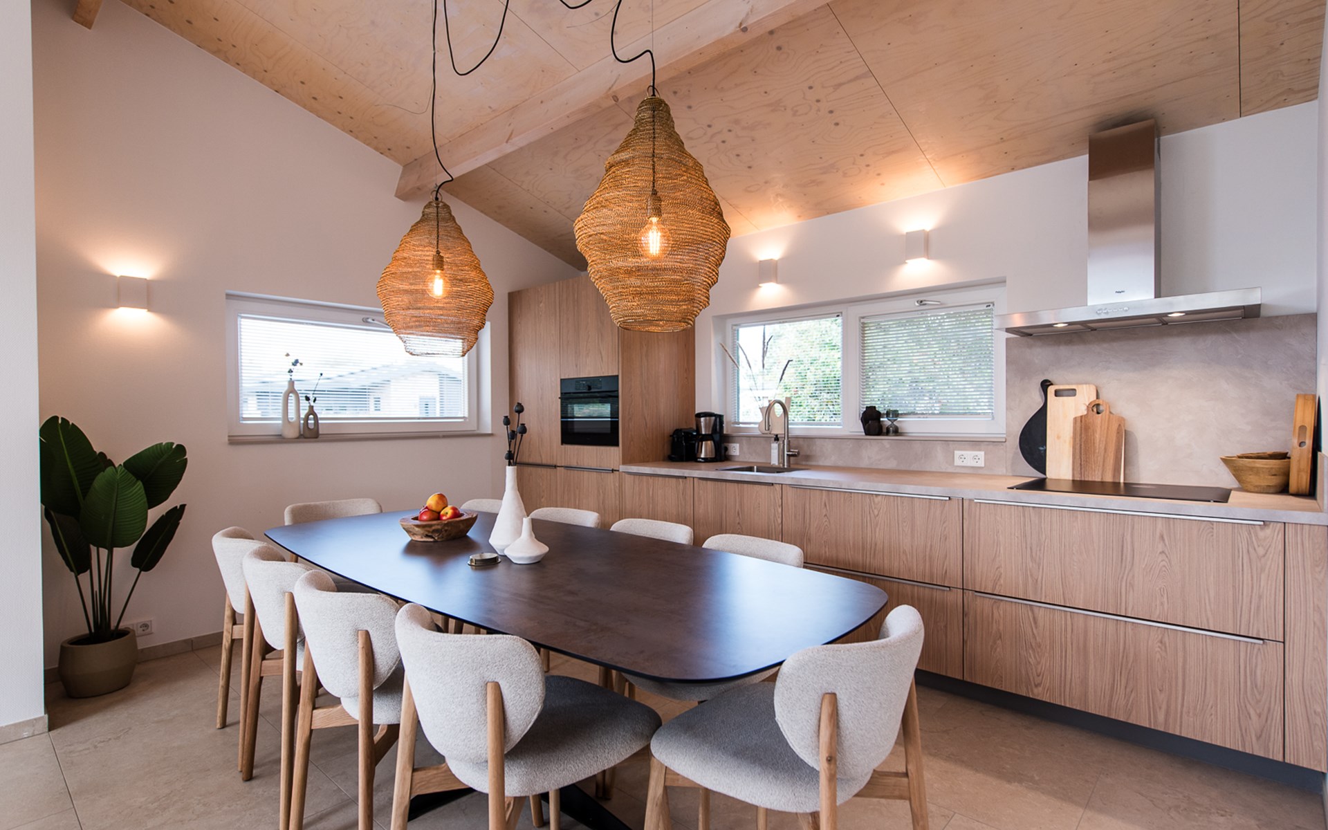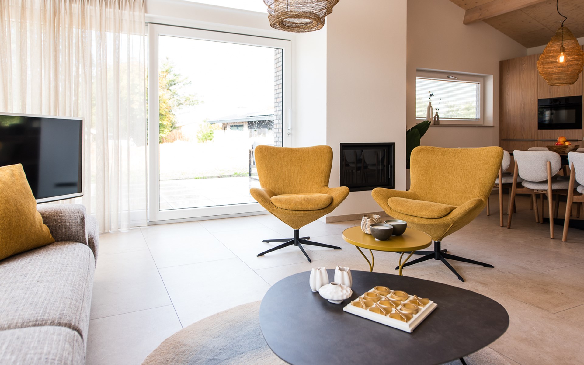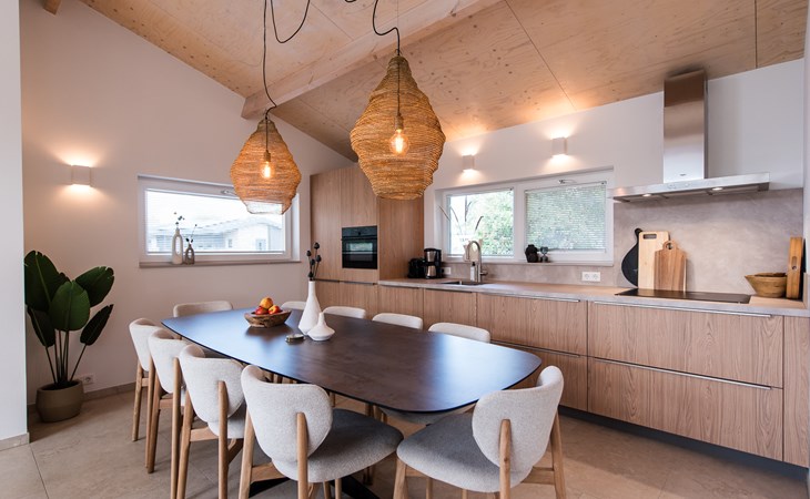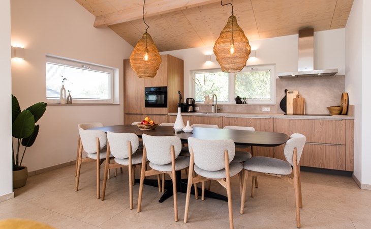 De open keuken is volledig ingericht met moderne apparatuur, zodat je met gemak een uitgebreid diner bereidt of gewoon een snelle maaltijd serveert aan de grote eettafel. De aangrenzende woonkamer biedt een gezellige zithoek met uitzicht op de tuin.