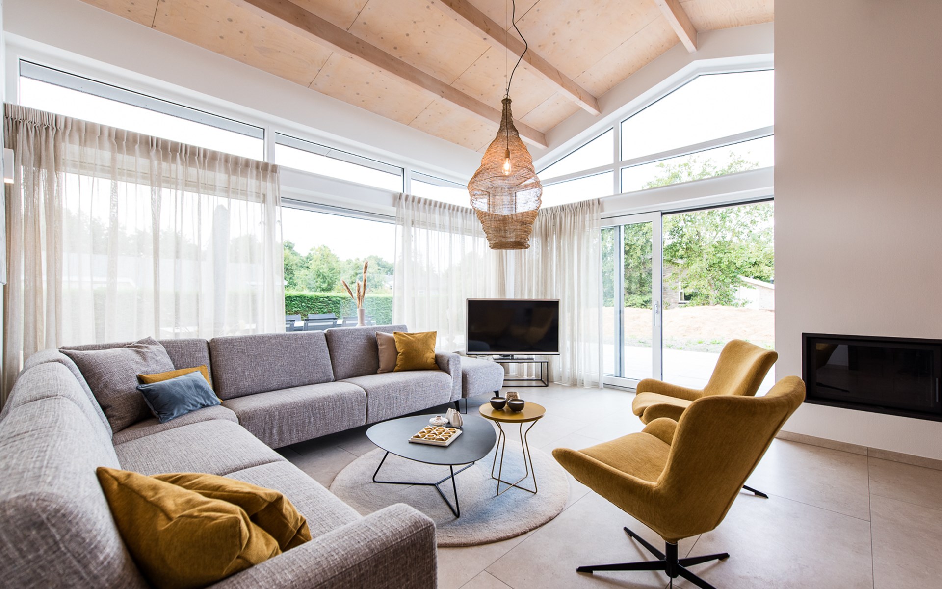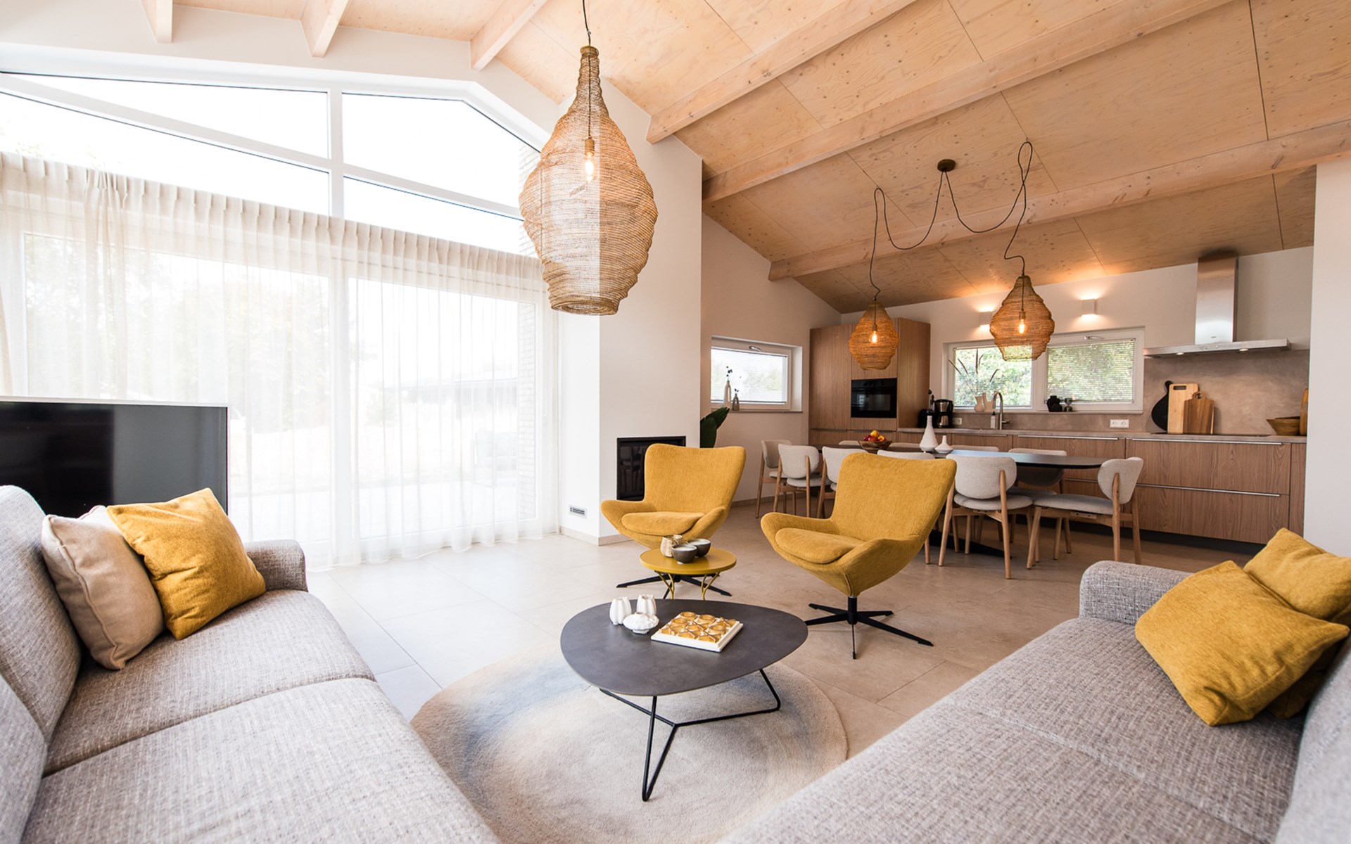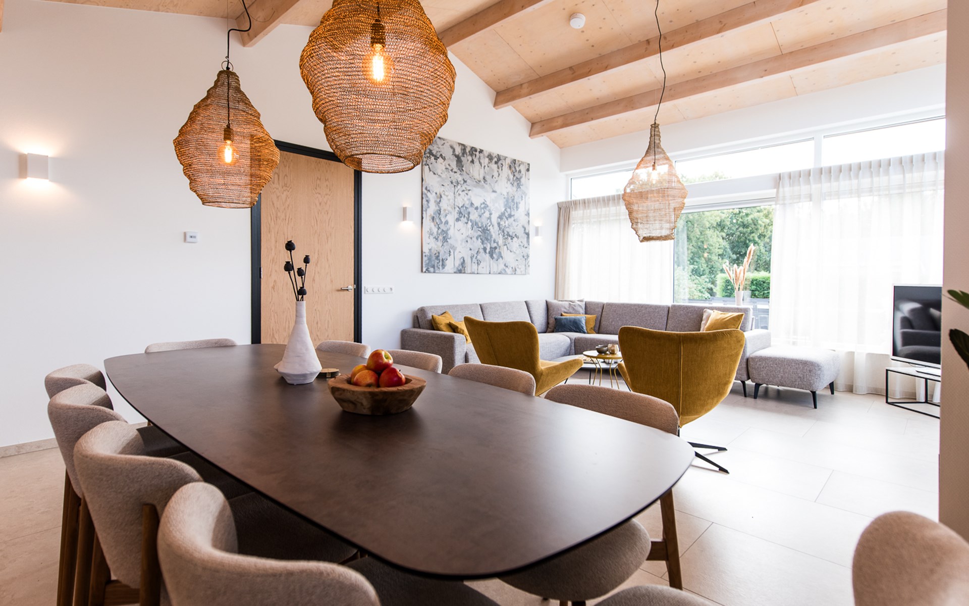 De open keuken is volledig ingericht met moderne apparatuur, zodat je met gemak een uitgebreid diner bereidt of gewoon een snelle maaltijd serveert aan de grote eettafel. De aangrenzende woonkamer biedt een gezellige zithoek met uitzicht op de tuin.