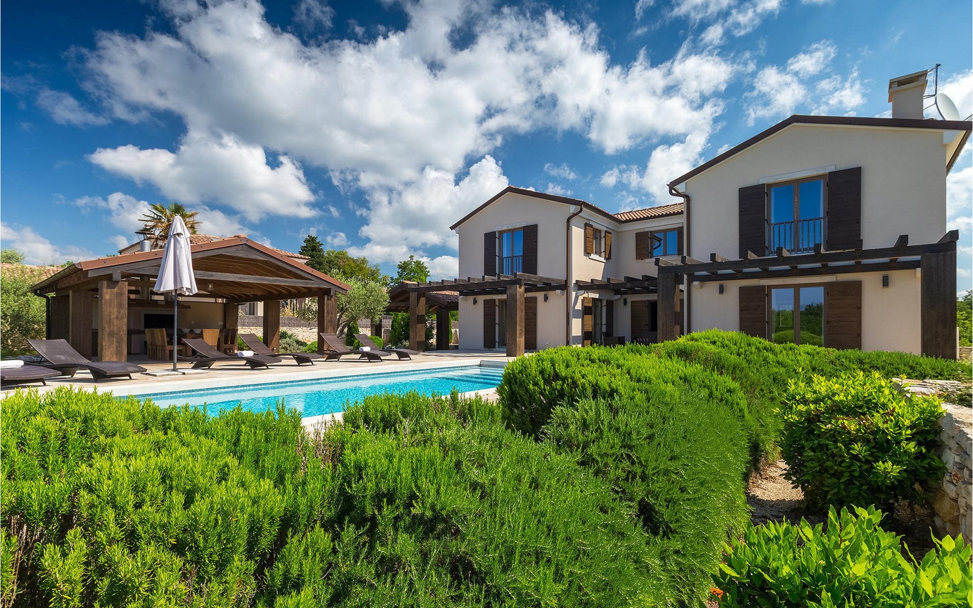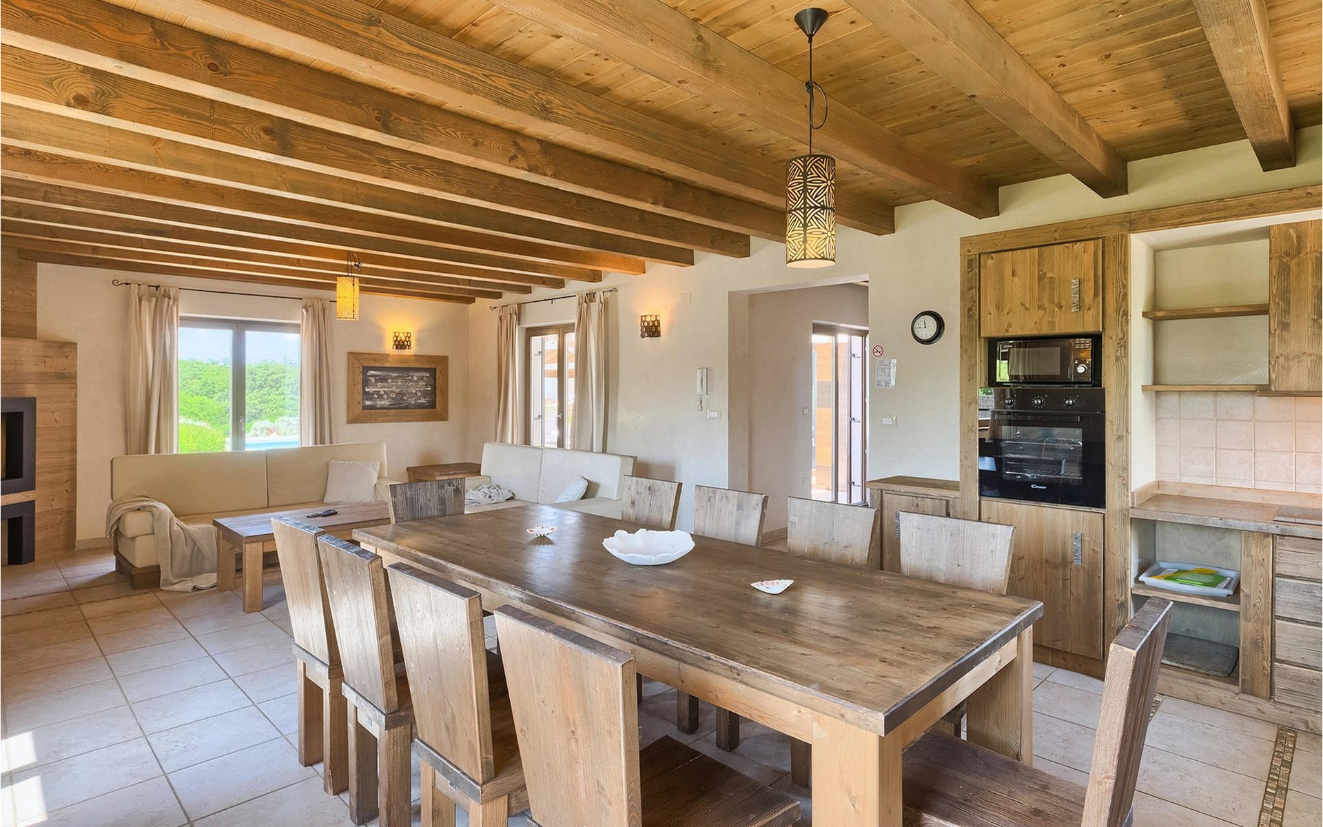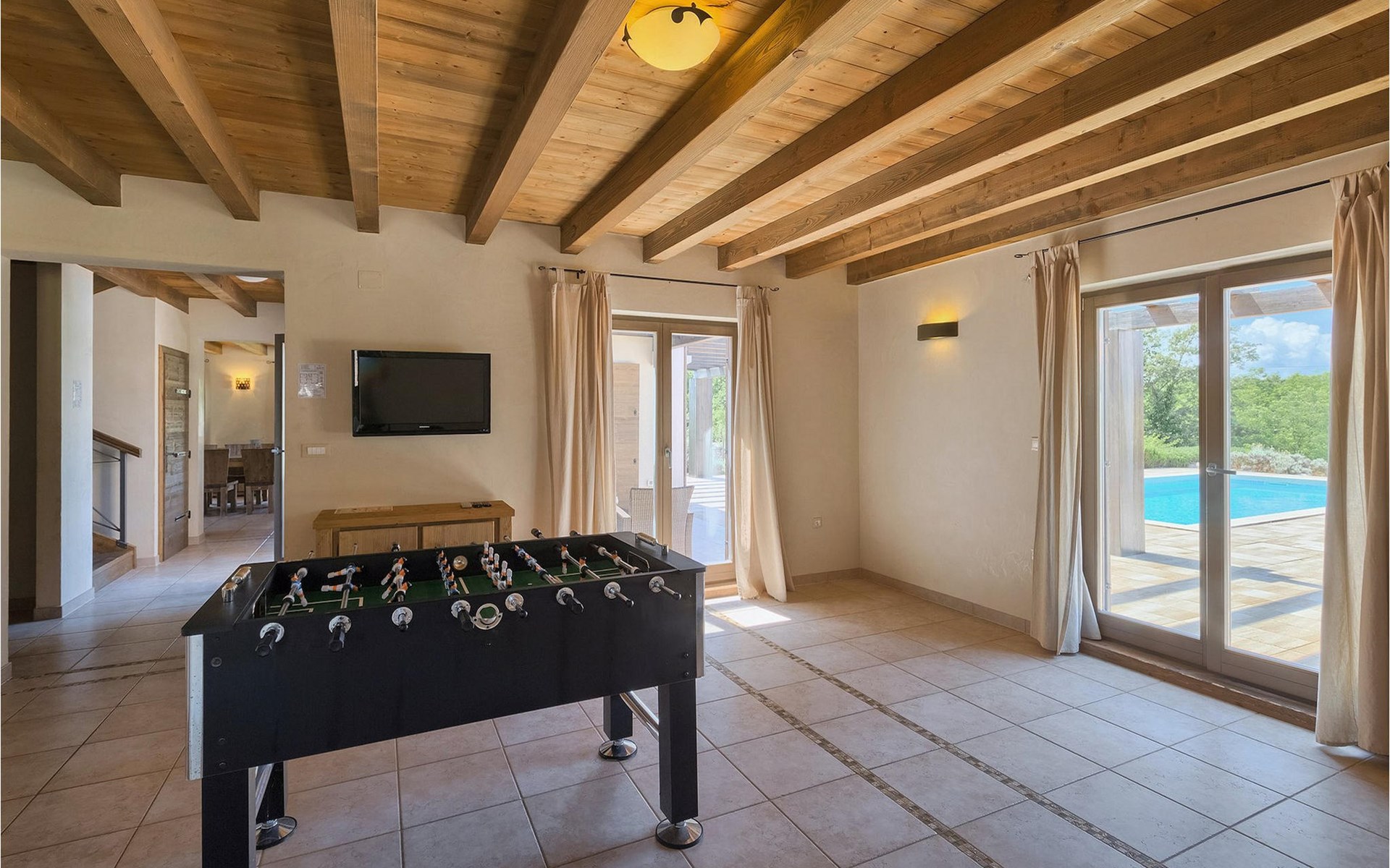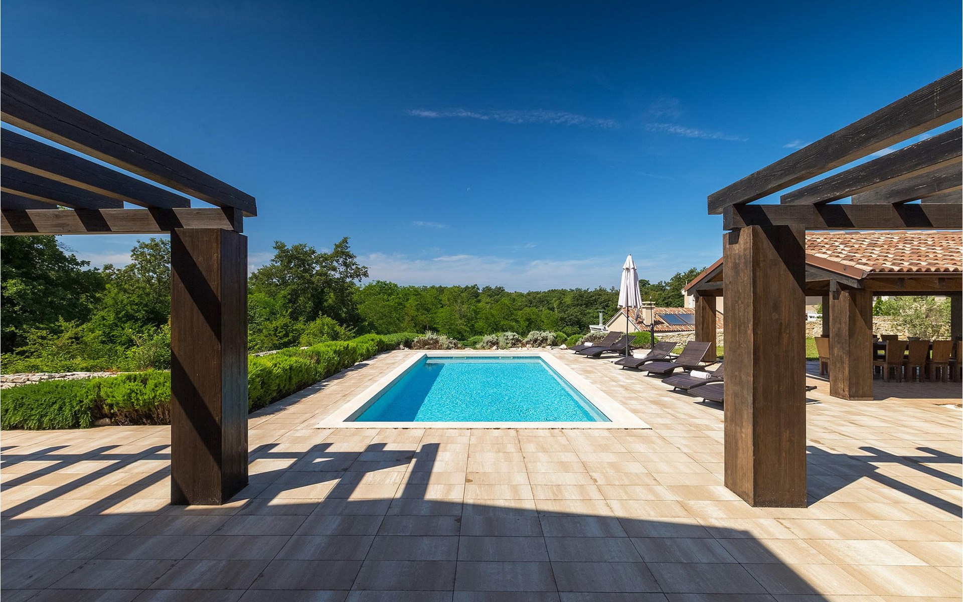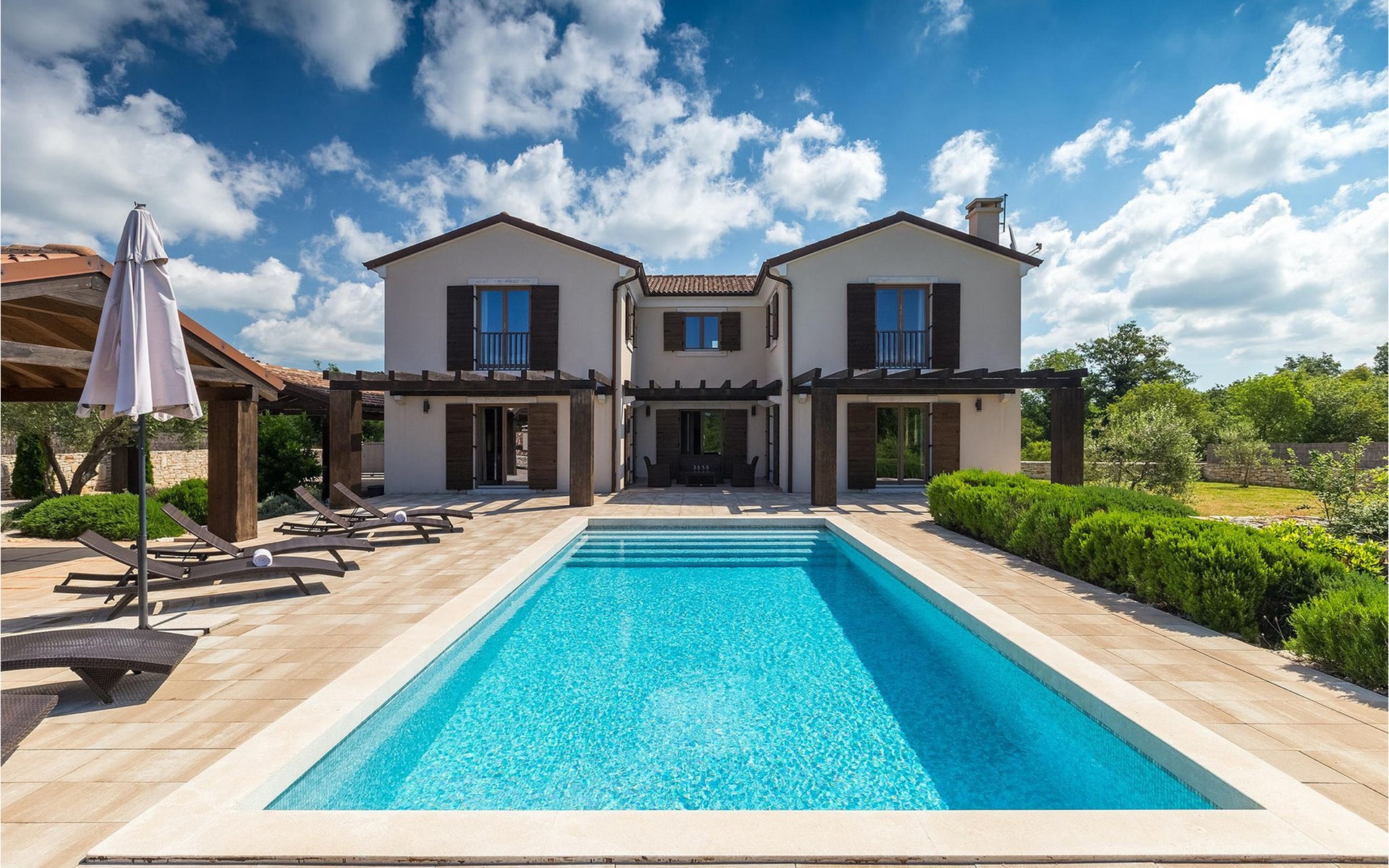 Deze prachtige villa met 5 slaapkamers ligt in Bonasini, een klein charmant dorpje, gebouwd van steen en met 10 inwoners - een zeer rustige locatie voor een ontspannen vakantie. Het ligt op een zonnige heuvel, omringd door bossen in de ongerepte natuur, dus de locatie is perfect voor activiteiten in de buitenlucht. De binnenruimte van de villa is 265m2 en de buitenruimte is 1290m2. Het huis heeft een eigen tuin, een privézwembad, een overdekte barbecue en een eethoek met een zomerkeuken en ontspannend tuinmeubilair. De villa is goed uitgerust en smaakvol ingericht met aandacht voor detail. Alle slaapkamers hebben een en-suite badkamer en airconditioning. Naast het hoofdgebouw is er een klein privé wellnesscentrum (Finse sauna, jacuzzi, douche) voor jouw plezier. Er is ook een gemeenschappelijk sportcentrum in de buurt met volleybalveld, tafeltennis en badmintonveld en de luchthaven van Pula ligt op slechts 20 km afstand. Pula (15 km) is de regionale hoofdstad van Istrië met een uitstekende selectie restaurants en aantrekkelijke winkelgebieden. Maak een wandeling door Pula en ervaar de straten en pleinen van de oude stad, waarvan sommige dateren uit de Romeinse tijd. Het prachtige amfitheater dateert uit de 1e eeuw na Christus en is het 6e grootste ter wereld. Het stadscentrum ligt op ongeveer 10 minuten rijden van de luchthaven. Fazana is een kleine kustplaats, 11 km van Bonasini, met een haven vanwaar toeristische boten (15 min) je naar een van de mooiste nationale parken in Kroatië brengen - Brijuni. Fazana biedt een groot kiezelstrand met mogelijkheden voor talrijke watersporten en activiteiten. Vodnjan is een typisch middeleeuws stadje met een interessant architecturaal patroon: de huizen van de stad vormen ook de stadsmuren en dienden vroeger als verdediging. Op het centrale plein staat een prachtige barokke kerk, verschillende restaurants en een nieuw sportpark met tennisbanen. St. Vincenat (5km) ook bekend als Savicenta, een klein charmant stadje in centraal Istrië. Dit dorp is gecentreerd rond tal van prachtig gerestaureerde 14e en 16e eeuwse kerken en een versterkt landhuis. Er zijn enkele uitstekende restaurants en cafés en sinds kort is Vodnjan uitgegroeid tot een van de culturele topsteden in Istrië, waar elk weekend evenementen plaatsvinden. Rovinj, (23 km) met een 1700 jaar oude geschiedenis is de mooiste en meest luxueuze toeristische stad in Istrië, met een prachtig oud stadscentrum, een parel van architectuur. De prachtige gebouwen en charmante straatjes vol kleine kunstgaleries, creëren een geweldige schildersstad met talloze restaurants en cafés.