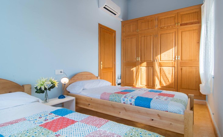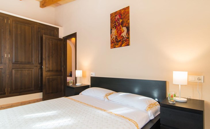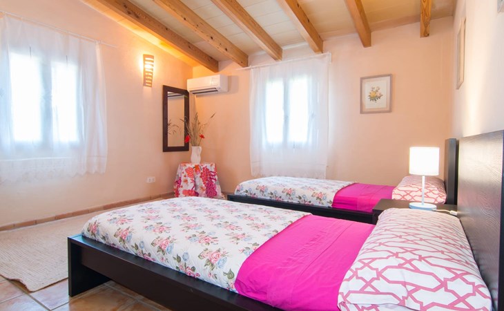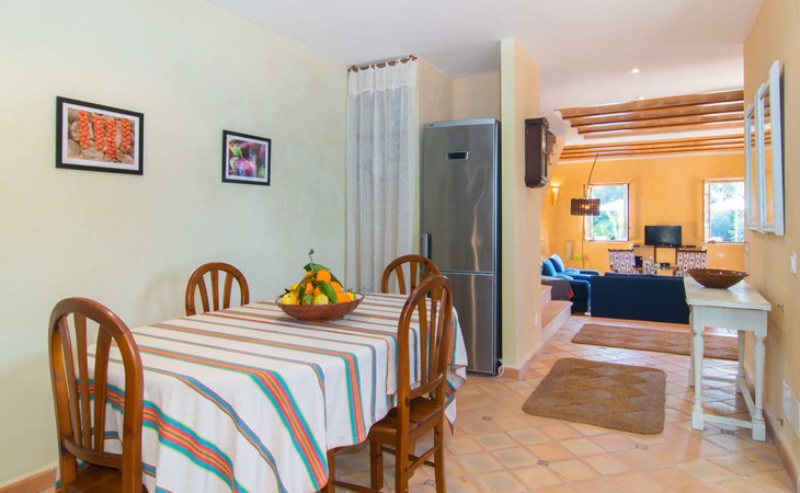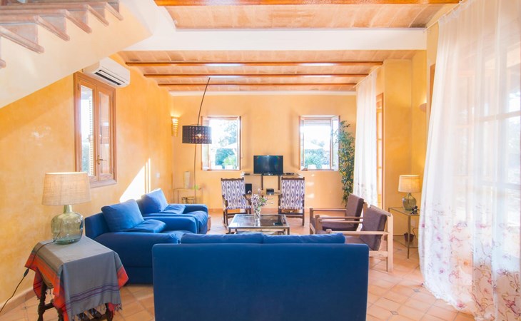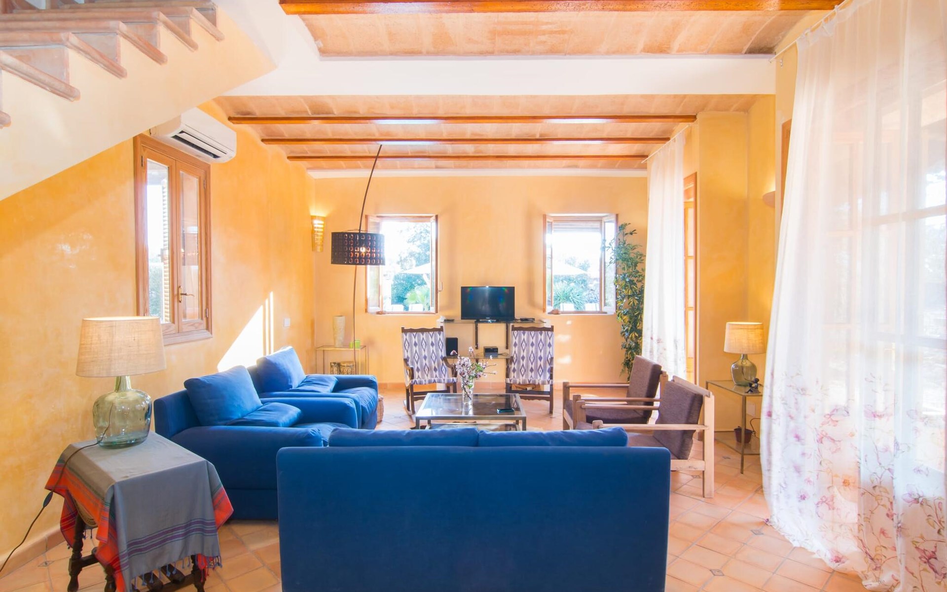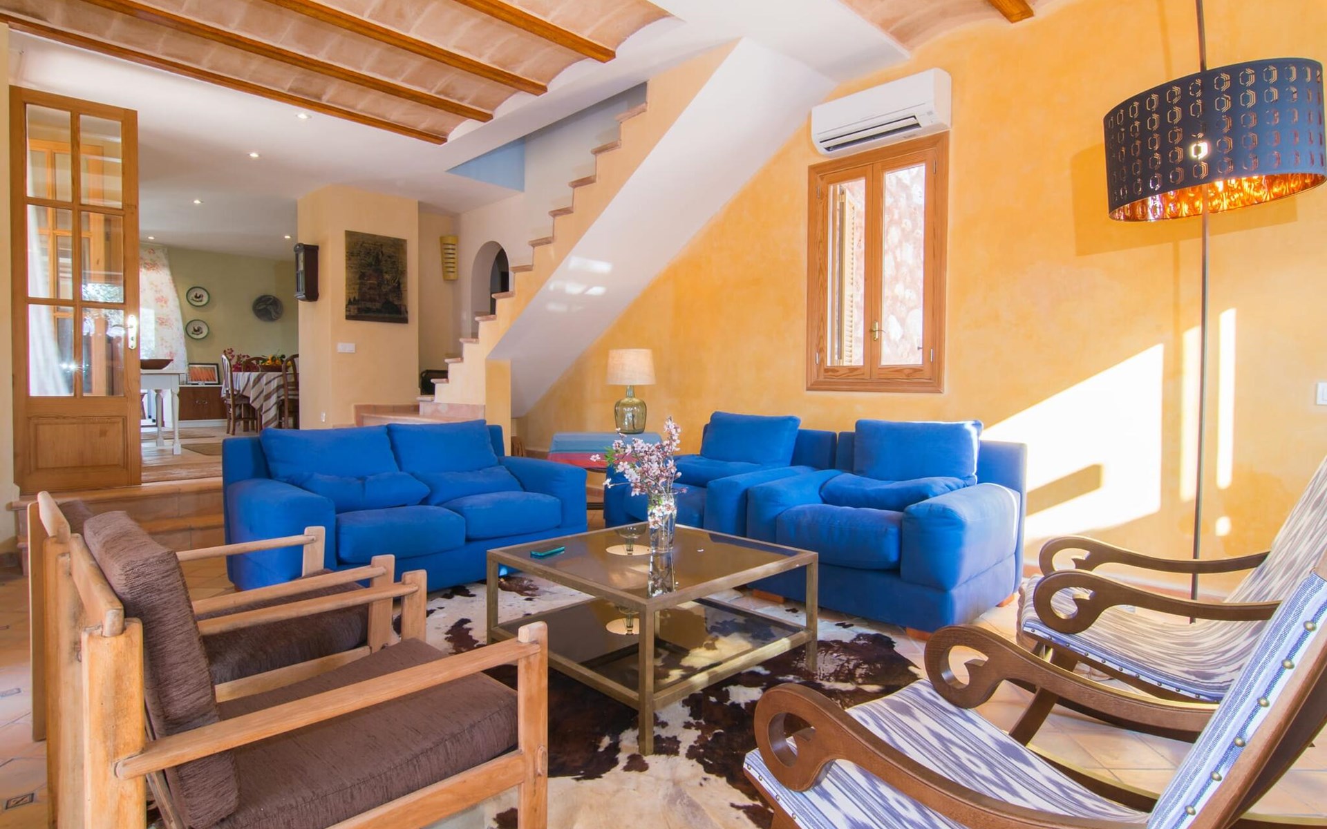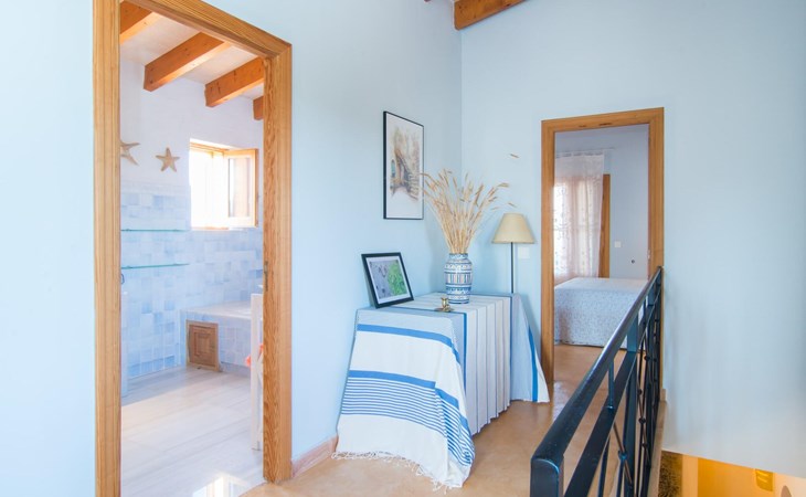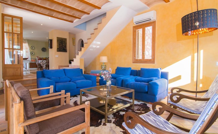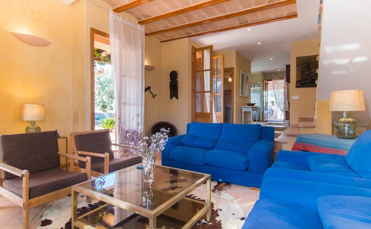 Net als een vrucht die doet wat de buitenkant belooft, stelt de binnenkant ook niet teleur: Mallorcaans, nuchter, zonnig en fleurig. Een frisse bries lijkt door het huis te waaien en luchtige gordijnen geven de ruimte een lichte touch. De ruime, open woon-, kook- en eetruimte wordt omringd door gezellige, felblauwe banken die je uitnodigen om je onder te dompelen in een filmavondje. Natuurlijk kun je ook wegdromen in de aangenaam eenvoudige slaapkamers met massief houten bedden; de slaapkamers zijn ingericht met een keuze uit donkerder of lichter gekleurd meubilair en een van de slaapkamers boven heeft directe toegang tot een beschut balkon met prachtig uitzicht over de bomen naar de bergen daarachter. Als je hier slaapt, kun je de deur open laten. De badkamers, een op de begane grond en een op de bovenverdieping, worden gedeeld door twee slaapkamers. Het enige dat nog genoemd moet worden is de moderne, goed uitgeruste keuken met een eigen plekje in de zon, aan de muren waarvan knapperige, verse groenten van de wekelijkse markt in Campos smakelijk hangen: een paradijs voor vegetariërs en liefhebbers van rauwkost, ware het niet dat de fantastische gemetselde barbecue voor de deur er om schreeuwt gebruikt te worden. Het zou zonde zijn om niet... ¡Buen provencho!