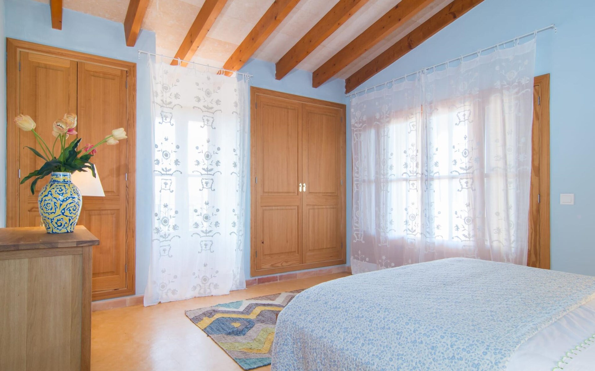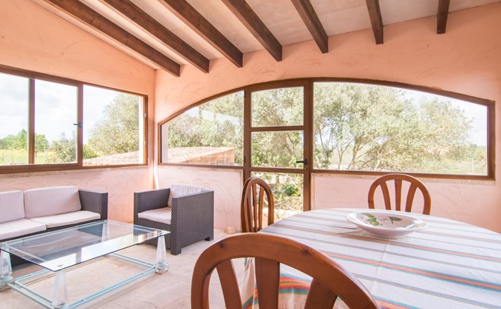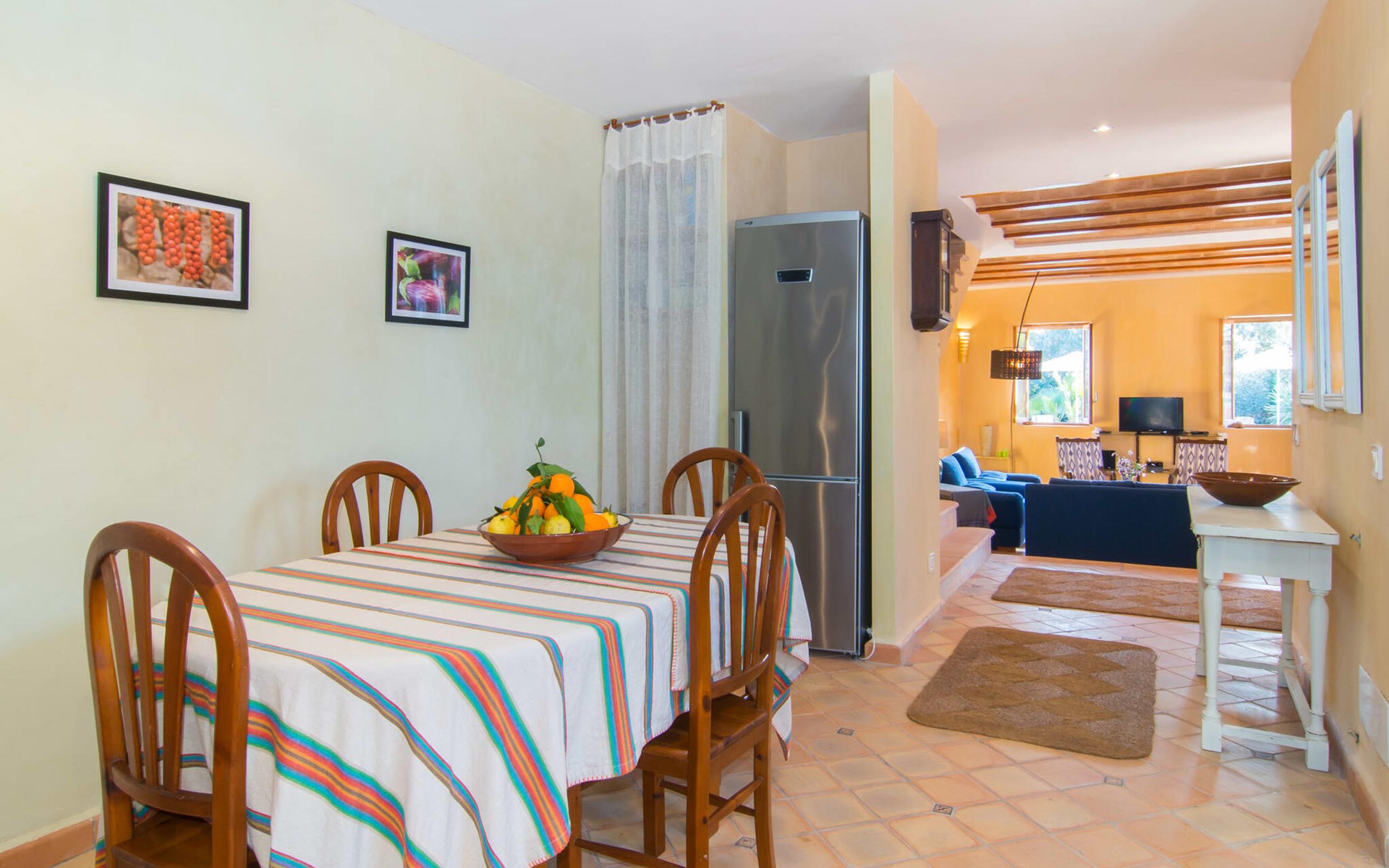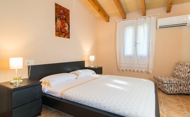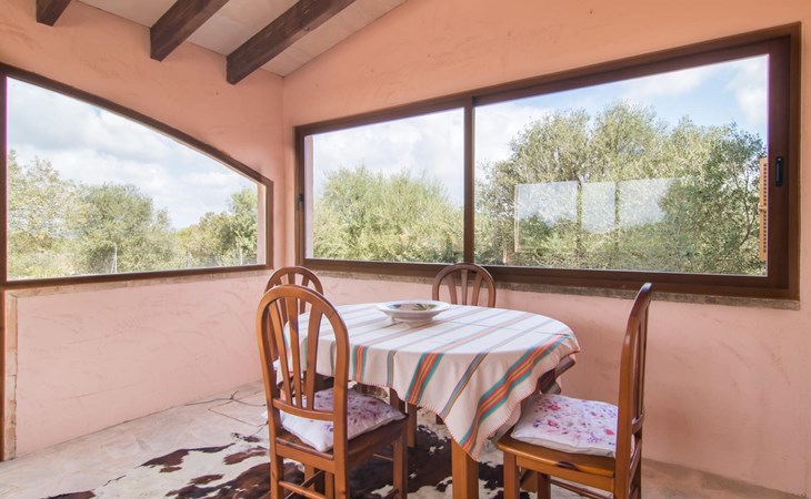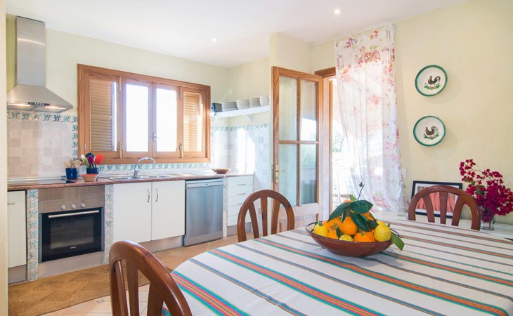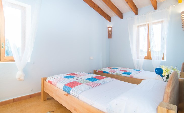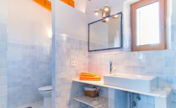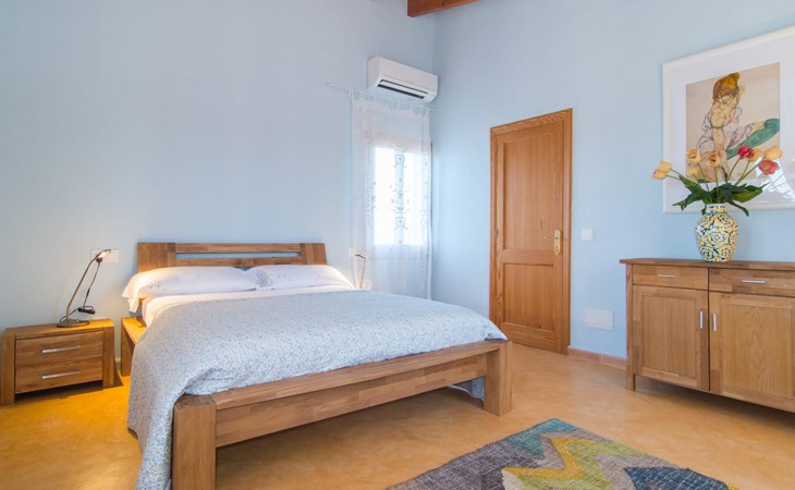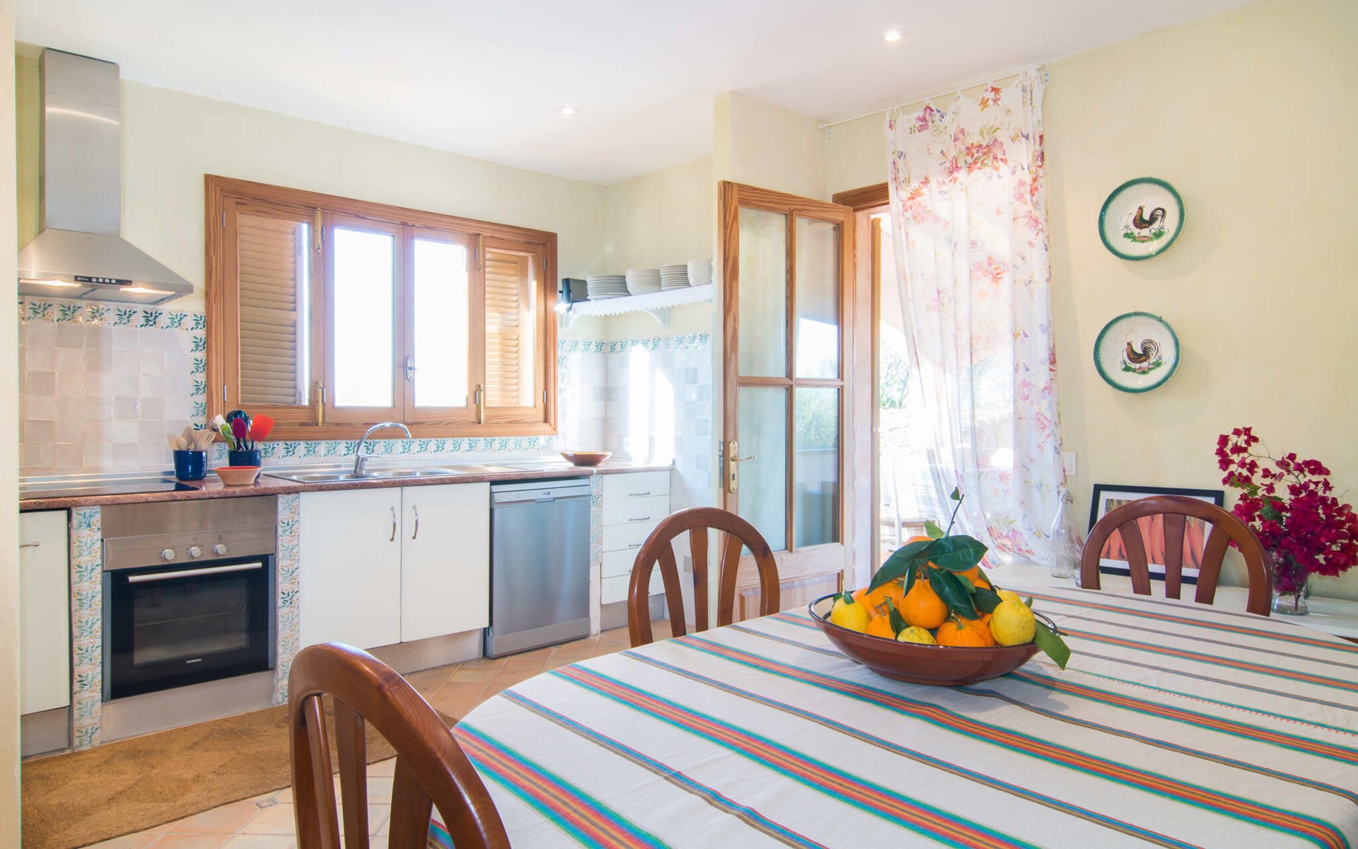 Net als een vrucht die doet wat de buitenkant belooft, stelt de binnenkant ook niet teleur: Mallorcaans, nuchter, zonnig en fleurig. Een frisse bries lijkt door het huis te waaien en luchtige gordijnen geven de ruimte een lichte touch. De ruime, open woon-, kook- en eetruimte wordt omringd door gezellige, felblauwe banken die je uitnodigen om je onder te dompelen in een filmavondje. Natuurlijk kun je ook wegdromen in de aangenaam eenvoudige slaapkamers met massief houten bedden; de slaapkamers zijn ingericht met een keuze uit donkerder of lichter gekleurd meubilair en een van de slaapkamers boven heeft directe toegang tot een beschut balkon met prachtig uitzicht over de bomen naar de bergen daarachter. Als je hier slaapt, kun je de deur open laten. De badkamers, een op de begane grond en een op de bovenverdieping, worden gedeeld door twee slaapkamers. Het enige dat nog genoemd moet worden is de moderne, goed uitgeruste keuken met een eigen plekje in de zon, aan de muren waarvan knapperige, verse groenten van de wekelijkse markt in Campos smakelijk hangen: een paradijs voor vegetariërs en liefhebbers van rauwkost, ware het niet dat de fantastische gemetselde barbecue voor de deur er om schreeuwt gebruikt te worden. Het zou zonde zijn om niet... ¡Buen provencho!