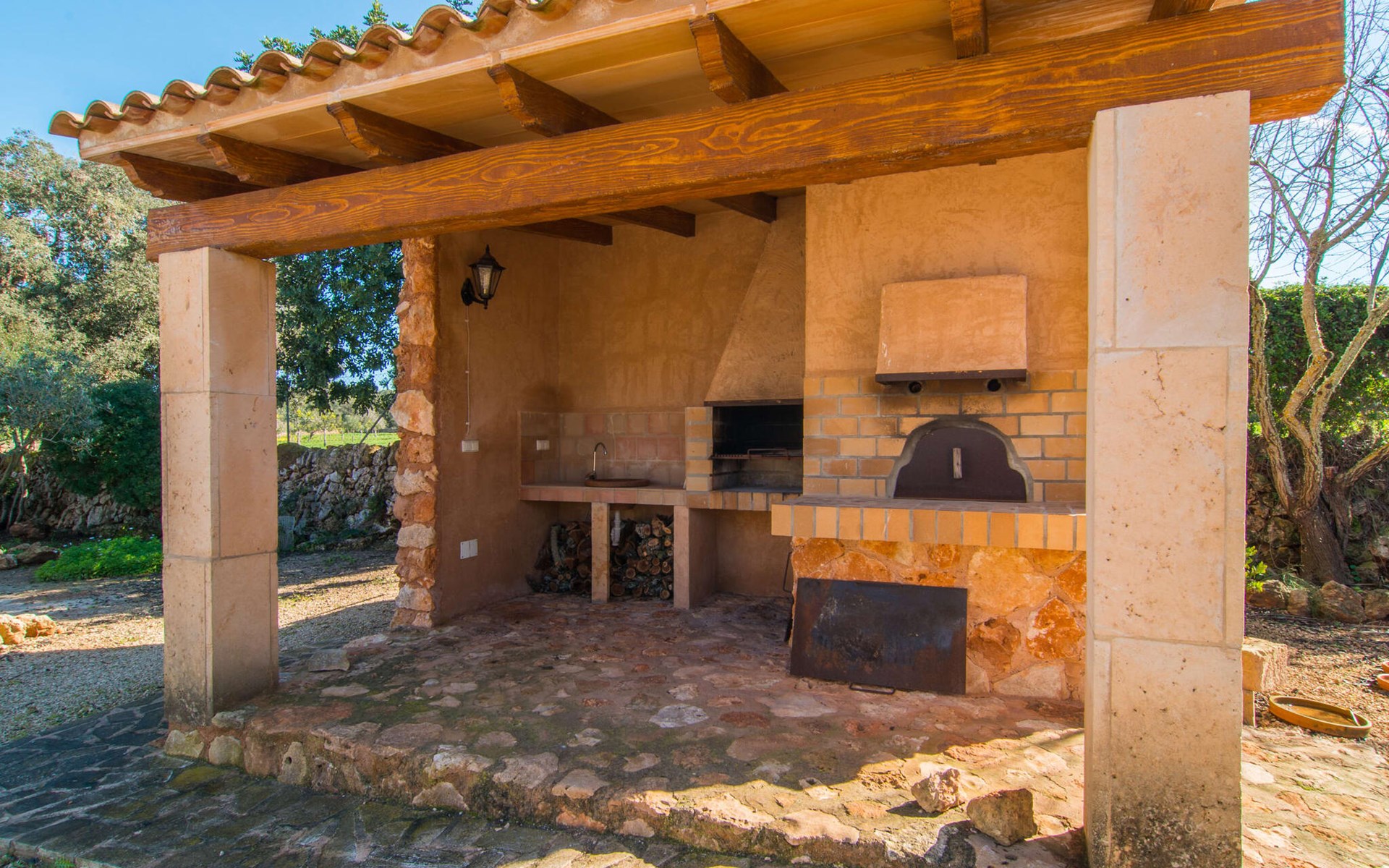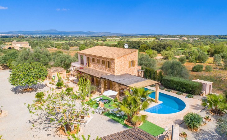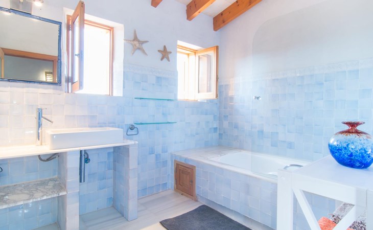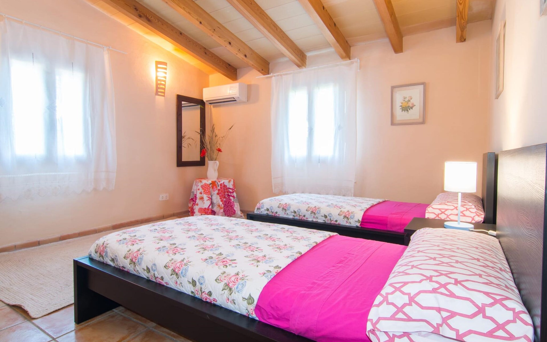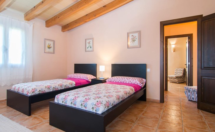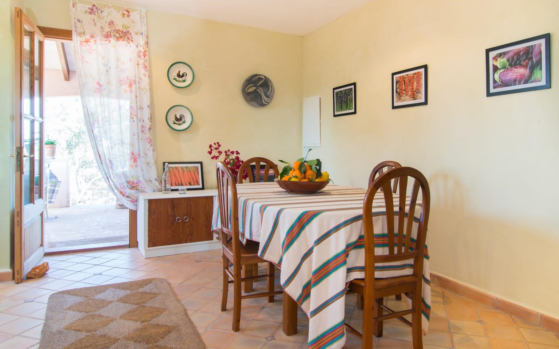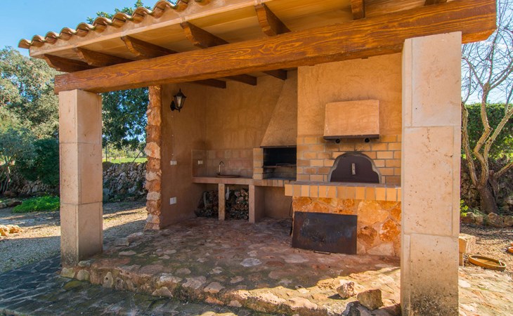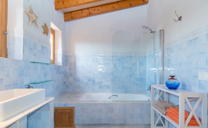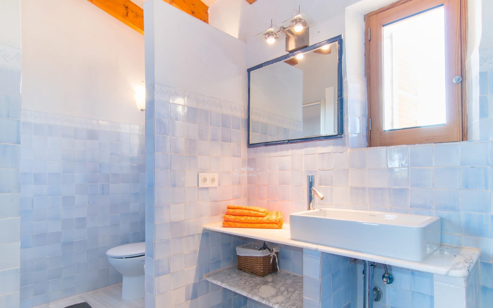 Net als een vrucht die doet wat de buitenkant belooft, stelt de binnenkant ook niet teleur: Mallorcaans, nuchter, zonnig en fleurig. Een frisse bries lijkt door het huis te waaien en luchtige gordijnen geven de ruimte een lichte touch. De ruime, open woon-, kook- en eetruimte wordt omringd door gezellige, felblauwe banken die je uitnodigen om je onder te dompelen in een filmavondje. Natuurlijk kun je ook wegdromen in de aangenaam eenvoudige slaapkamers met massief houten bedden; de slaapkamers zijn ingericht met een keuze uit donkerder of lichter gekleurd meubilair en een van de slaapkamers boven heeft directe toegang tot een beschut balkon met prachtig uitzicht over de bomen naar de bergen daarachter. Als je hier slaapt, kun je de deur open laten. De badkamers, een op de begane grond en een op de bovenverdieping, worden gedeeld door twee slaapkamers. Het enige dat nog genoemd moet worden is de moderne, goed uitgeruste keuken met een eigen plekje in de zon, aan de muren waarvan knapperige, verse groenten van de wekelijkse markt in Campos smakelijk hangen: een paradijs voor vegetariërs en liefhebbers van rauwkost, ware het niet dat de fantastische gemetselde barbecue voor de deur er om schreeuwt gebruikt te worden. Het zou zonde zijn om niet... ¡Buen provencho!
