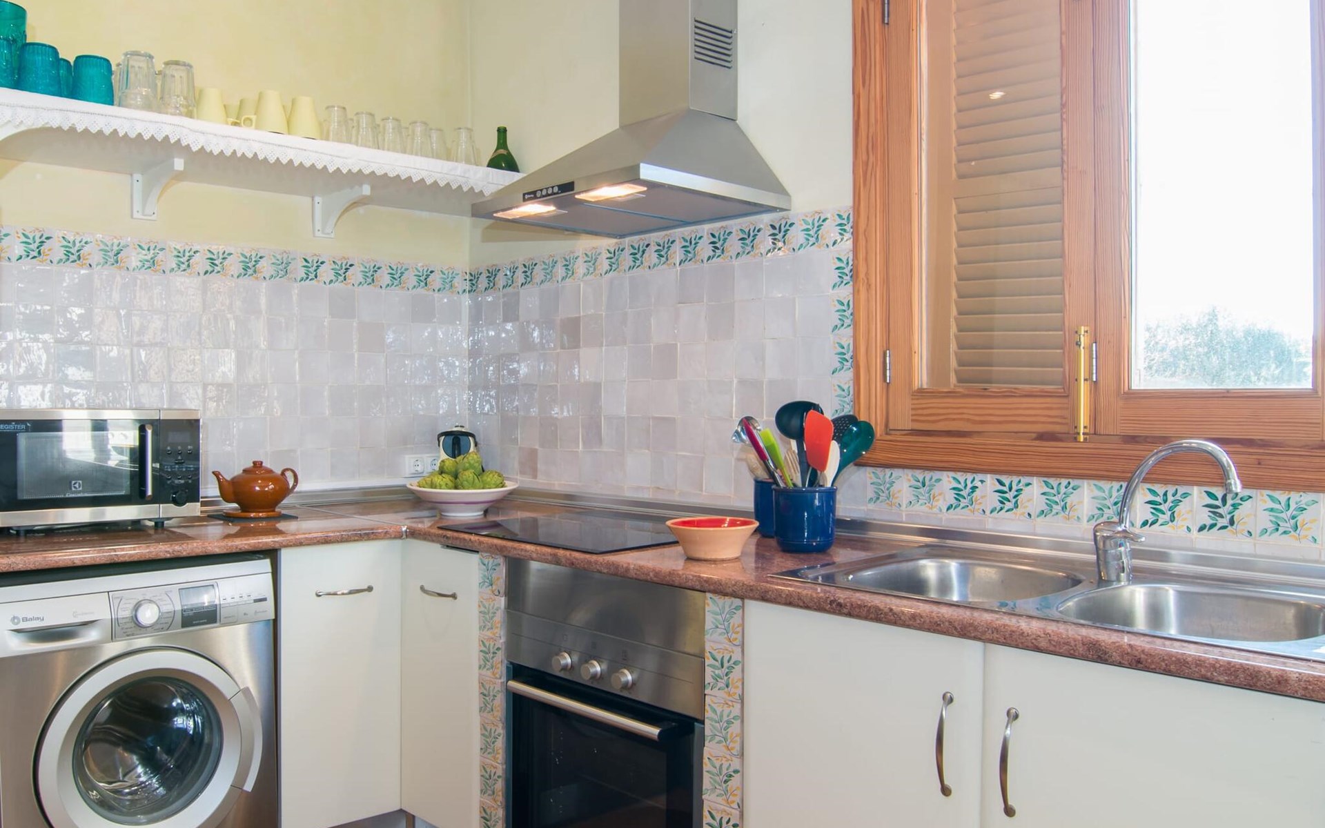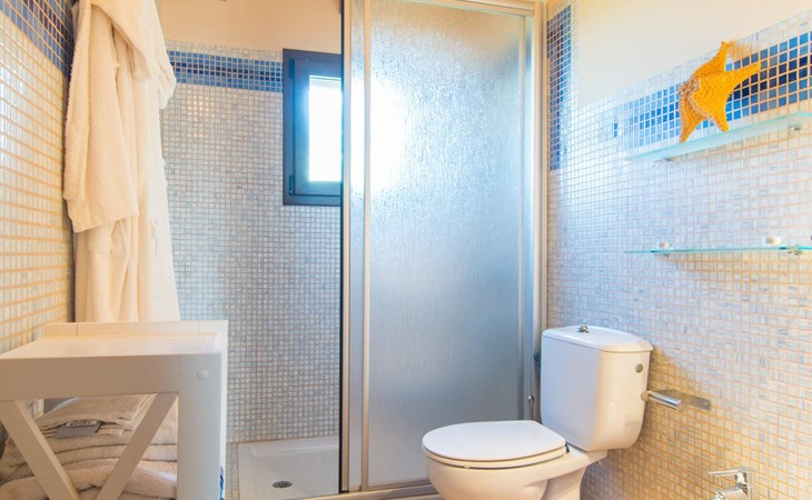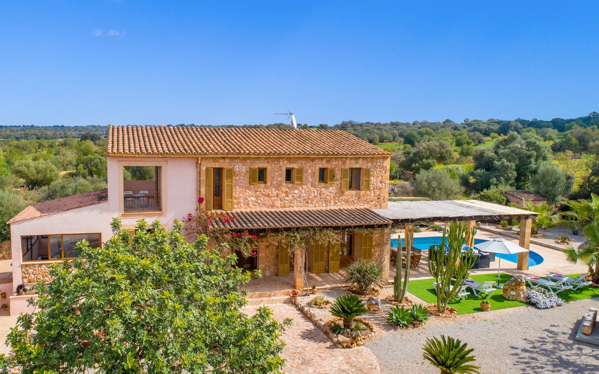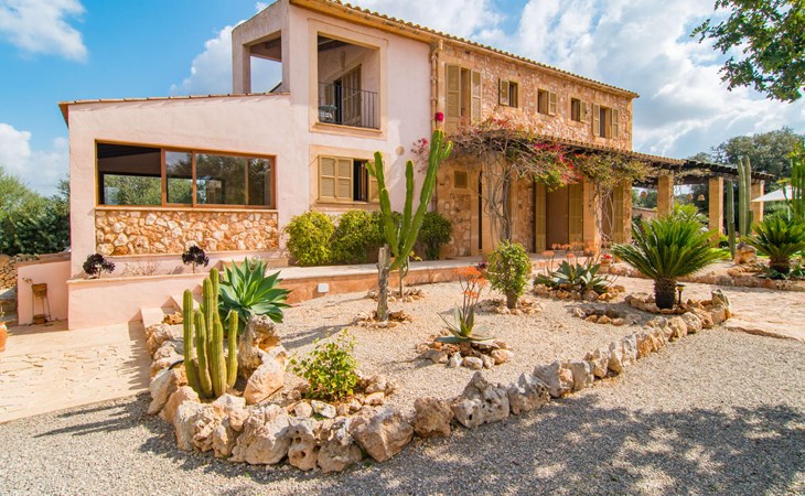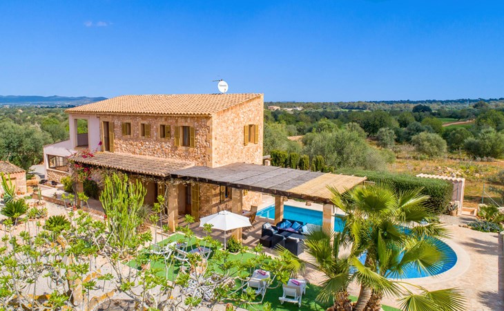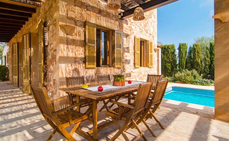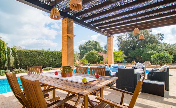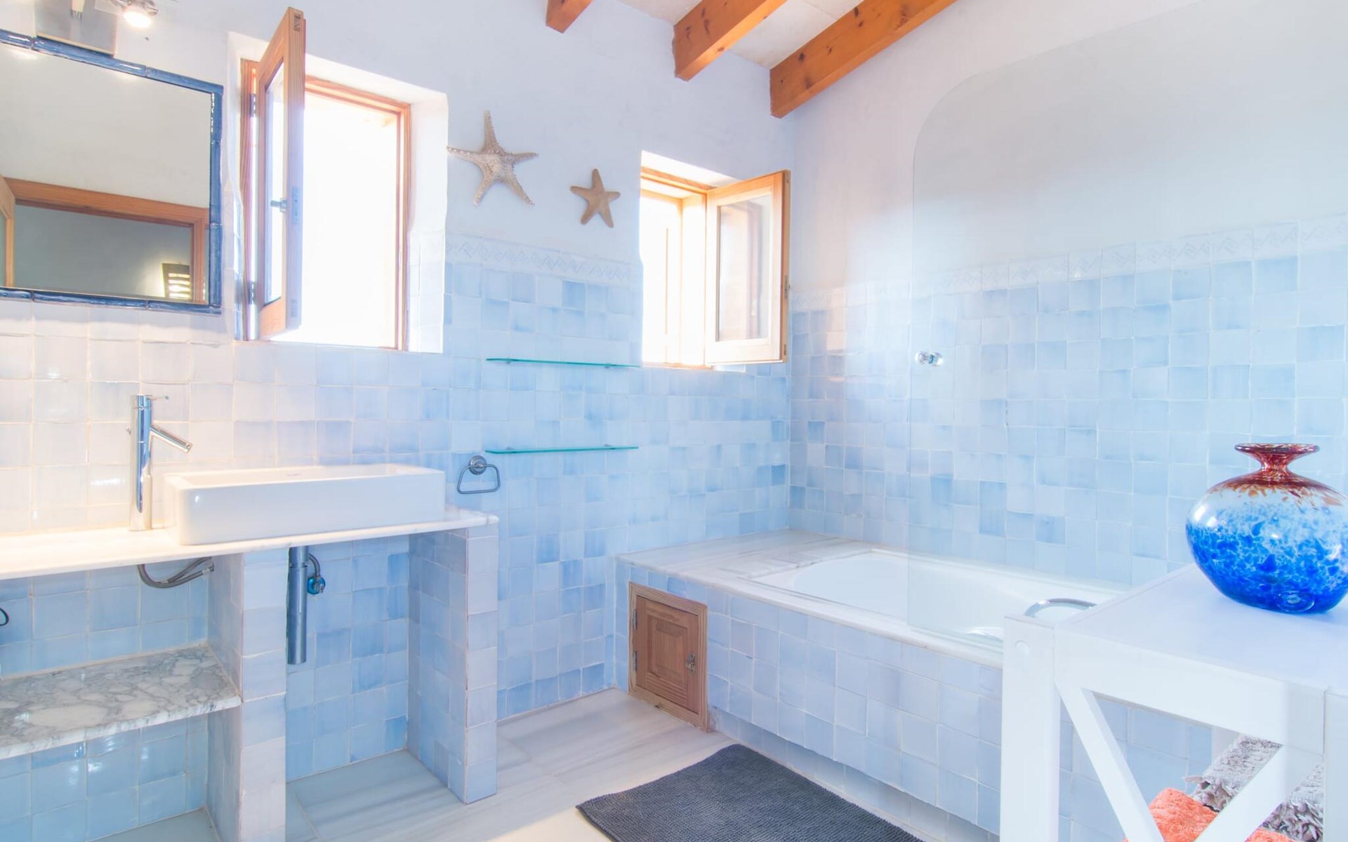 Net als een vrucht die doet wat de buitenkant belooft, stelt de binnenkant ook niet teleur: Mallorcaans, nuchter, zonnig en fleurig. Een frisse bries lijkt door het huis te waaien en luchtige gordijnen geven de ruimte een lichte touch. De ruime, open woon-, kook- en eetruimte wordt omringd door gezellige, felblauwe banken die je uitnodigen om je onder te dompelen in een filmavondje. Natuurlijk kun je ook wegdromen in de aangenaam eenvoudige slaapkamers met massief houten bedden; de slaapkamers zijn ingericht met een keuze uit donkerder of lichter gekleurd meubilair en een van de slaapkamers boven heeft directe toegang tot een beschut balkon met prachtig uitzicht over de bomen naar de bergen daarachter. Als je hier slaapt, kun je de deur open laten. De badkamers, een op de begane grond en een op de bovenverdieping, worden gedeeld door twee slaapkamers. Het enige dat nog genoemd moet worden is de moderne, goed uitgeruste keuken met een eigen plekje in de zon, aan de muren waarvan knapperige, verse groenten van de wekelijkse markt in Campos smakelijk hangen: een paradijs voor vegetariërs en liefhebbers van rauwkost, ware het niet dat de fantastische gemetselde barbecue voor de deur er om schreeuwt gebruikt te worden. Het zou zonde zijn om niet... ¡Buen provencho!