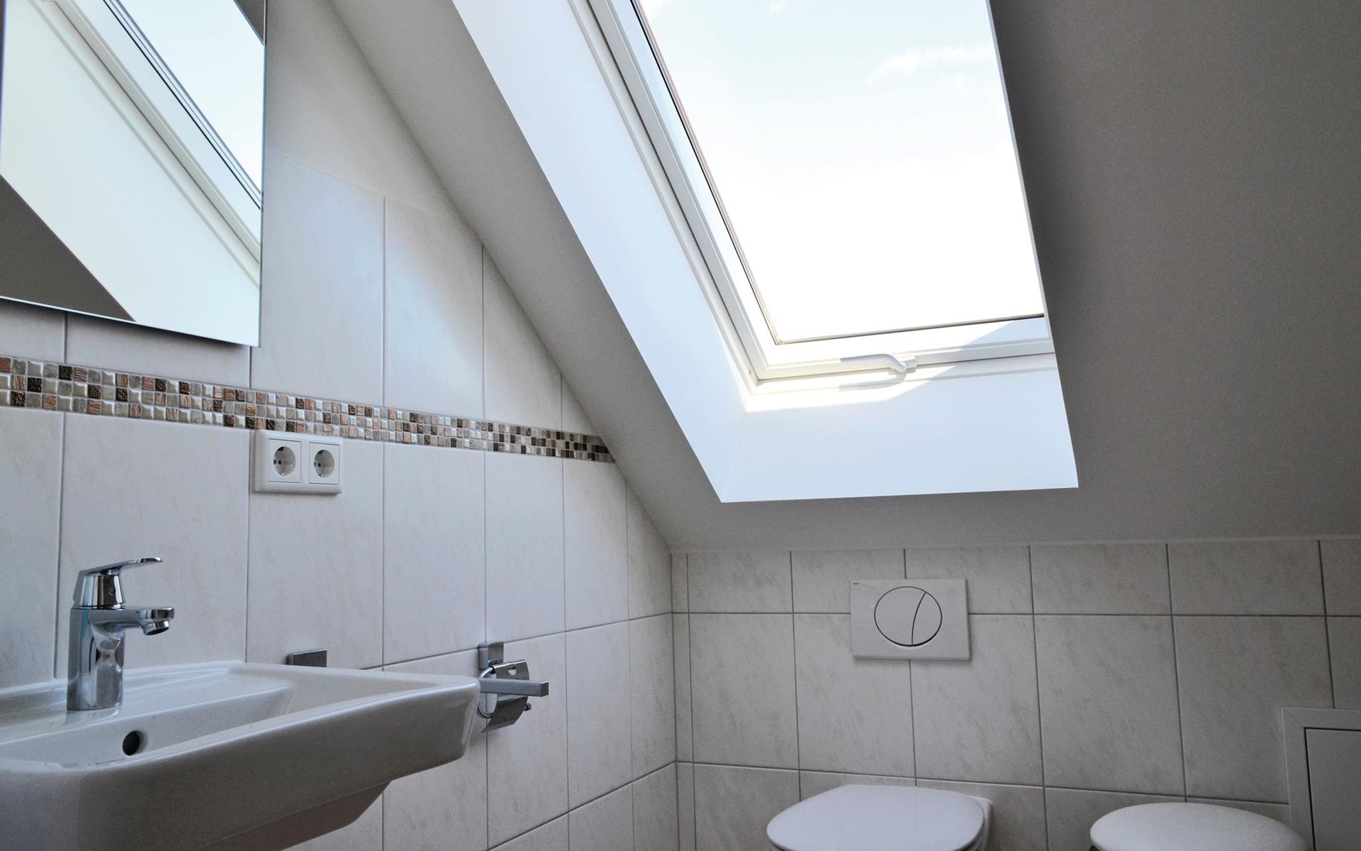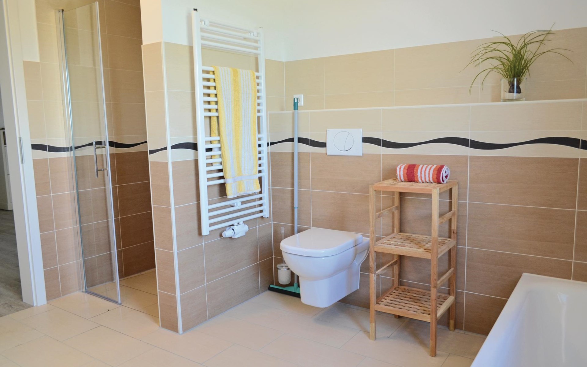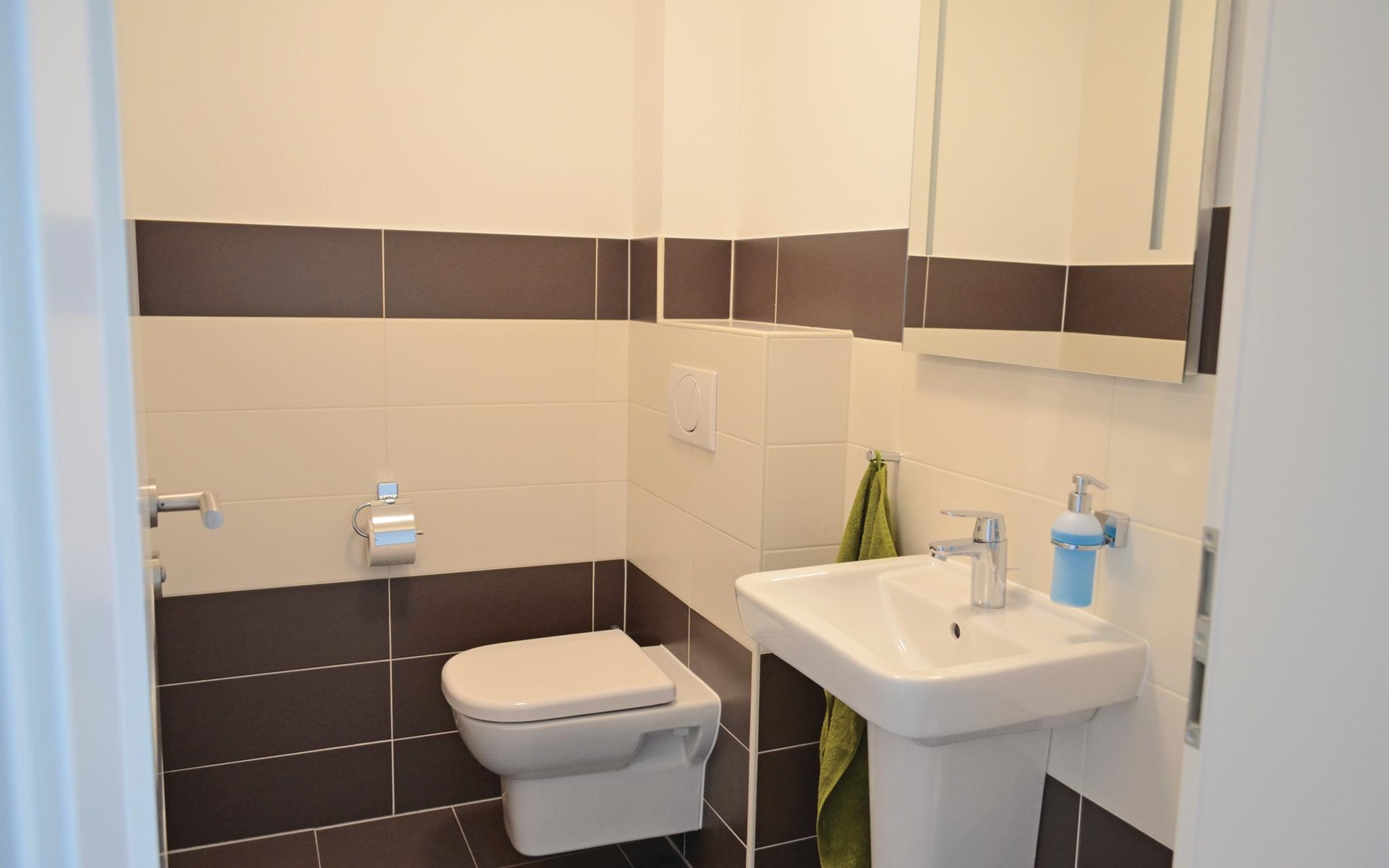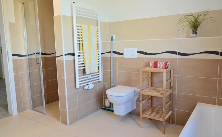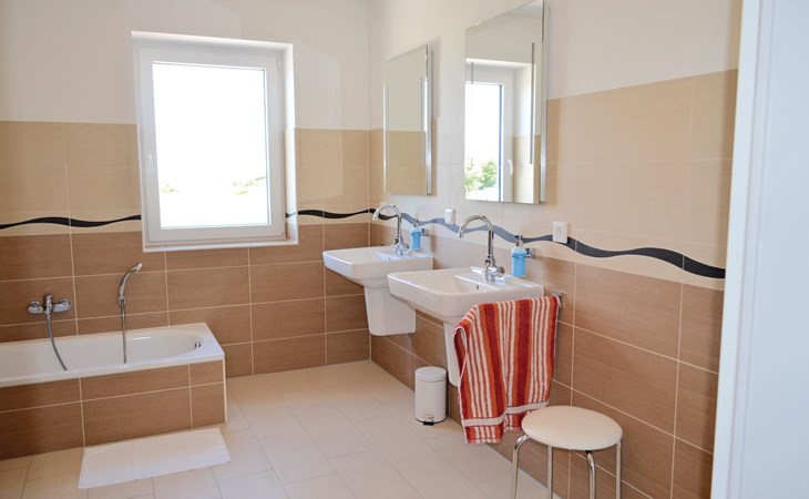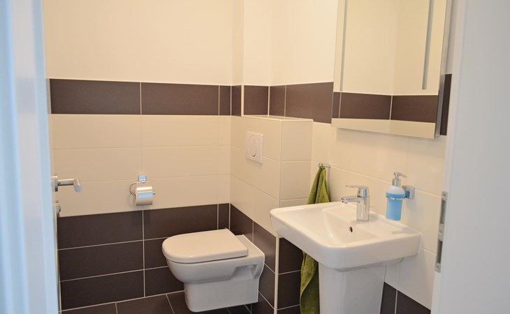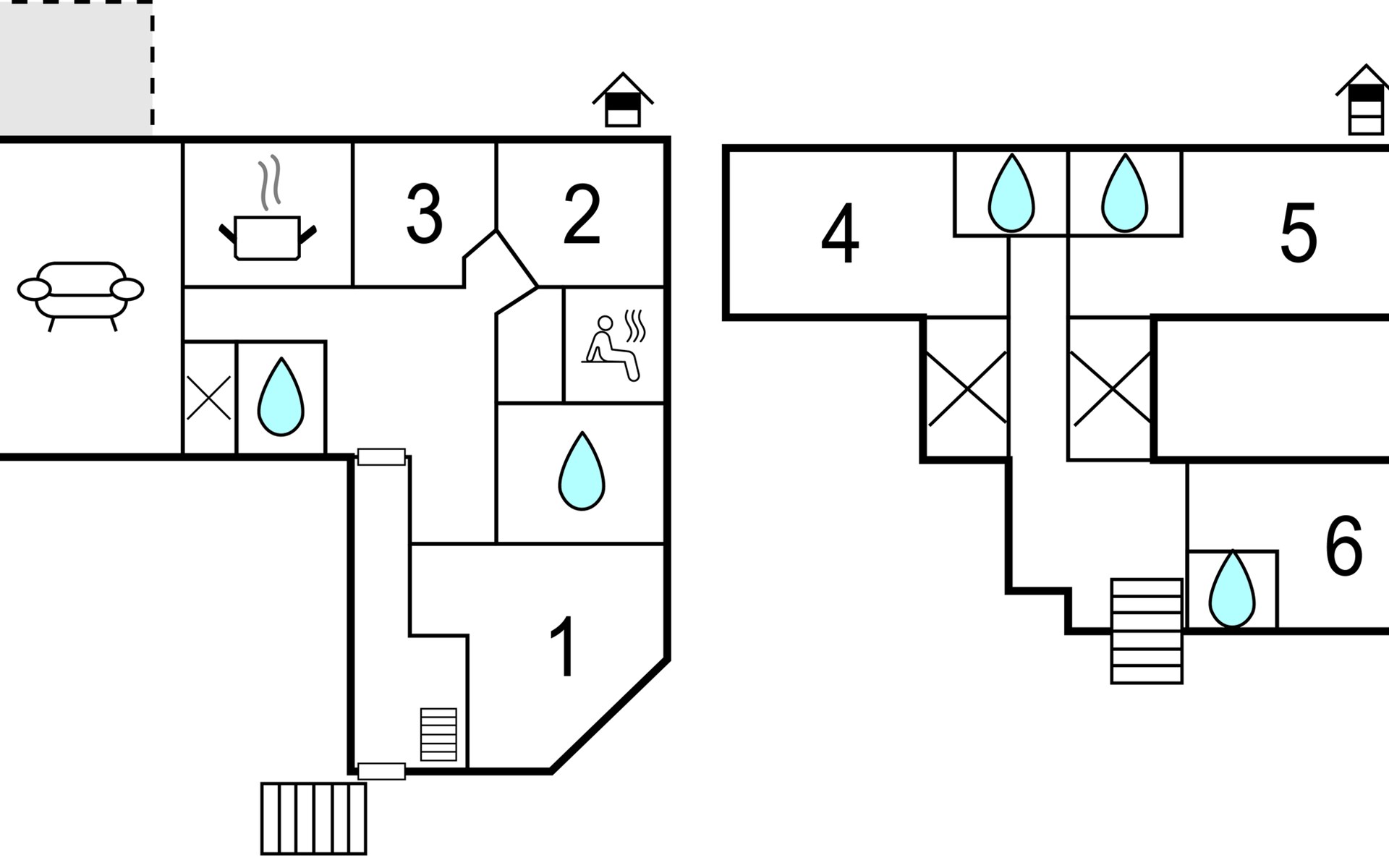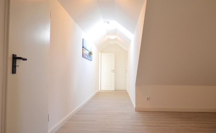 De 6 slaapkamers zijn verdeeld over twee verdiepingen. De drie grote slaapkamers op de aparte bovenverdieping (bereikbaar via een trap vanuit de gemeenschappelijke hal op de 1e verdieping) hebben elk een eigen badkamer die toegankelijk is vanuit de kamer en een kleine kitchenette. Op de eerste verdieping delen de bewoners van de drie slaapkamers daar een bijzonder ruime badkamer met ligbad en XXL-douche; er is ook een apart toilet.