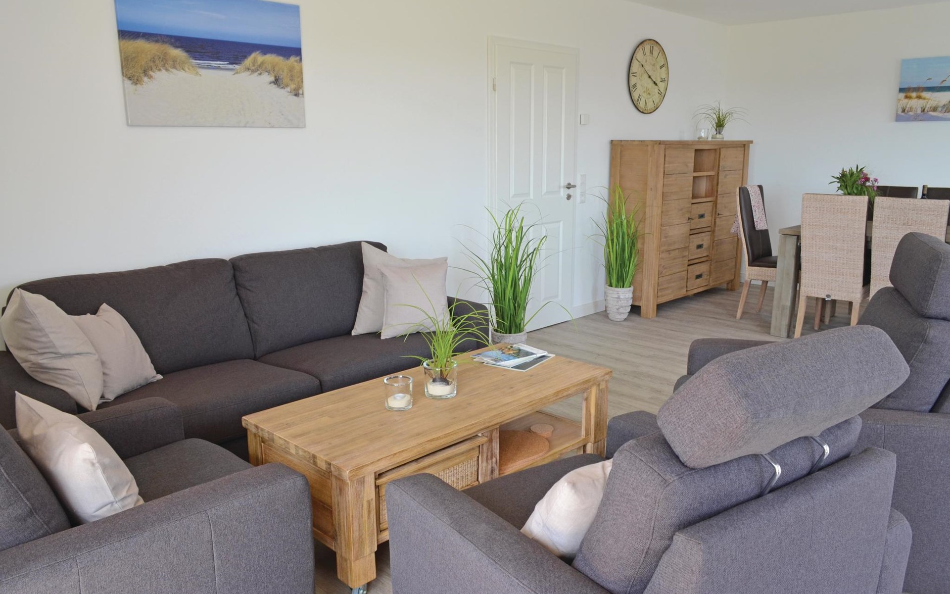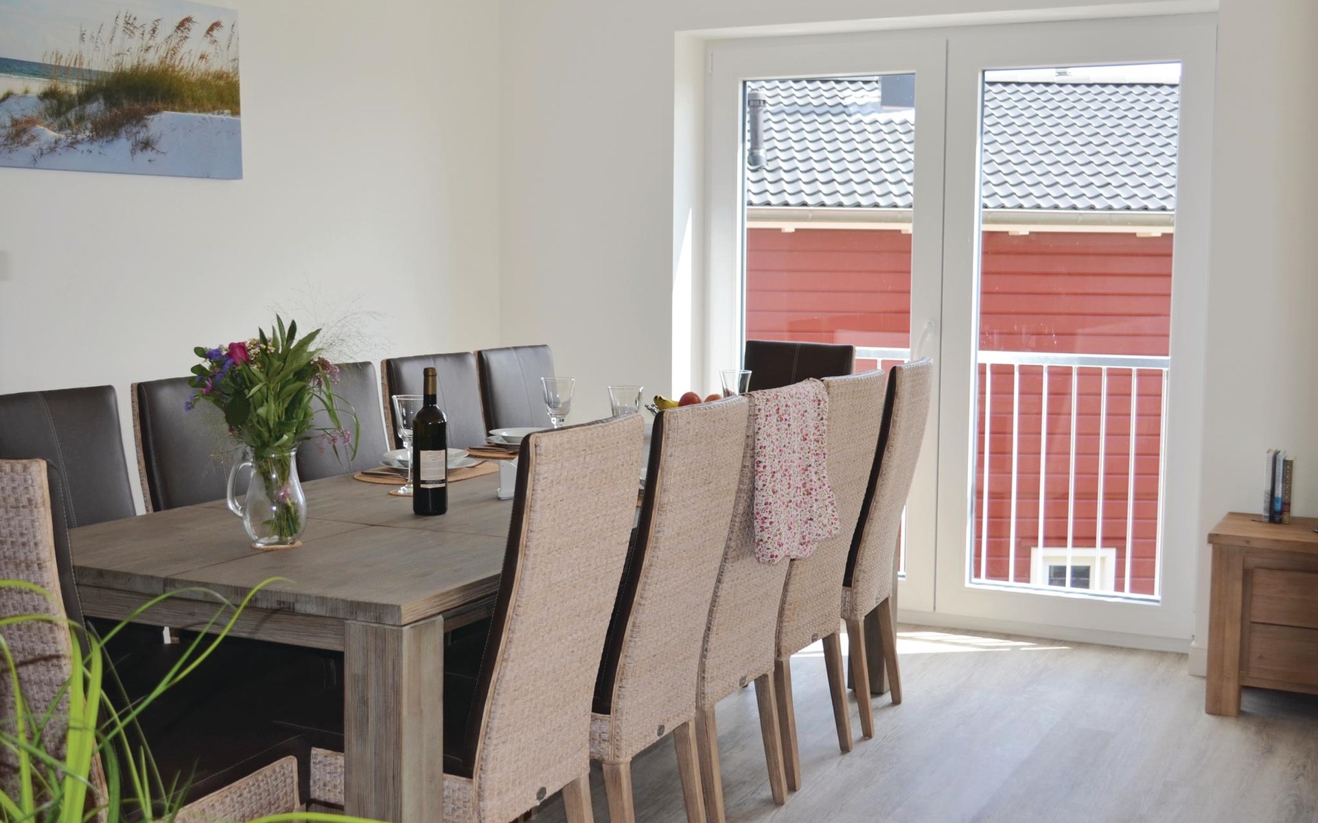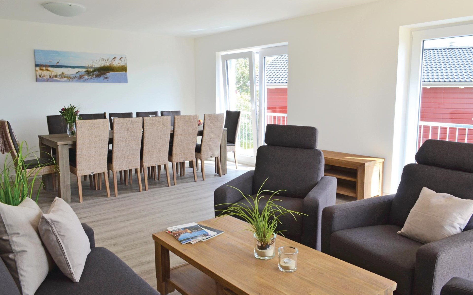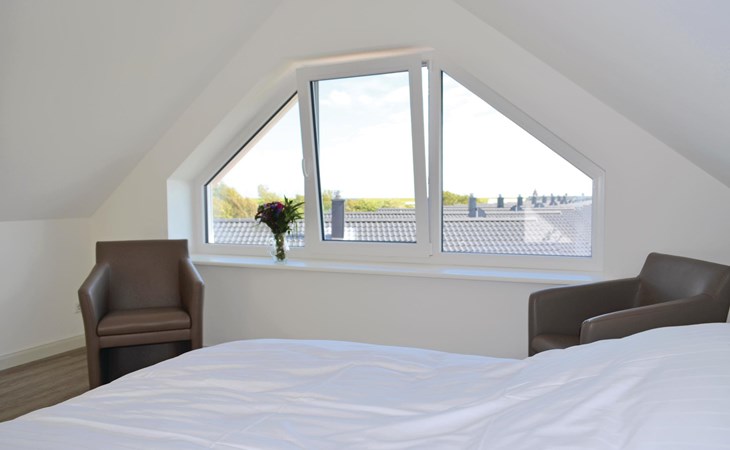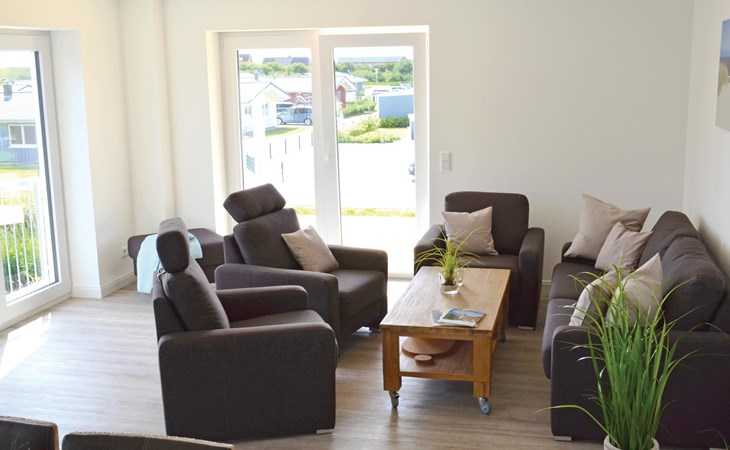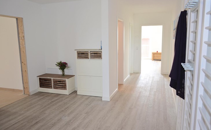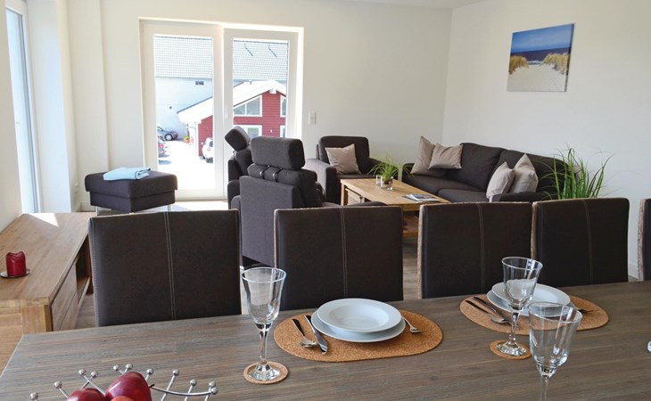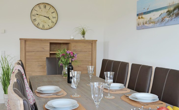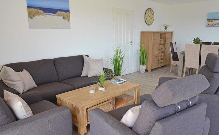 Een ruime woonkamer met een grote eettafel en een gezellige zithoek vormt het hart van deze vakantiewoning. Op het kleine balkon op het westen is plaats voor 4 personen om in een ligstoel van de zon te genieten en van het uitzicht over het landschap tot aan de Noordzee. Er is een grote eettafel voor 12 personen in de woonkamer om gezellig samen te zijn.