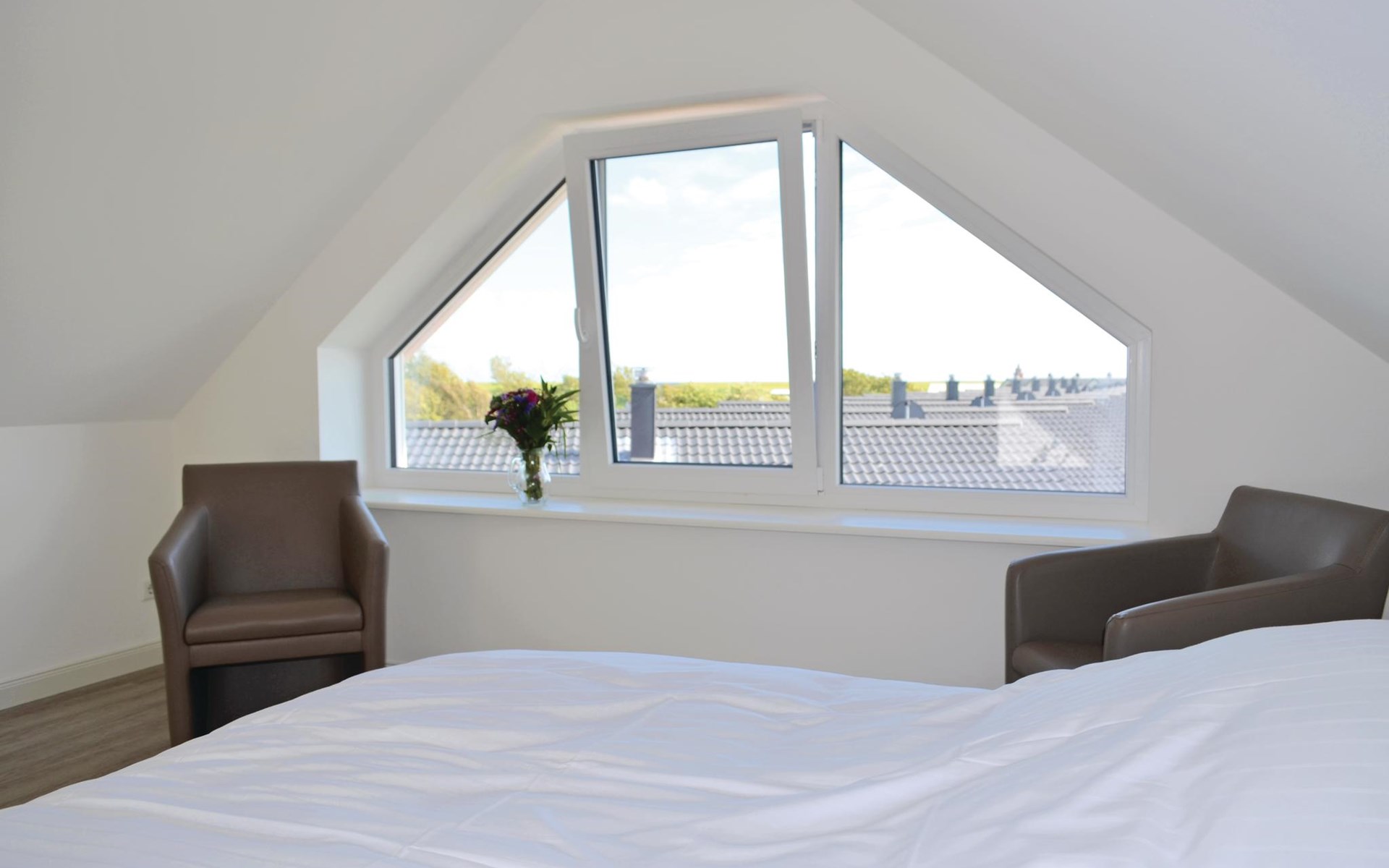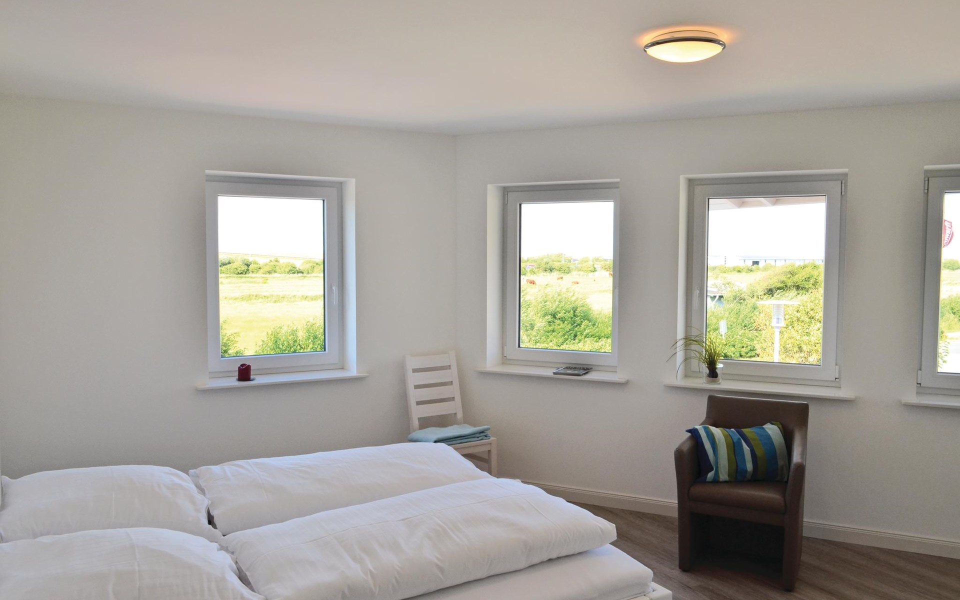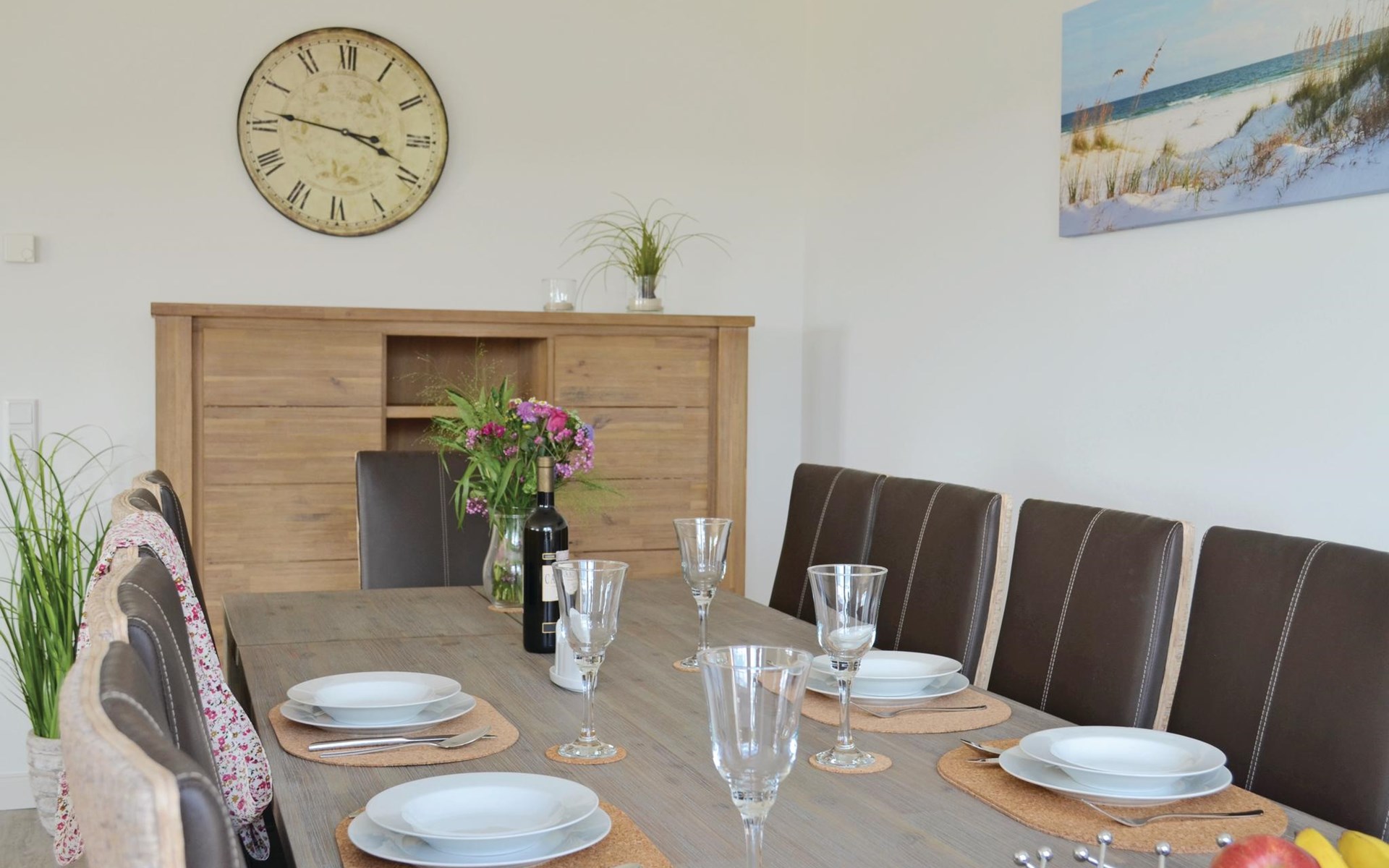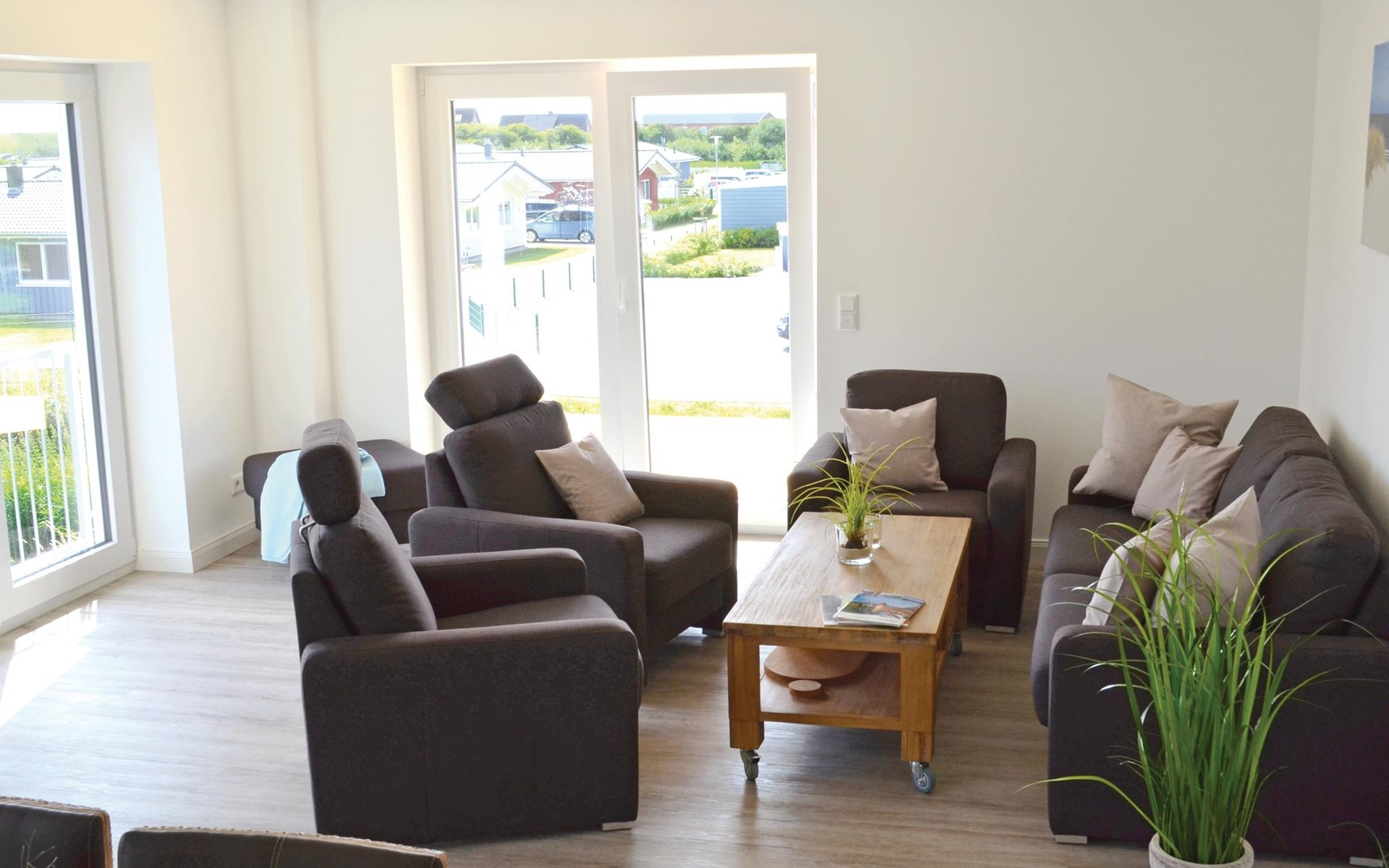 Een ruime woonkamer met een grote eettafel en een gezellige zithoek vormt het hart van deze vakantiewoning. Op het kleine balkon op het westen is plaats voor 4 personen om in een ligstoel van de zon te genieten en van het uitzicht over het landschap tot aan de Noordzee. Er is een grote eettafel voor 12 personen in de woonkamer om gezellig samen te zijn.