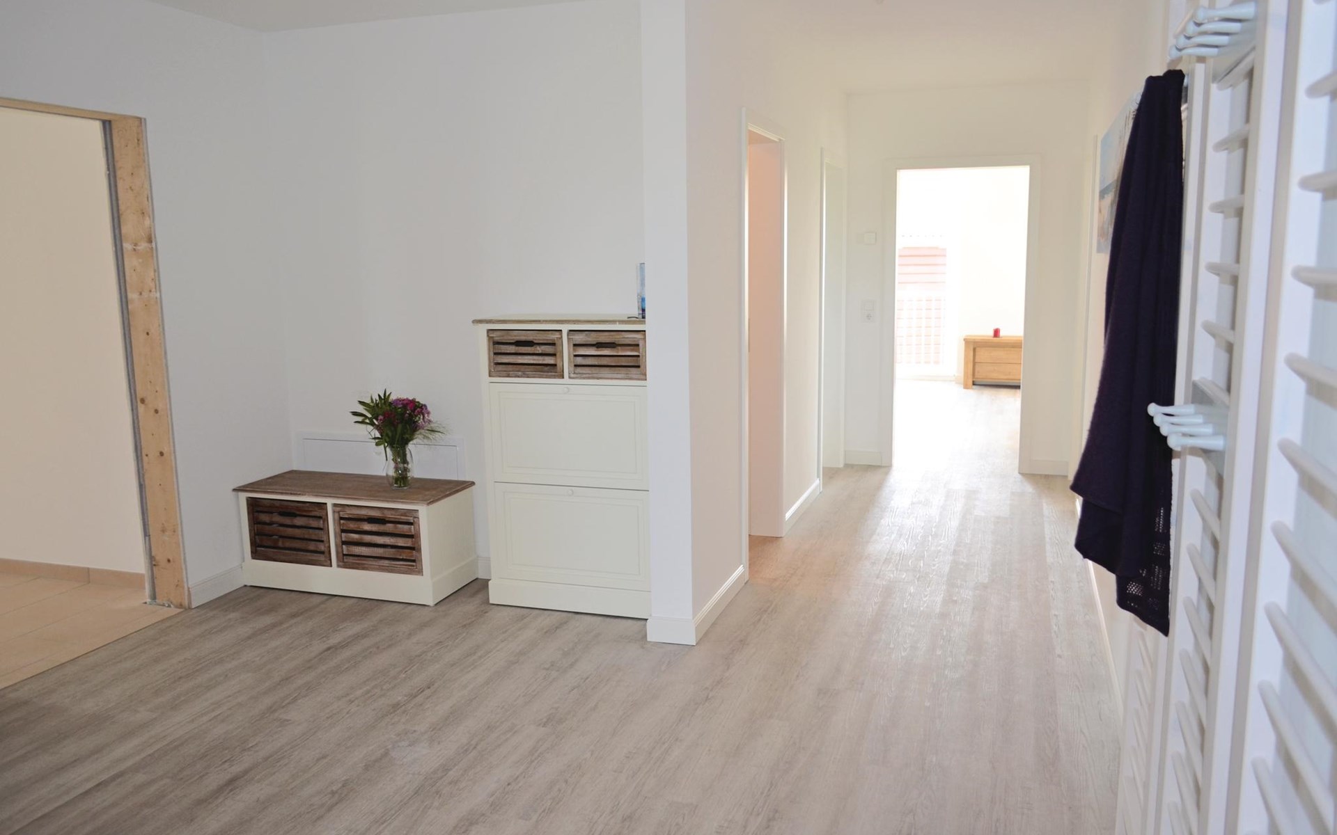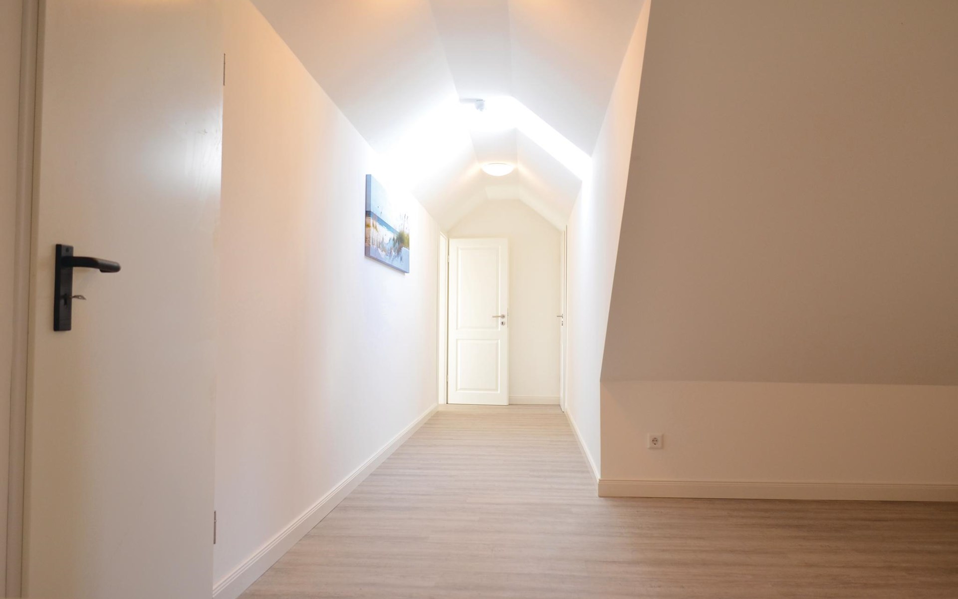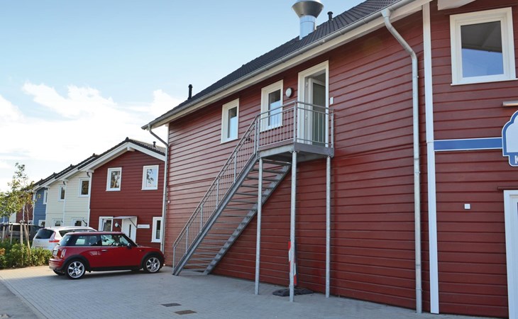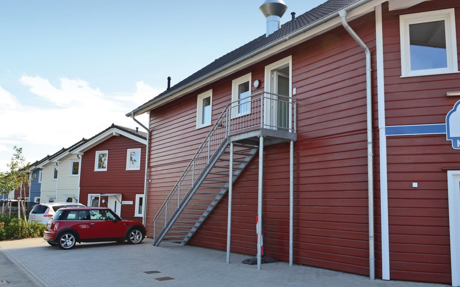 De ingang van de vakantiewoning is bereikbaar via een buitentrap en een gang, die beide ook gebruikt kunnen worden door het personeel van het restaurant, waarvan de personeelskamer zich op de 1e verdieping voor de ingang van de flat op de gang bevindt. Een trap leidt van deze gang naar de aparte slaapkamers op de 2e verdieping.