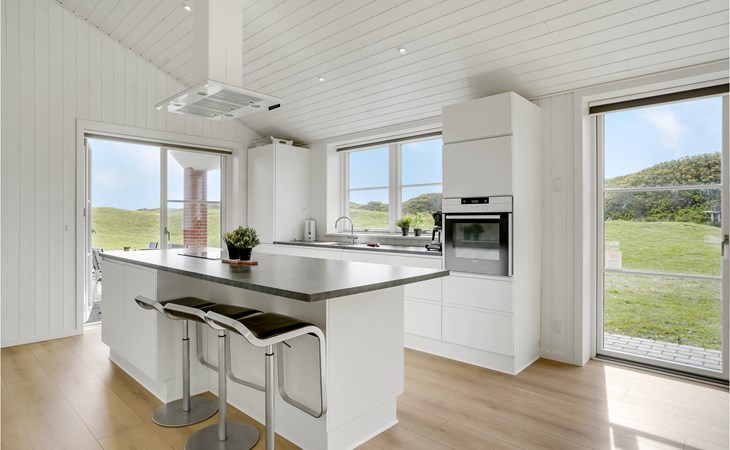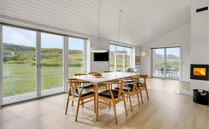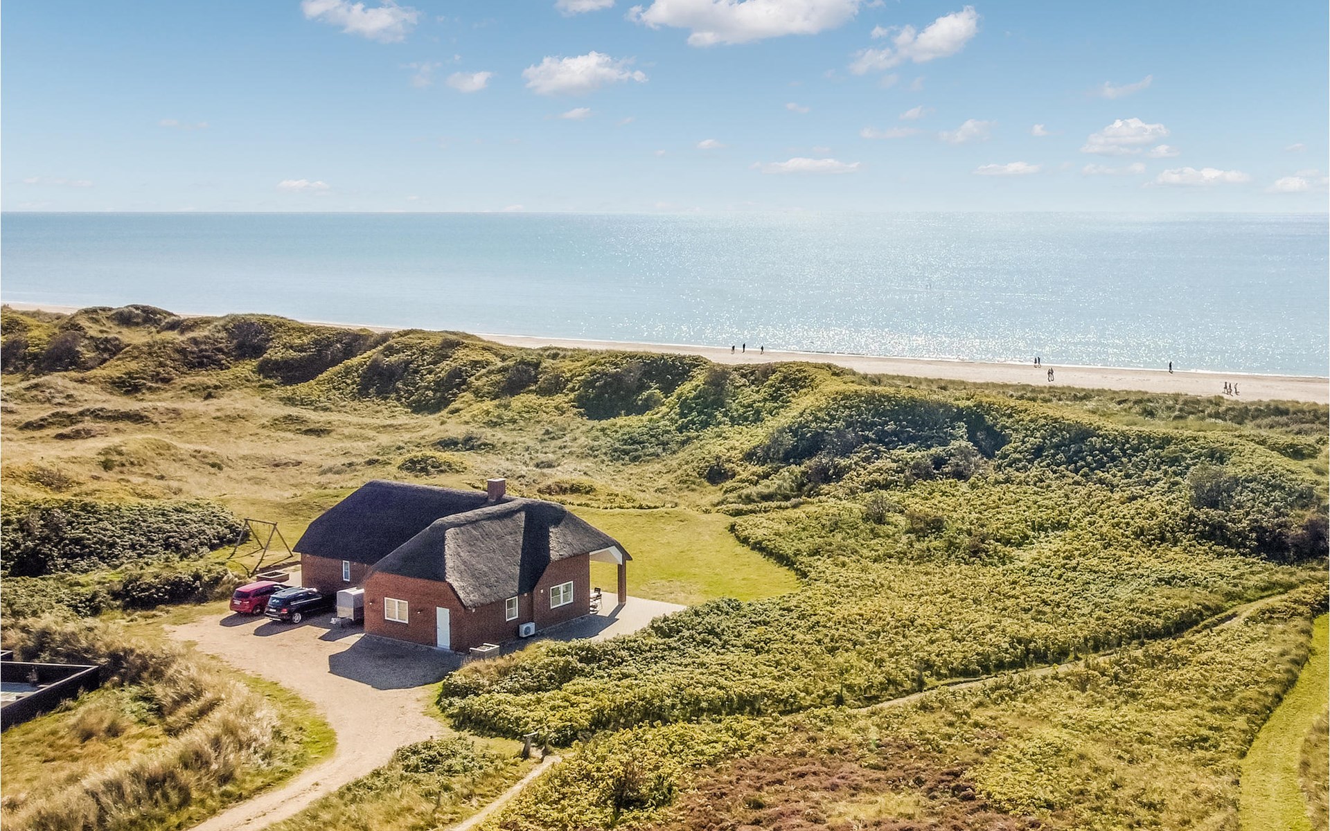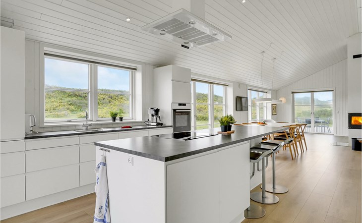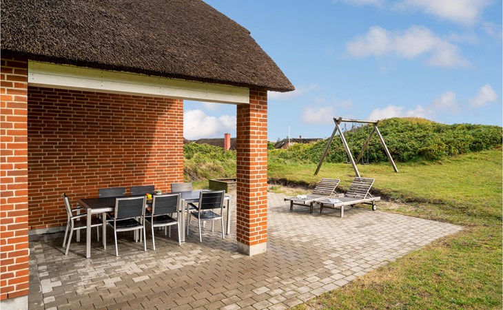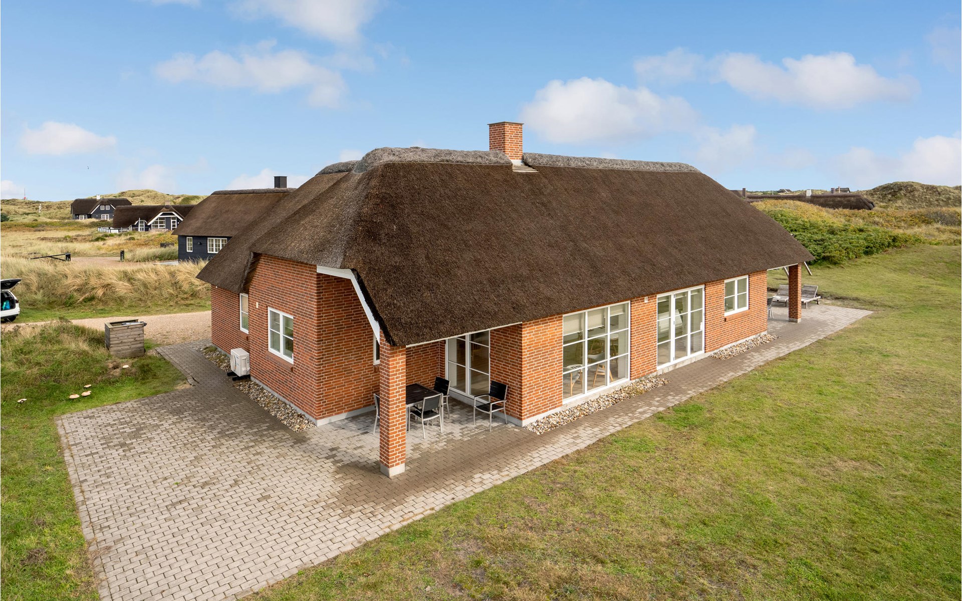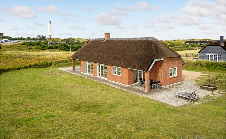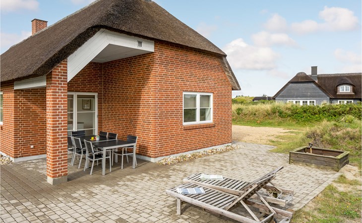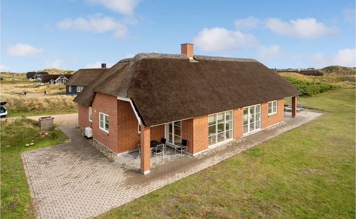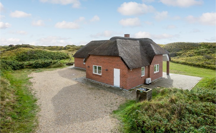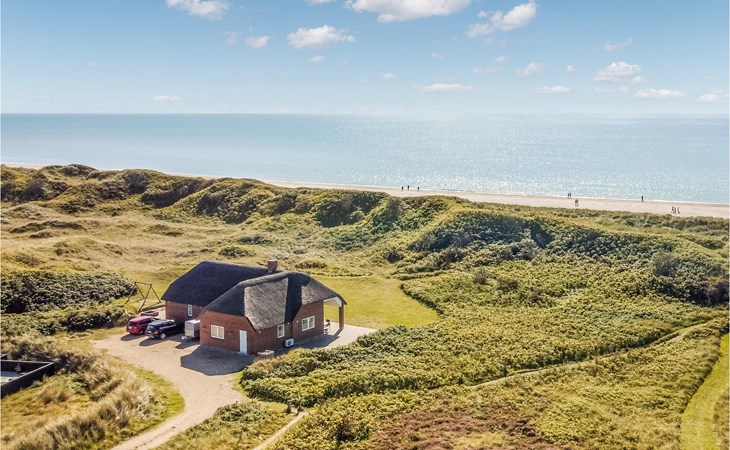 Fantastisch luxe vakantiehuis waarbij door en door aan kwaliteit en design is gedacht. Afgewerkt in het seizoen 2018. Het is een stenen huis met een rieten dak en ligt op een van de mooiste percelen van Blåvand, net achter de duinen en met de Noordzee als buur. Het lichte huis biedt een fantastisch uitzicht op de duinen direct buiten het raam vanuit de woonkamer met open keuken. De open haard zorgt voor de juiste vakantiesfeer met drie glazen zijden. Het huis heeft drie badkamers, waarvan één met directe toegang tot de ene slaapkamer. Buiten heeft u verschillende mooie terrassen tot uw beschikking, zowel open als overdekt.