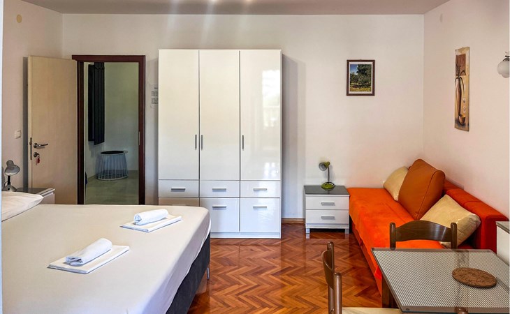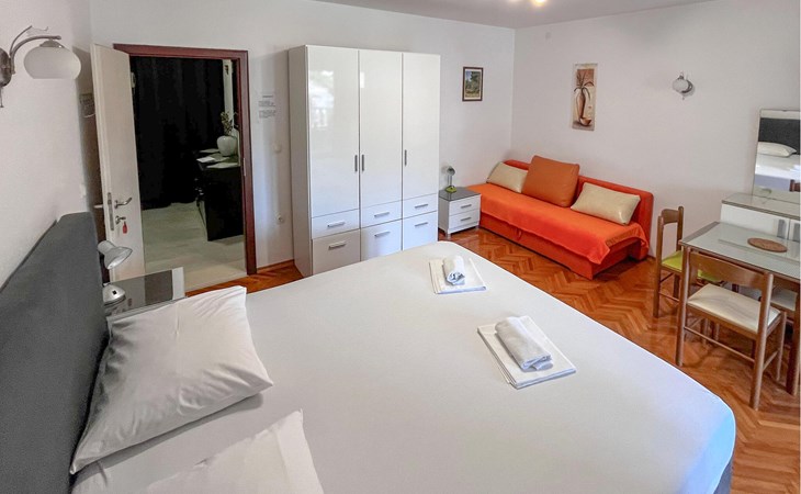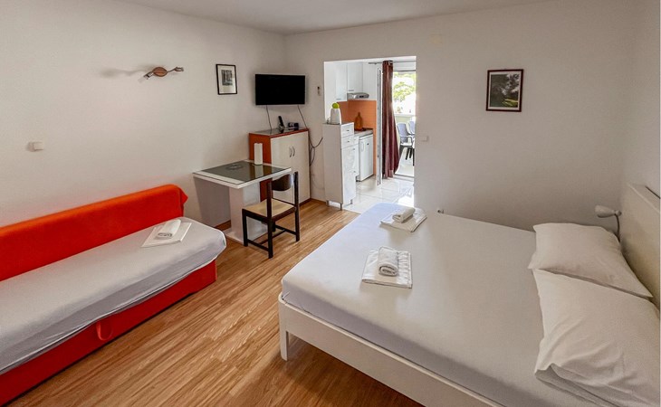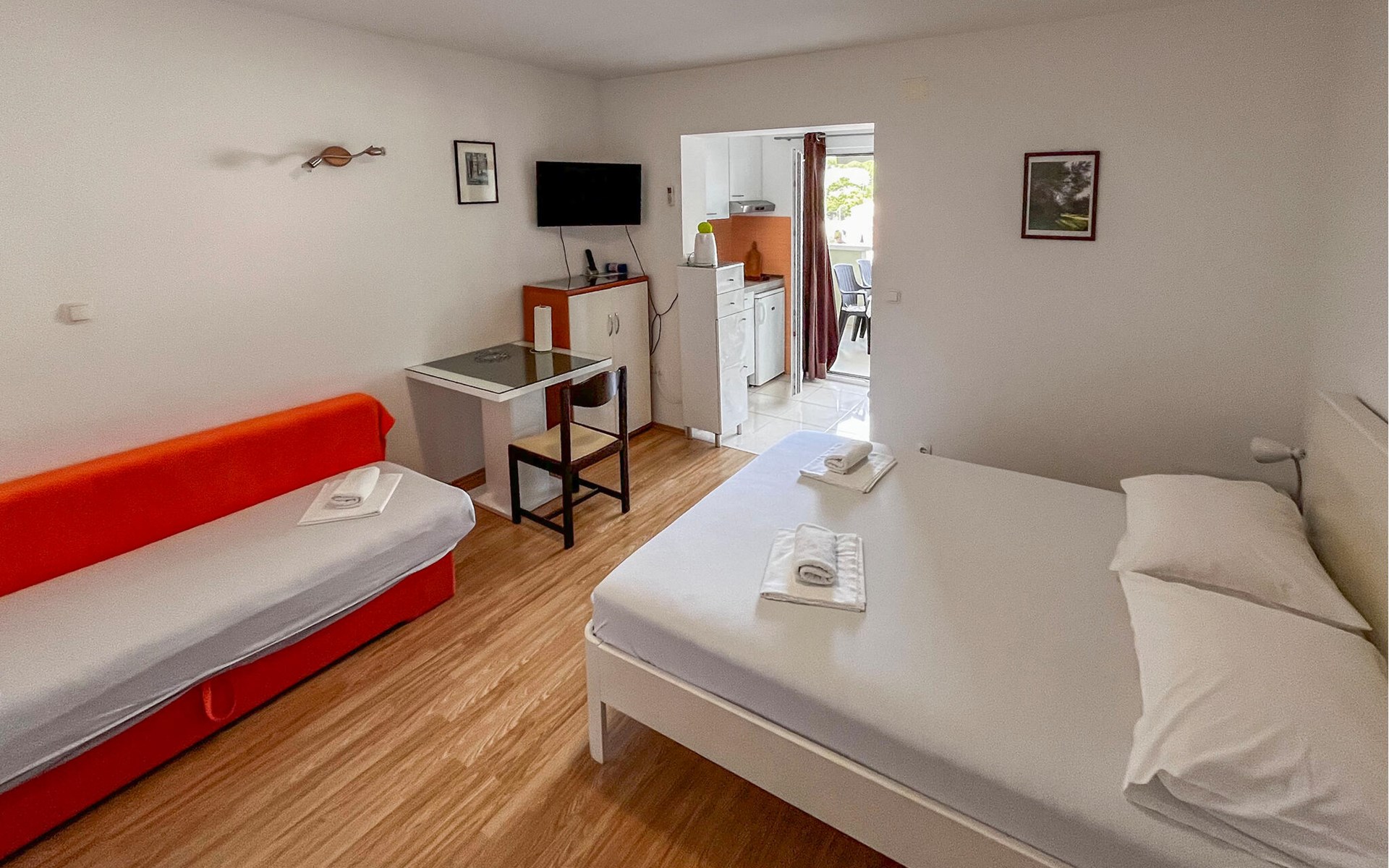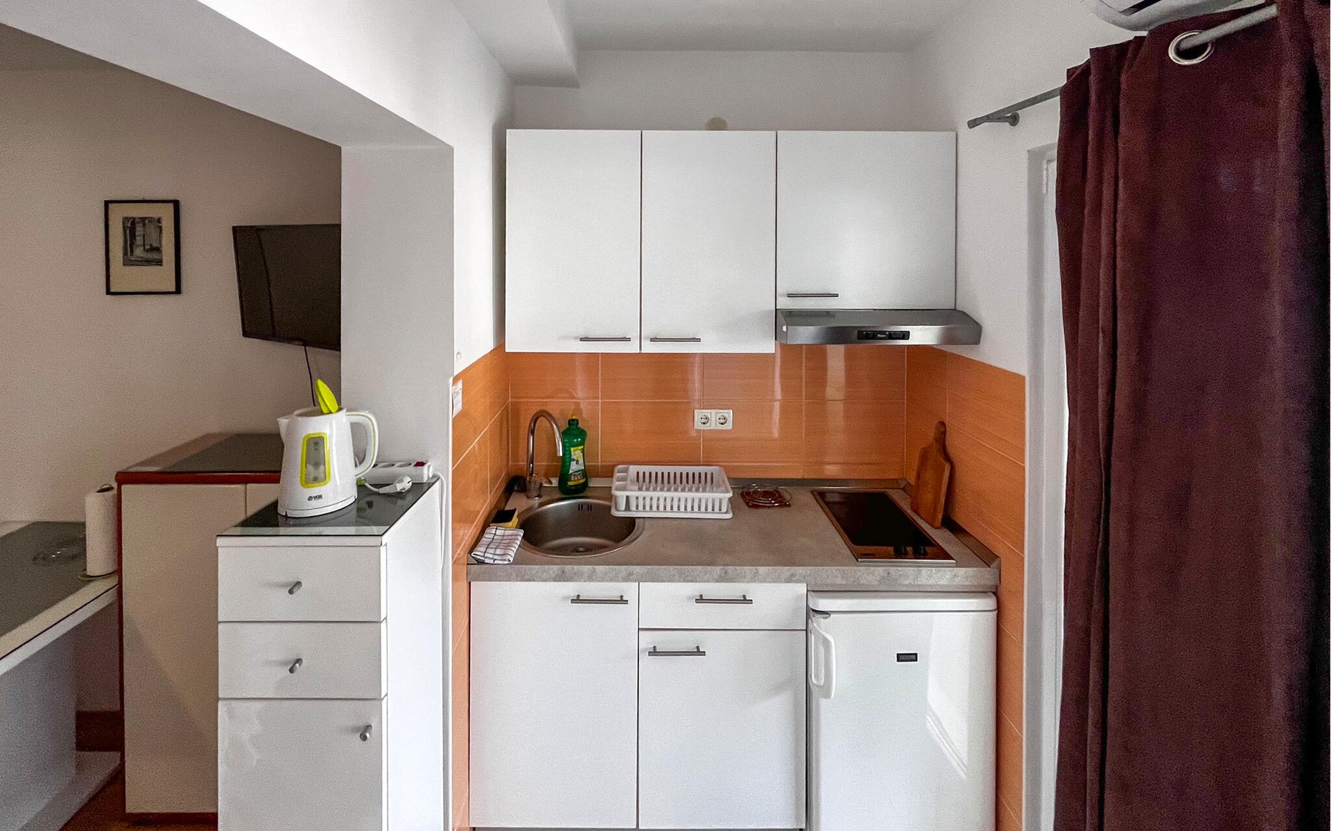 Je appartement is praktisch ingericht en biedt alles wat je nodig hebt voor een aangenaam verblijf. Bereid kleine vakantiegerechten in de compacte keuken met alles wat je nodig hebt voor het dagelijks leven en geniet samen van maaltijden in de gezellige eethoek. Ontspan daarna met een goed boek of plan je volgende reis naar de Adriatische kust.