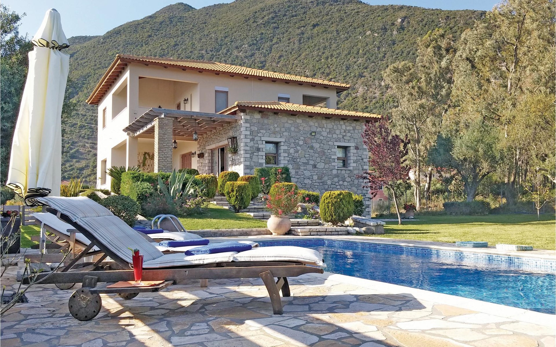 Op de begane grond vindt u de smaakvol ingerichte woonkamer, waar u op koelere avonden van het uitzicht kunt genieten. De keuken zal gewaardeerd worden door degenen die graag koken. Er is ook een slaapkamer met twee eenpersoonsbedden en een eigen badkamer met douche op de begane grond. Geniet van uw koffie en maaltijden op het grote overdekte terras op de begane grond aan de grote tafel. Op de eerste verdieping zijn er nog drie slaapkamers, allemaal met een eigen badkamer en een groot overdekt terras om op te ontspannen. Het kiezelstrand ligt op slechts 200 meter afstand en iets verderop vindt u kleine typisch Griekse taverna's waar u de Griekse keuken kunt proberen. Maak van hieruit excursies naar plaatsen als het bergachtige Nafpaktia en de kleine dorpjes in de omgeving en verken Delphi (1 uur rijden), Galaxidi, Itea en Napfaktos. Last but not least is Olympia (140 km) een bezoek waard. Het zwembad is geopend van april tot oktober. Vliegveld: Athene 260 km en Araxos 90 km.