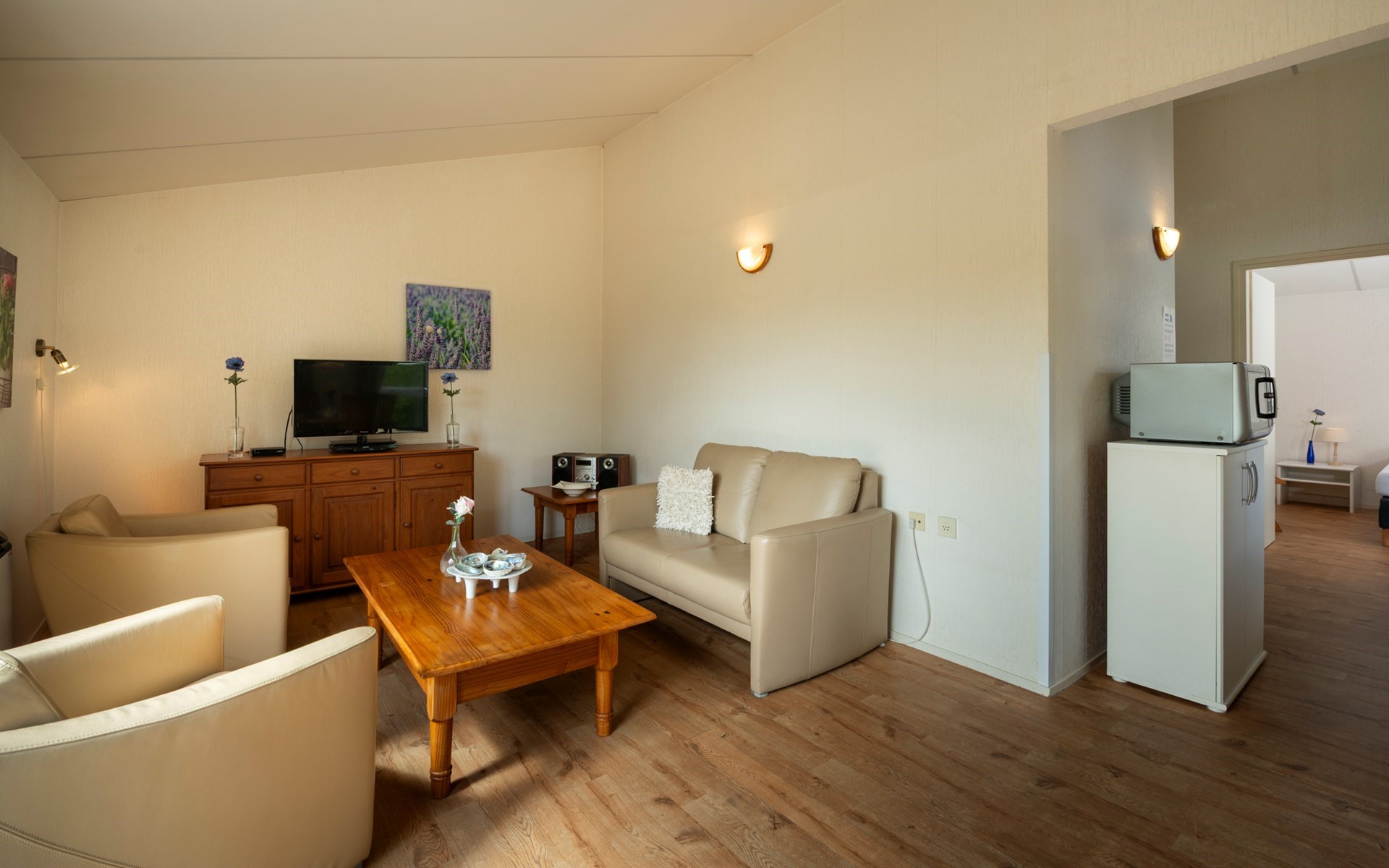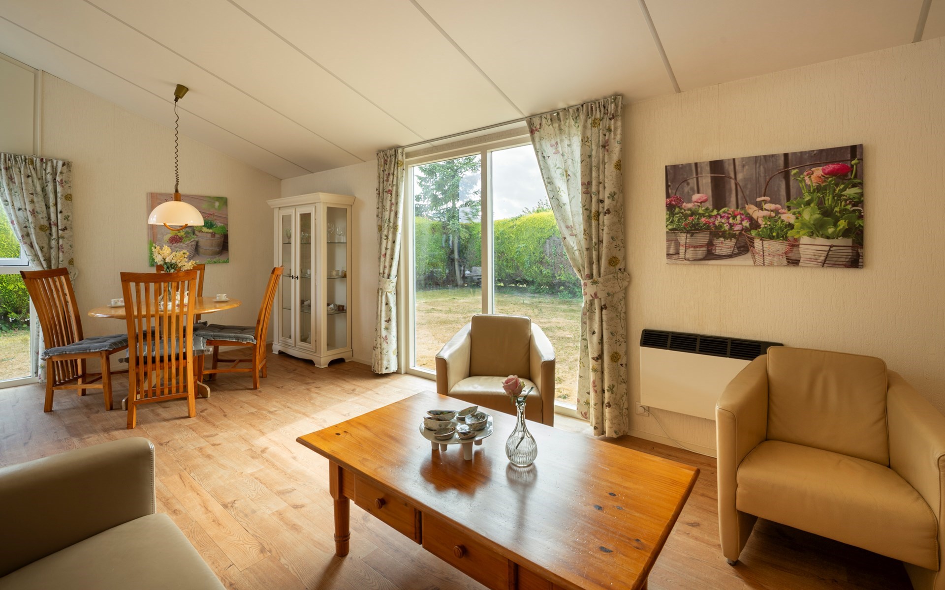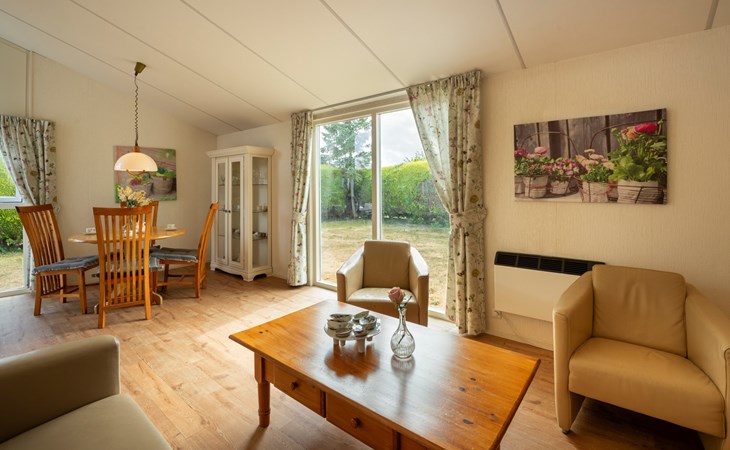 Het chalet heeft een ruime woonkamer met open keuken en aangrenzende eethoek. Vanuit de zithoek geniet u door de grote raampartijen van de ruime tuin. De woning heeft twee slaapkamers voorzien van comfortabele eenpersoons boxspring bedden. De badkamer is voorzien van douche en wastafel.