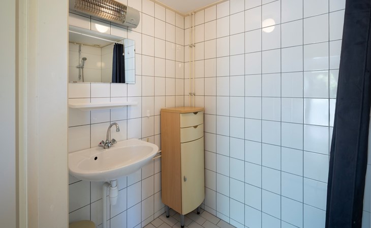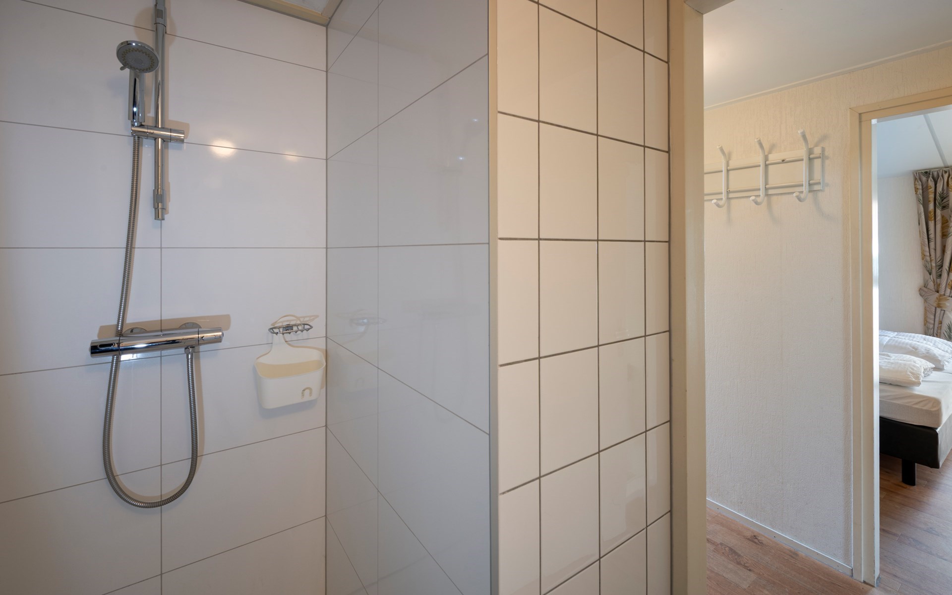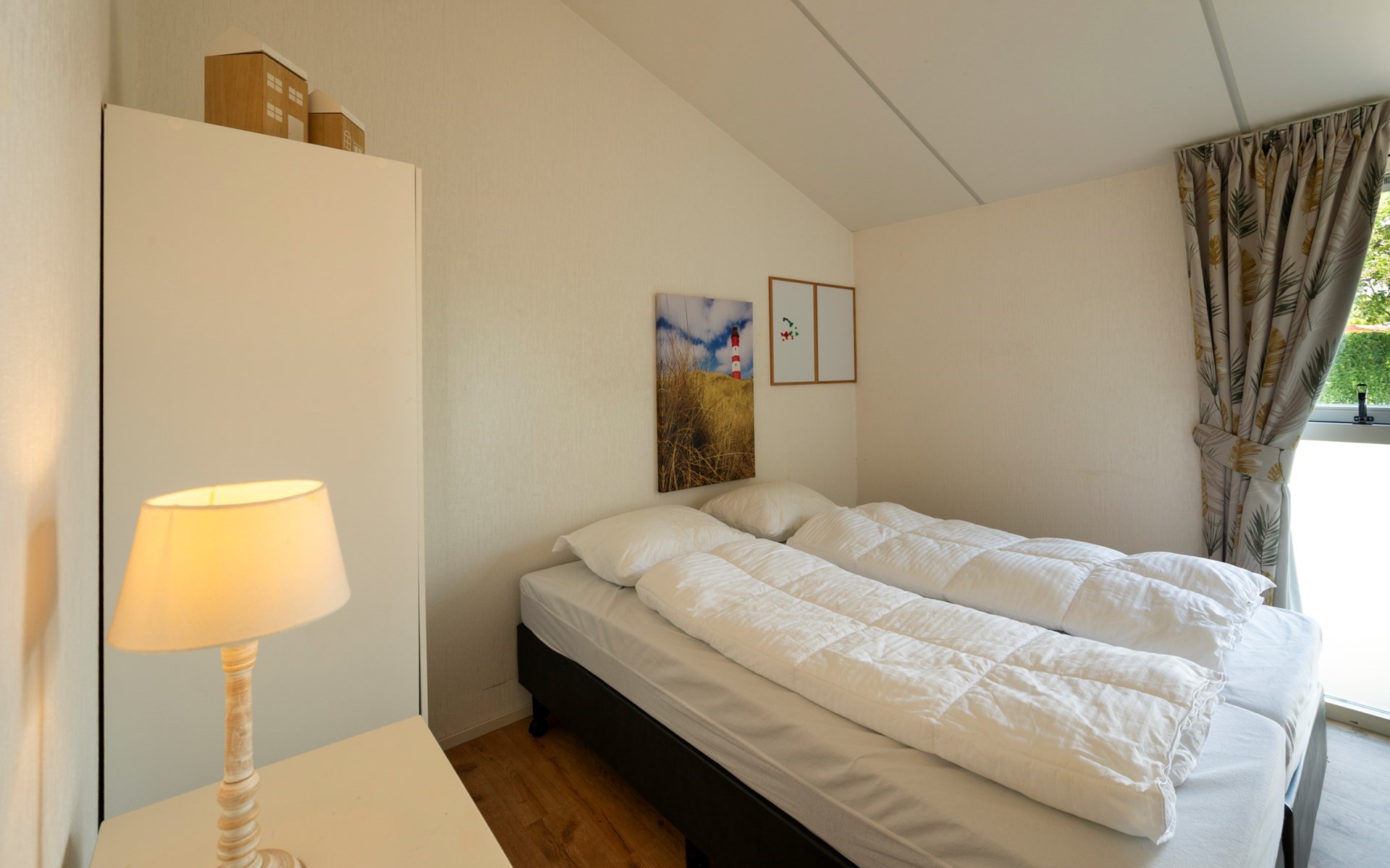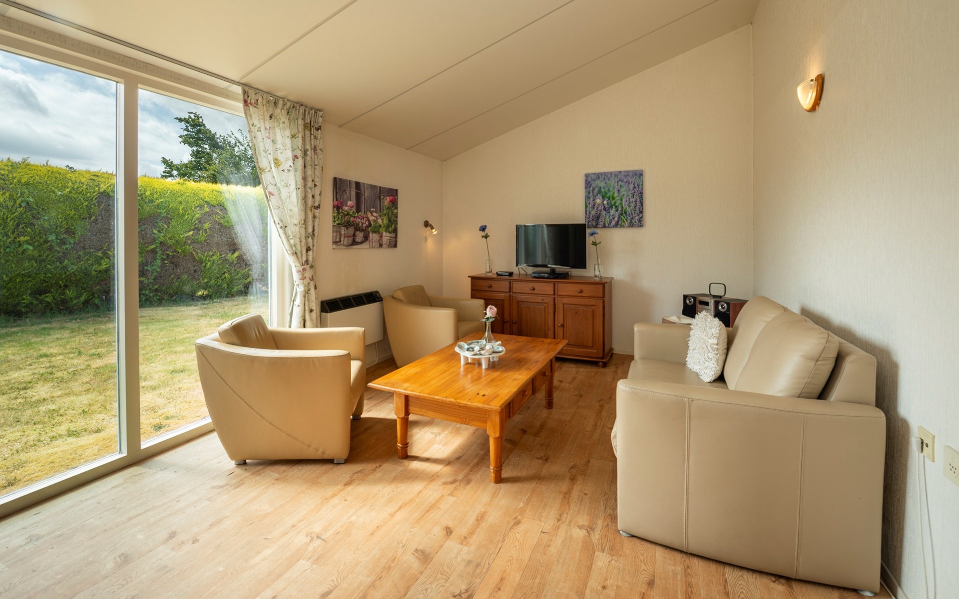 Het chalet heeft een ruime woonkamer met open keuken en aangrenzende eethoek. Vanuit de zithoek geniet u door de grote raampartijen van de ruime tuin. De woning heeft twee slaapkamers voorzien van comfortabele eenpersoons boxspring bedden. De badkamer is voorzien van douche en wastafel.