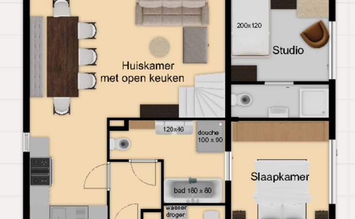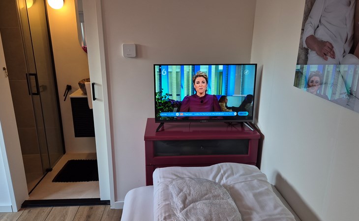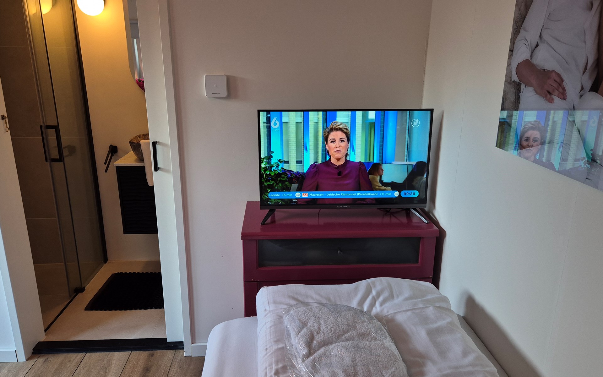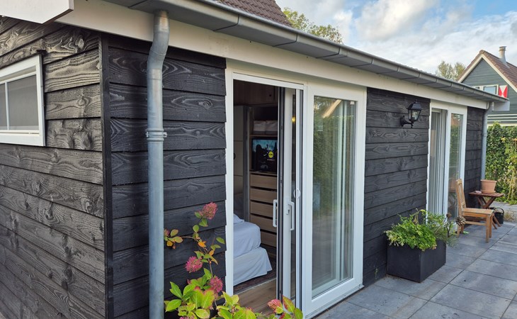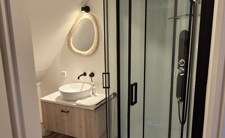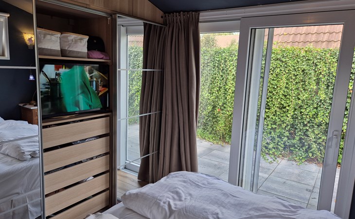 Er is een studio met eigen opgang. De studio heeft een twijvelaar van 120 cm breed, een bureau, smart TV en een badkamer met douche, toilet en wastafel.