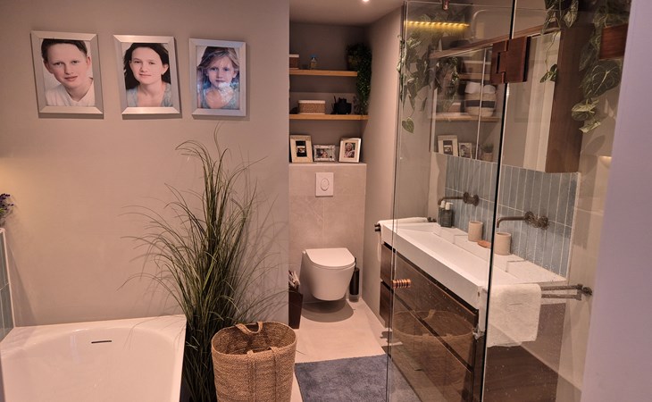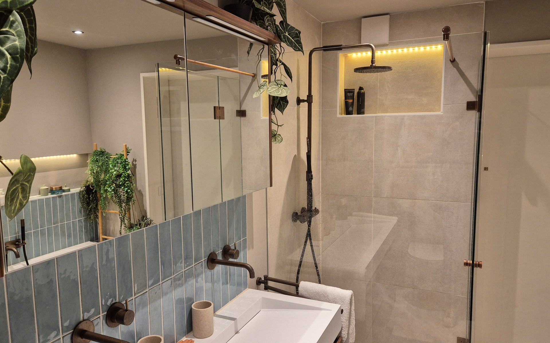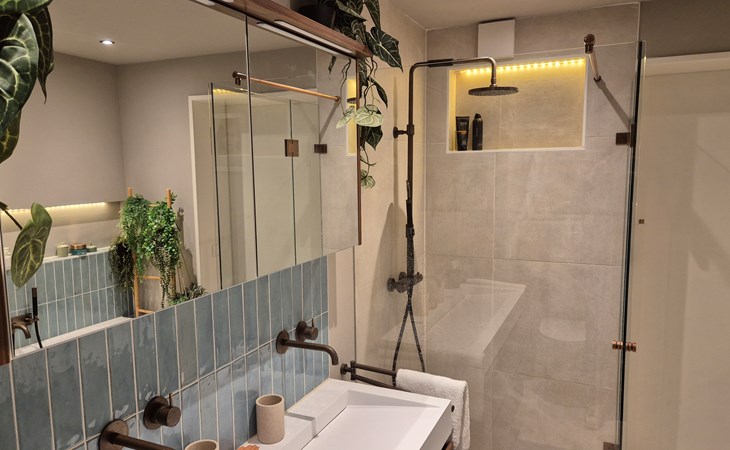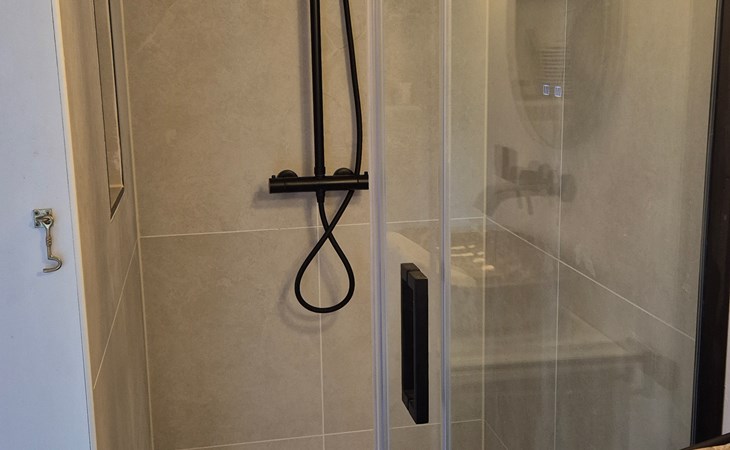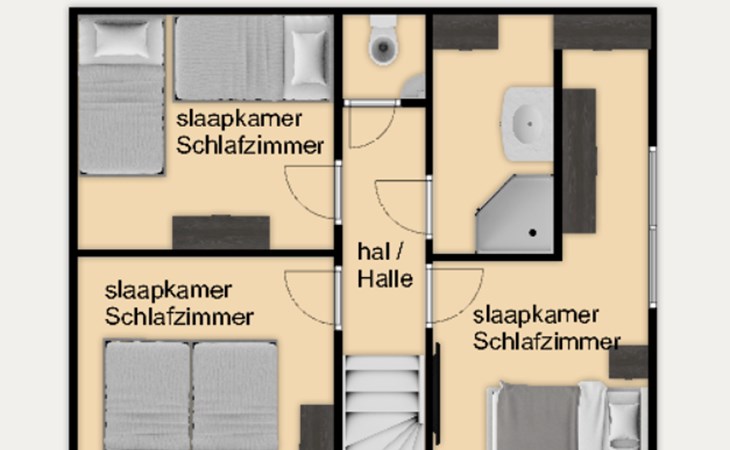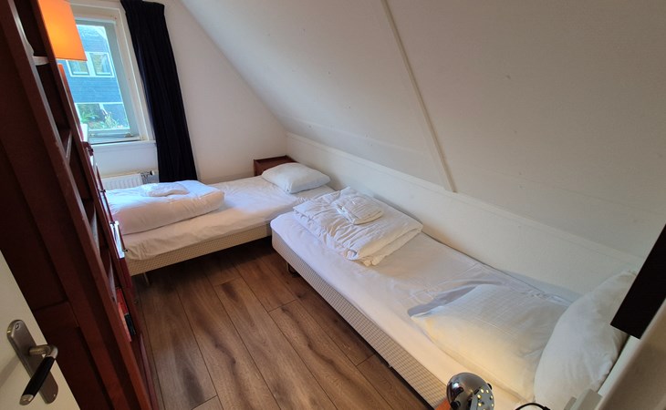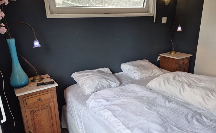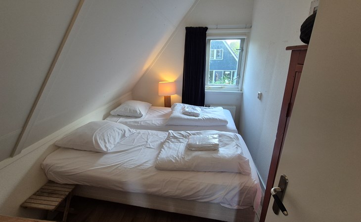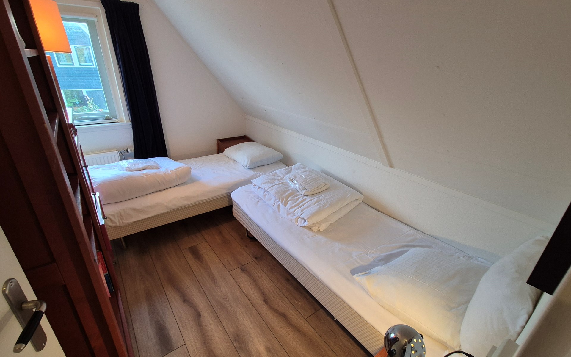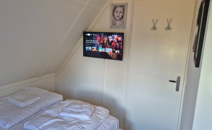 Boven zijn drie slaapkamers, een badkamer met douche en wastafel en een apart toilet. De grotere slaapkamer heeft een tweepersoonsbed (160cm breed x 200cm lang) een smart TV en voldoende kasten. De twee andere slaapkamers hebben ieder twee eenpersoons bedden (90cm breed x 200cm lang)