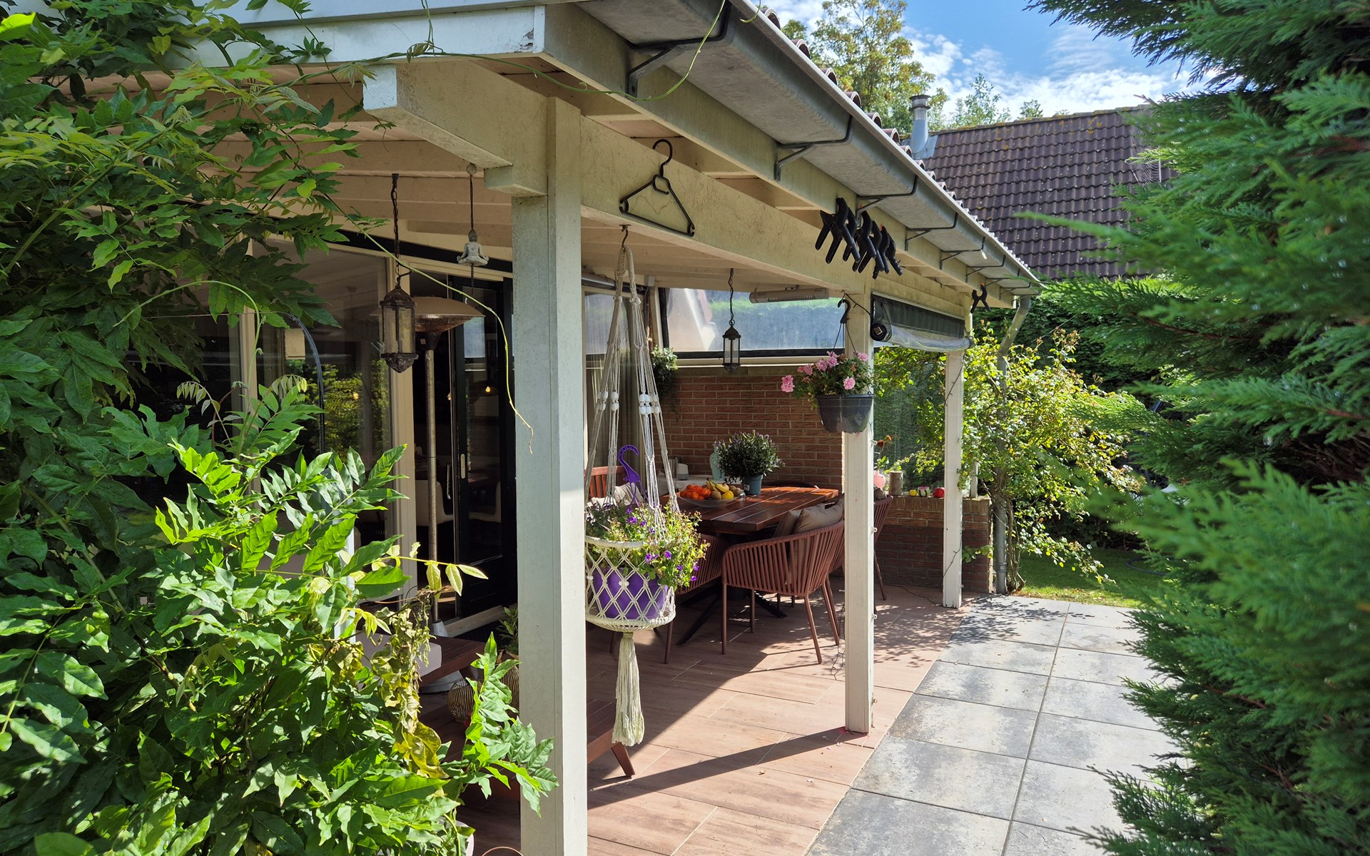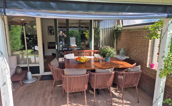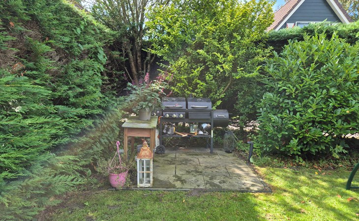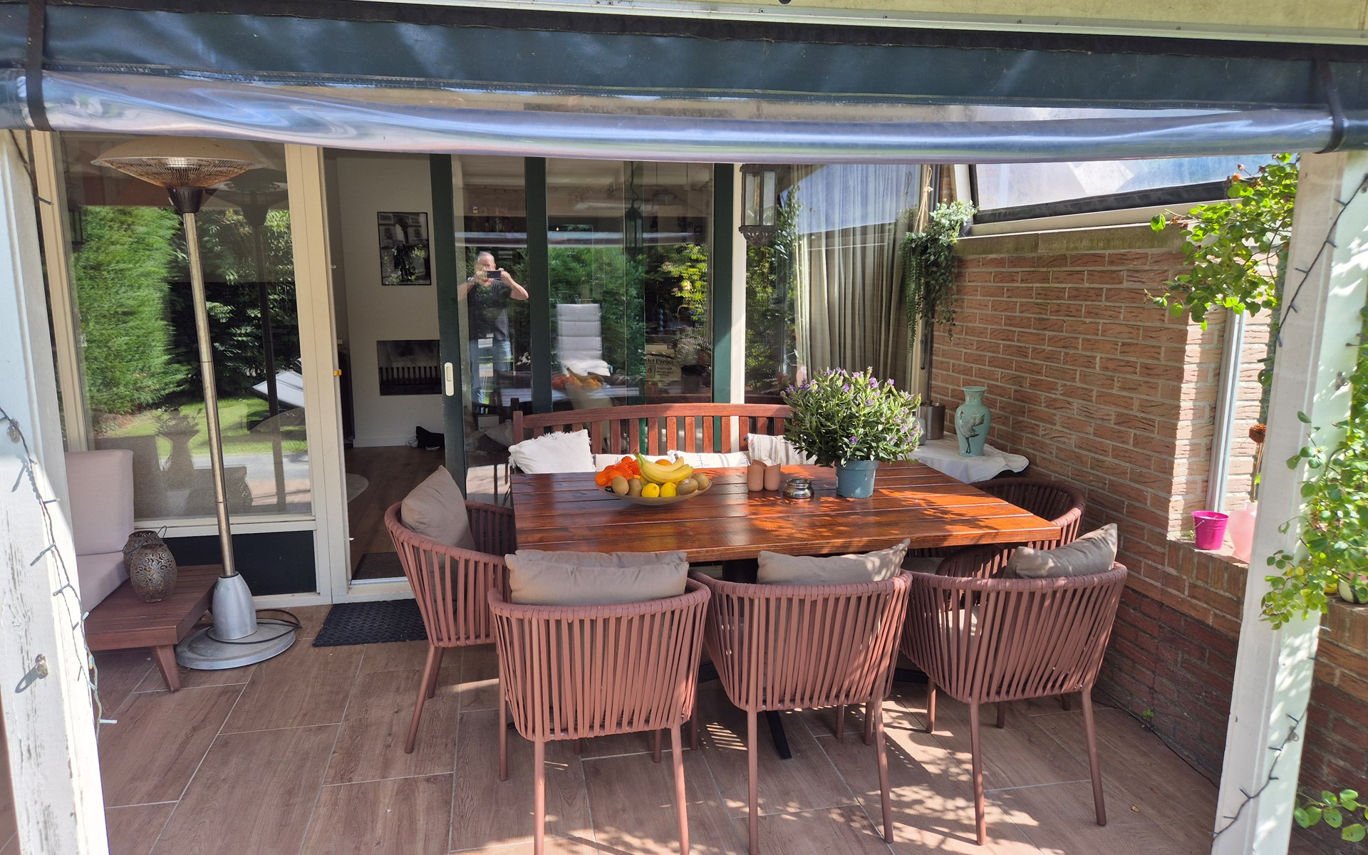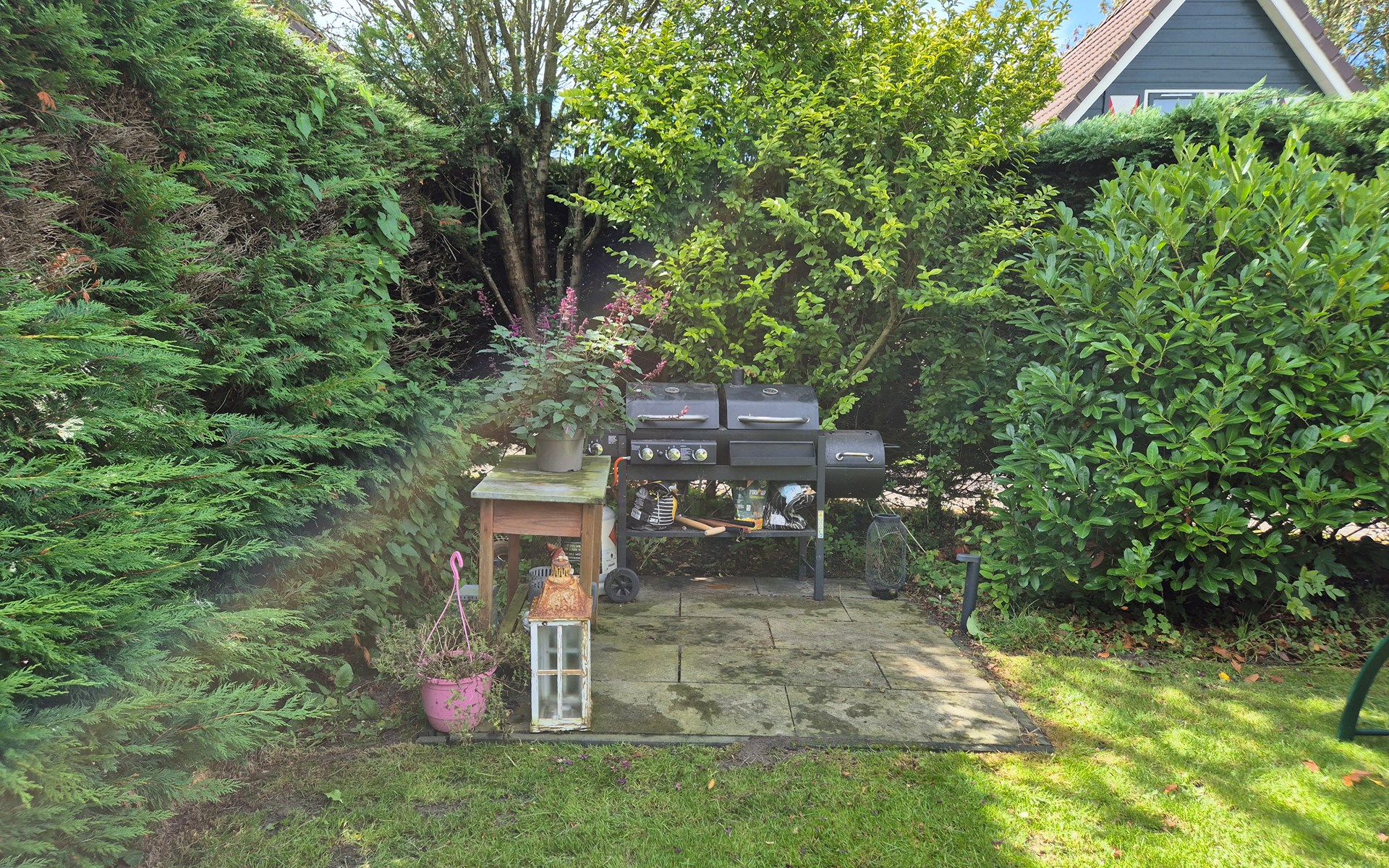 Op het ruime terras vindt u een vaste overkapping met vier heaters, zodat u zelfs op frisse avonden heerlijk buiten kunt zitten. Er staat een buitentafel met een bankje, vijf stoelen en een gezellige loungeset. Voor de barbecue liefhebbers is er een speciaal BBQ-terras met een combi-BBQ (gas, kolen en roken).