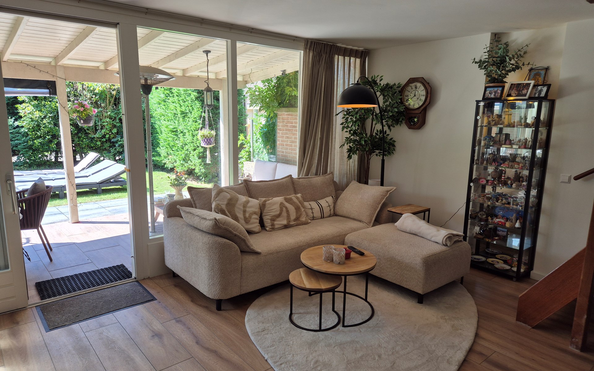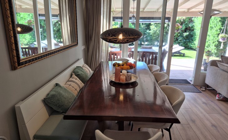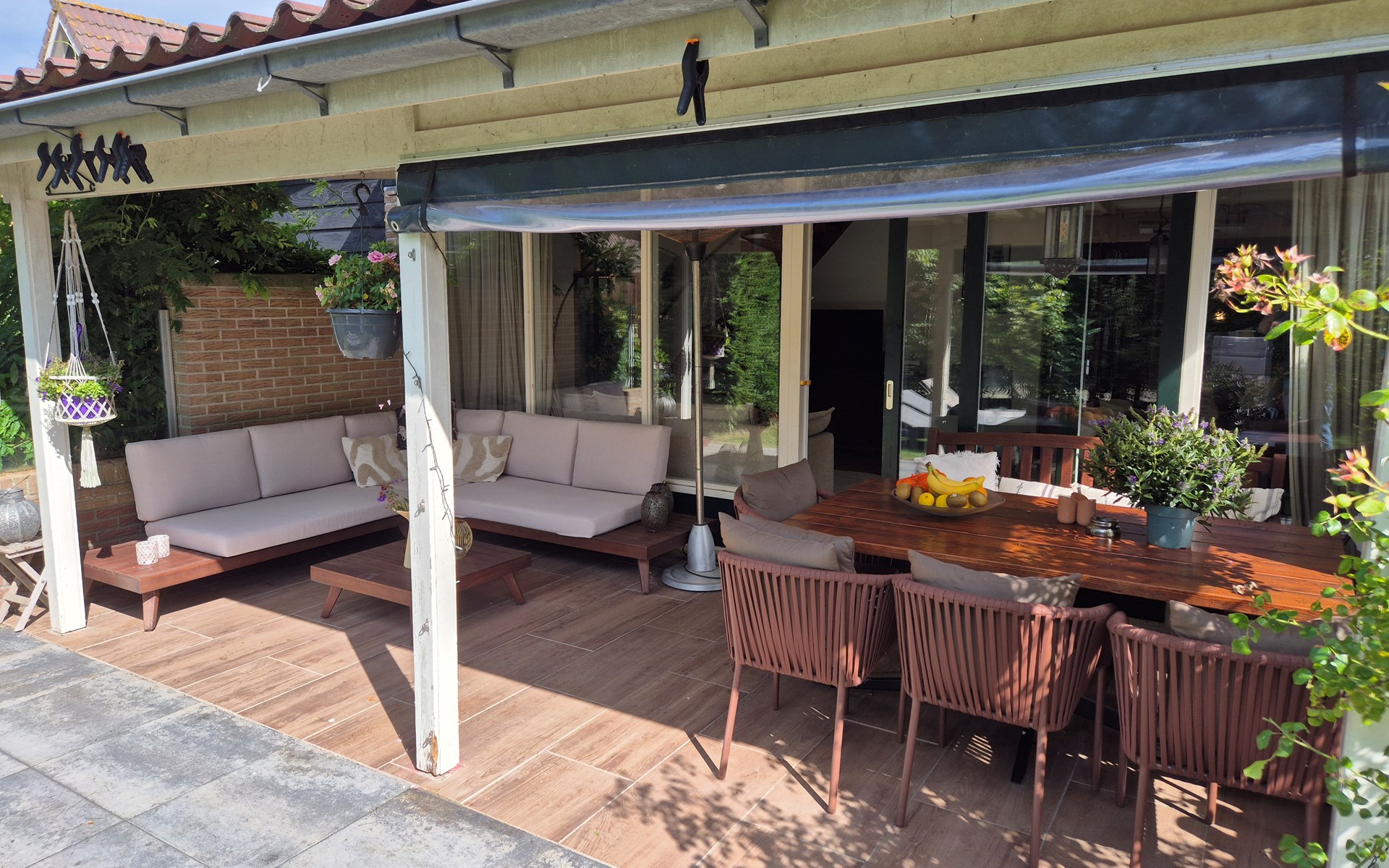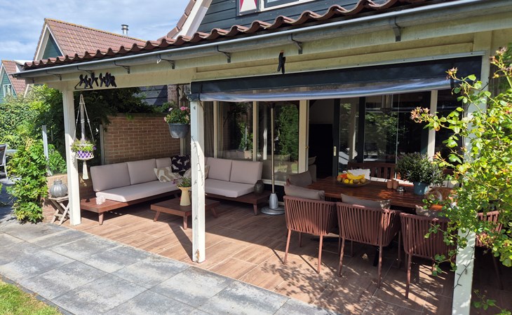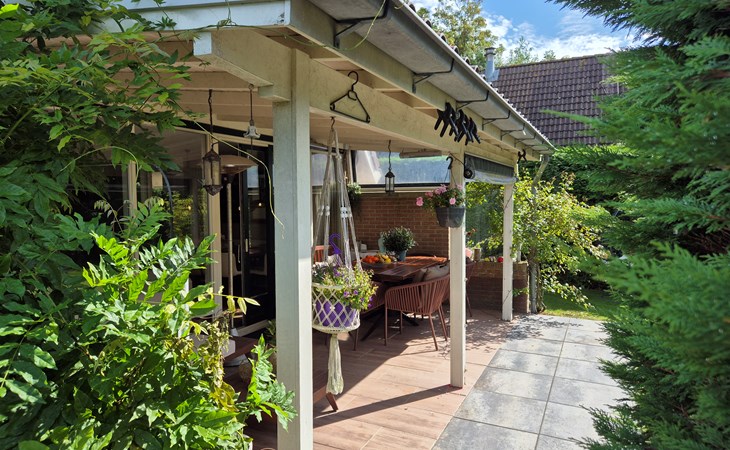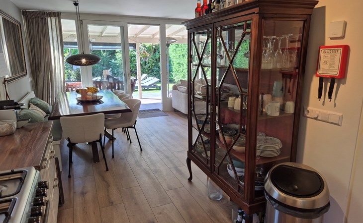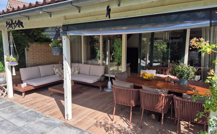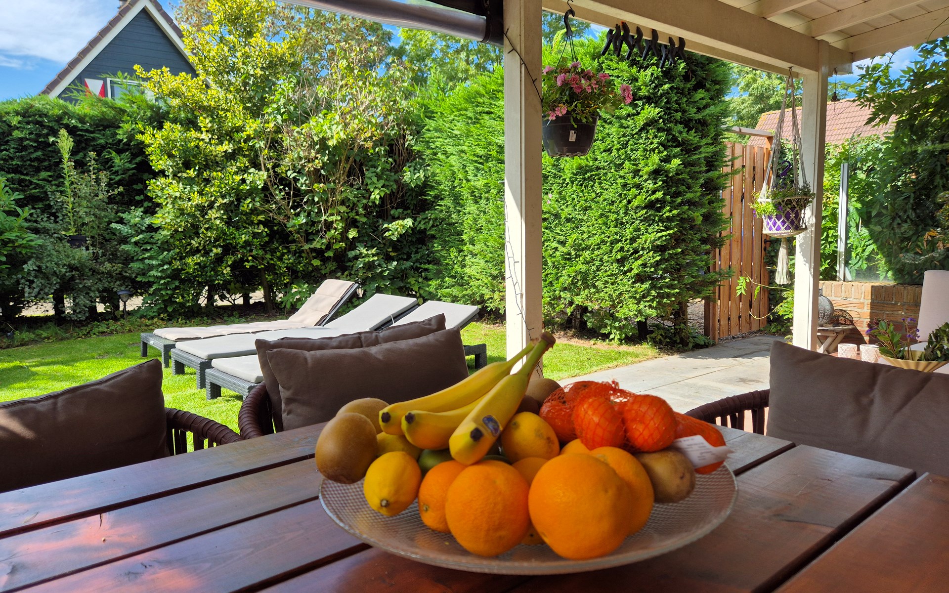 Op het ruime terras vindt u een vaste overkapping met vier heaters, zodat u zelfs op frisse avonden heerlijk buiten kunt zitten. Er staat een buitentafel met een bankje, vijf stoelen en een gezellige loungeset. Voor de barbecue liefhebbers is er een speciaal BBQ-terras met een combi-BBQ (gas, kolen en roken).