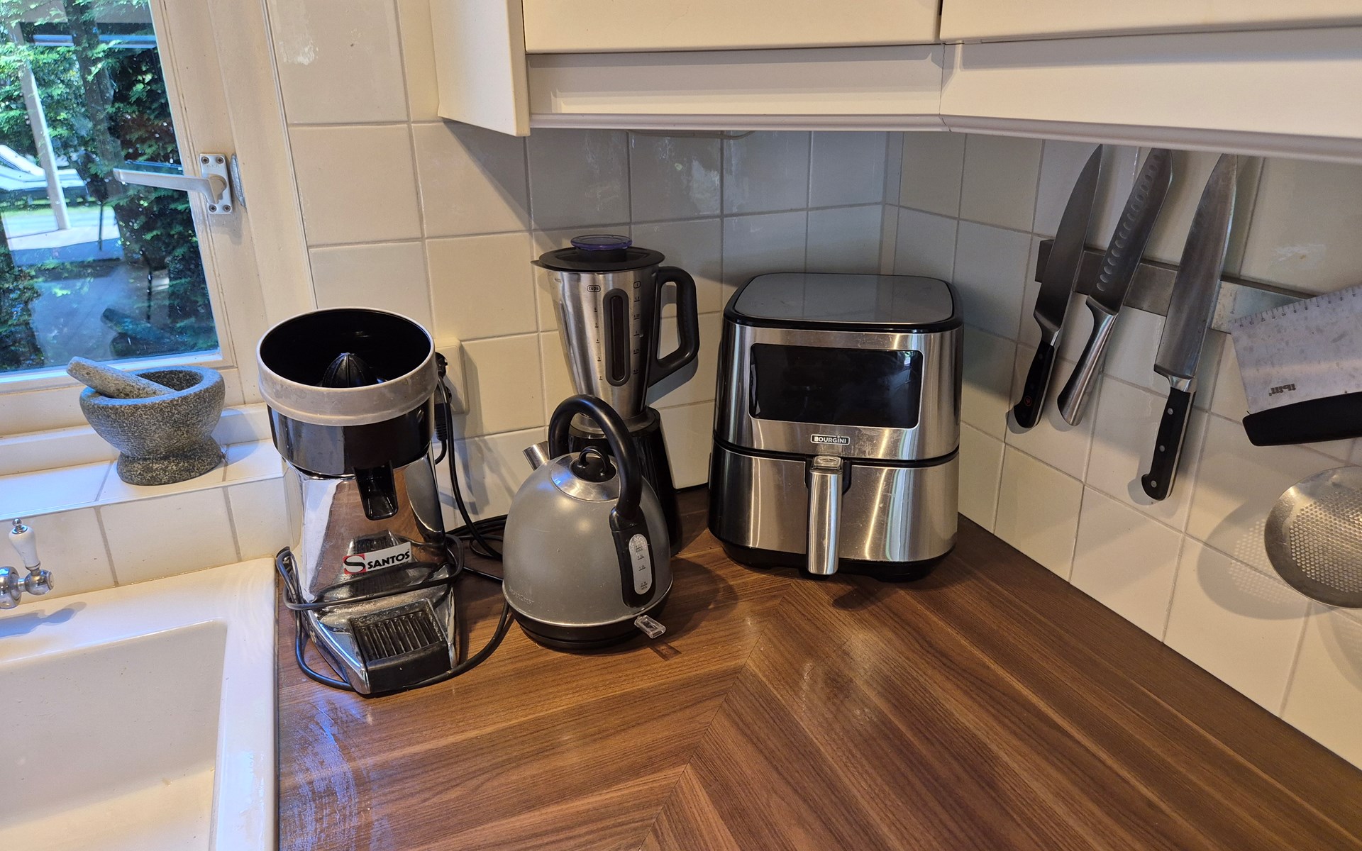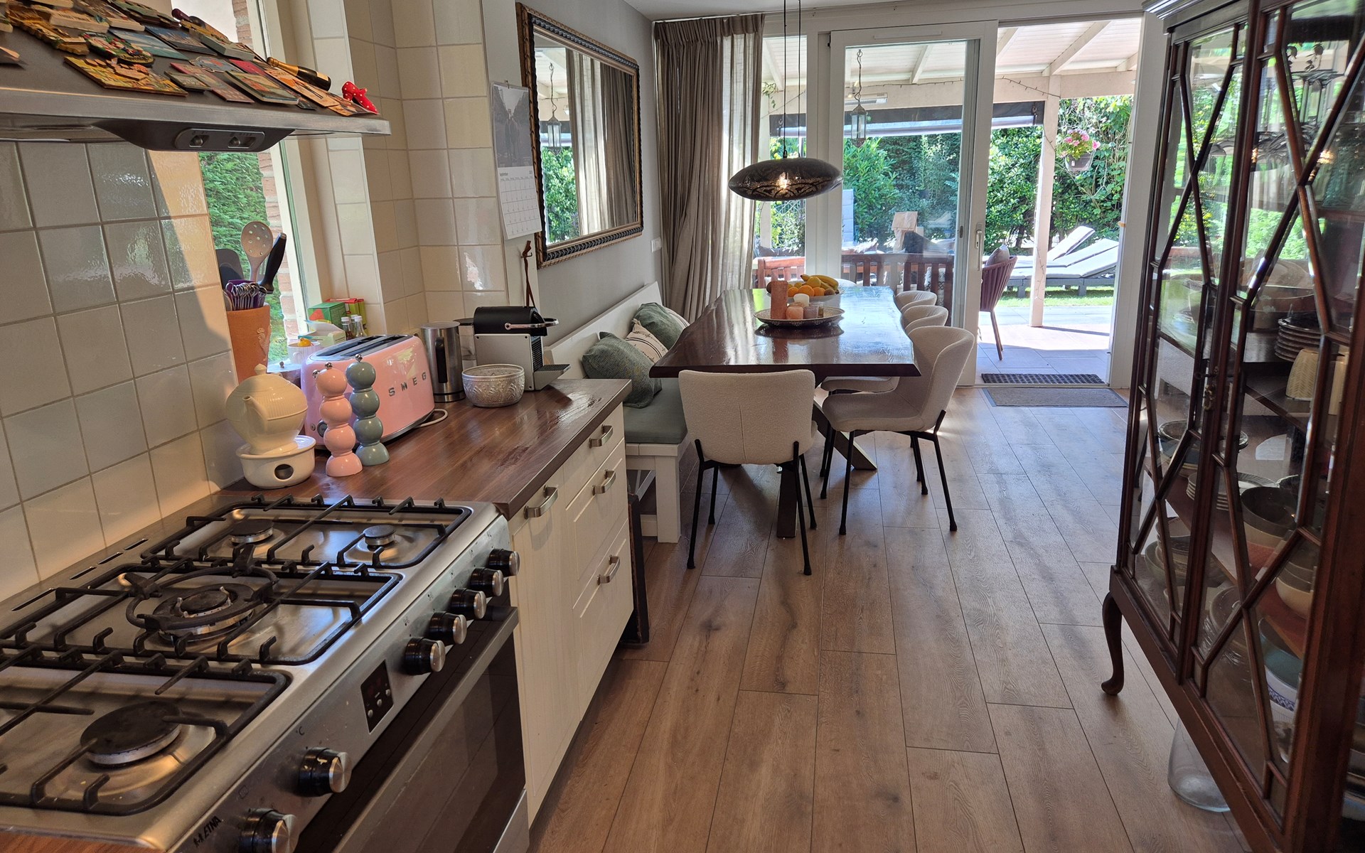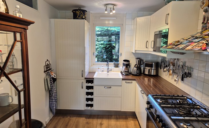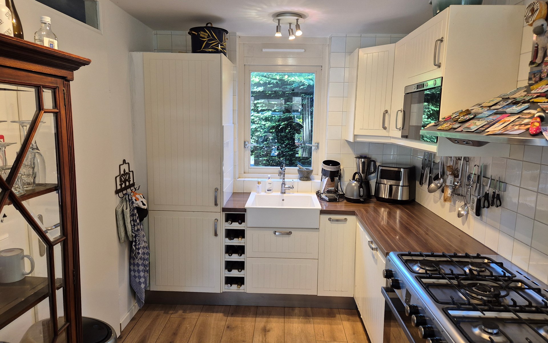 Er is een bijkeuken waar een wasmachine en droger staan. In de tuin staat een schuurtje waar de vrieser staat.