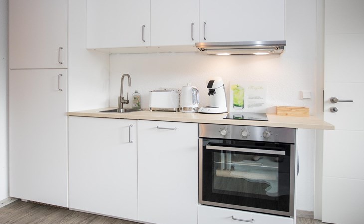 Naast de scheidingswand vind je de keuken voorzien van een kookplaat, oven, vaatwasser, koelkast met vriesvakje, broodrooster, Senseo en waterkoker. Hier kan je in je accommodatie bereiden wat je maar wilt voor een gezellig ontbijt, heerlijke lunch of een diner met je reisgenoten.