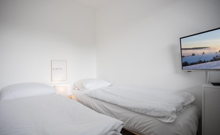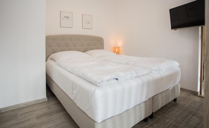 De open leefruimte beschikt ook over een comfortabel tweepersoonsbed, zodat je ook vanuit je bed je favoriete series niet hoeft te missen. Voor wie iets meer privacy wenst, is er een aparte slaapkamer met twee eenpersoonsbedden, een kast en een eigen televisie.