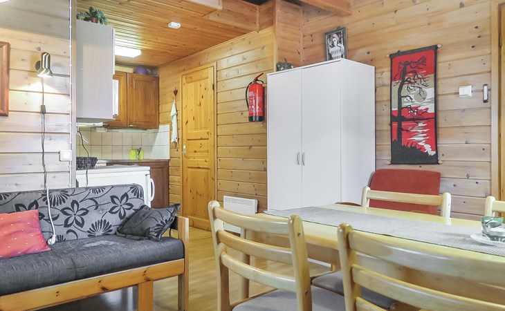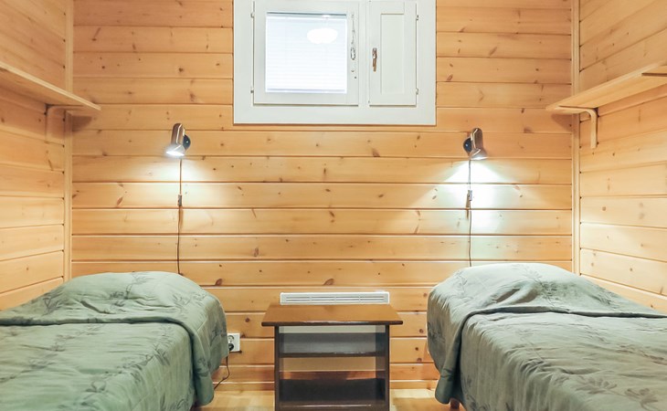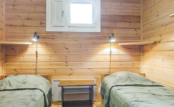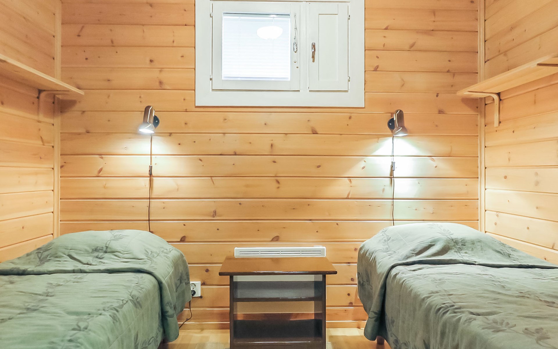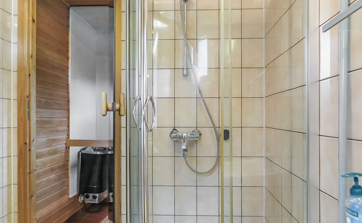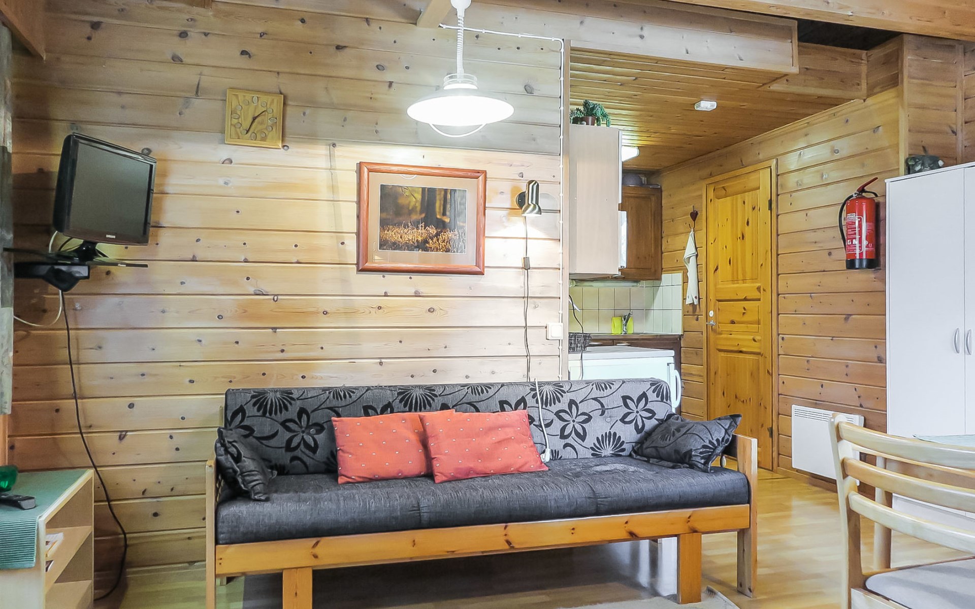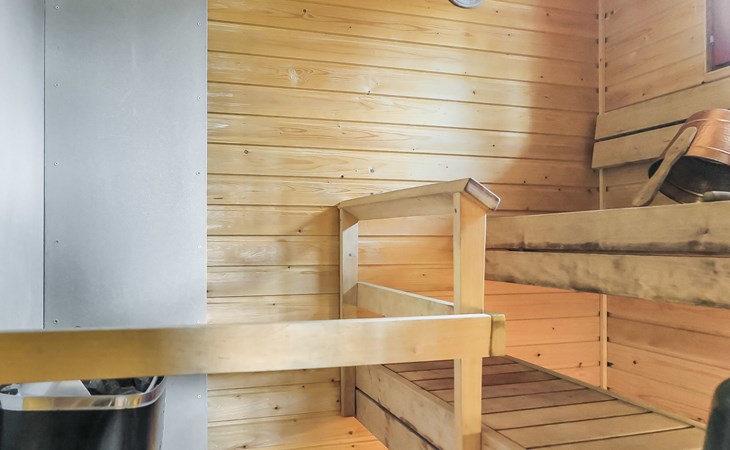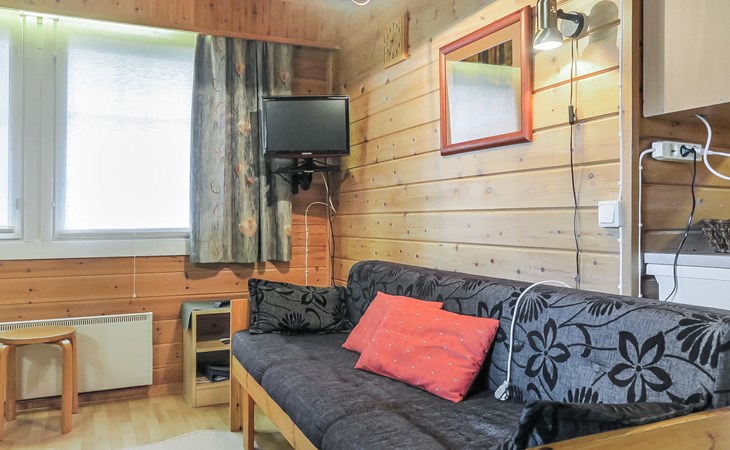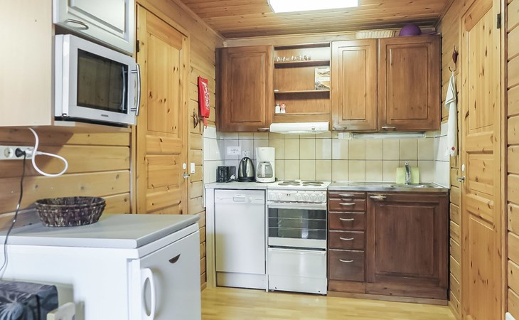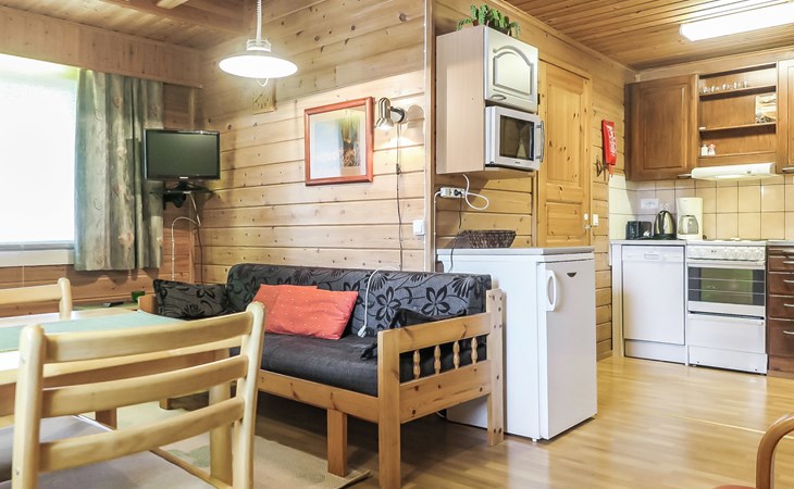 Living room/kitchen, 2 bedrooms, two beds in both, sauna with electric sauna stove, washroom/WC (shower cubicle), lobby and small covered porch.