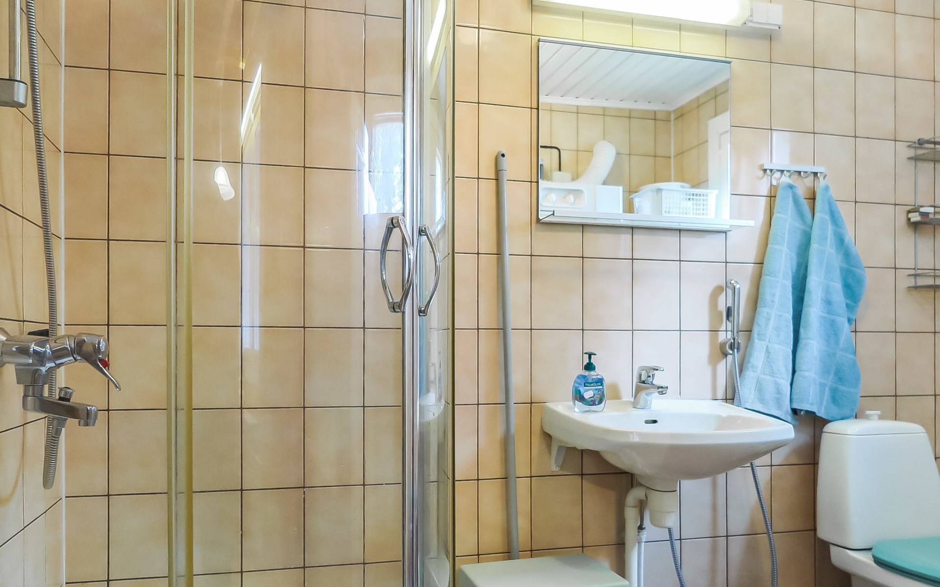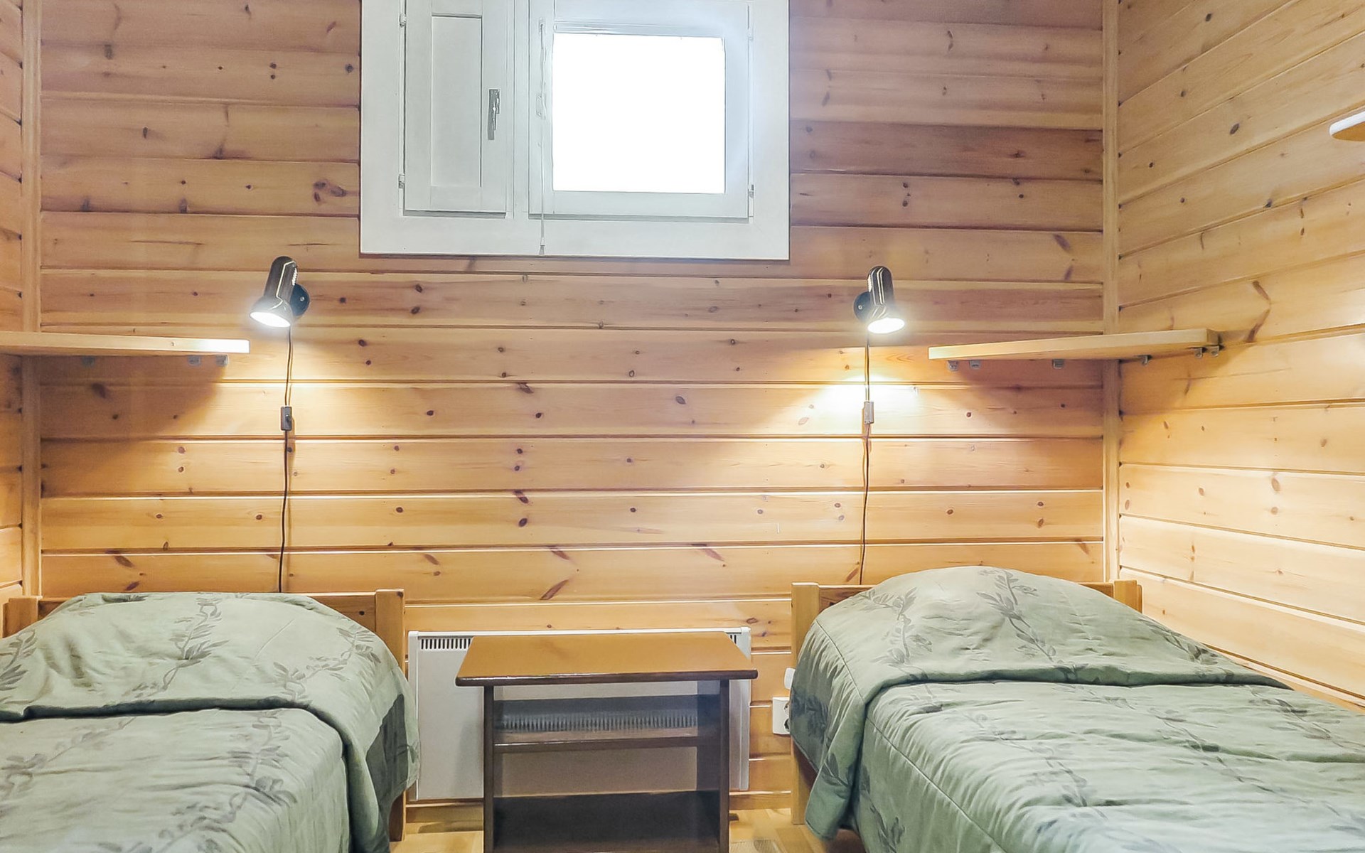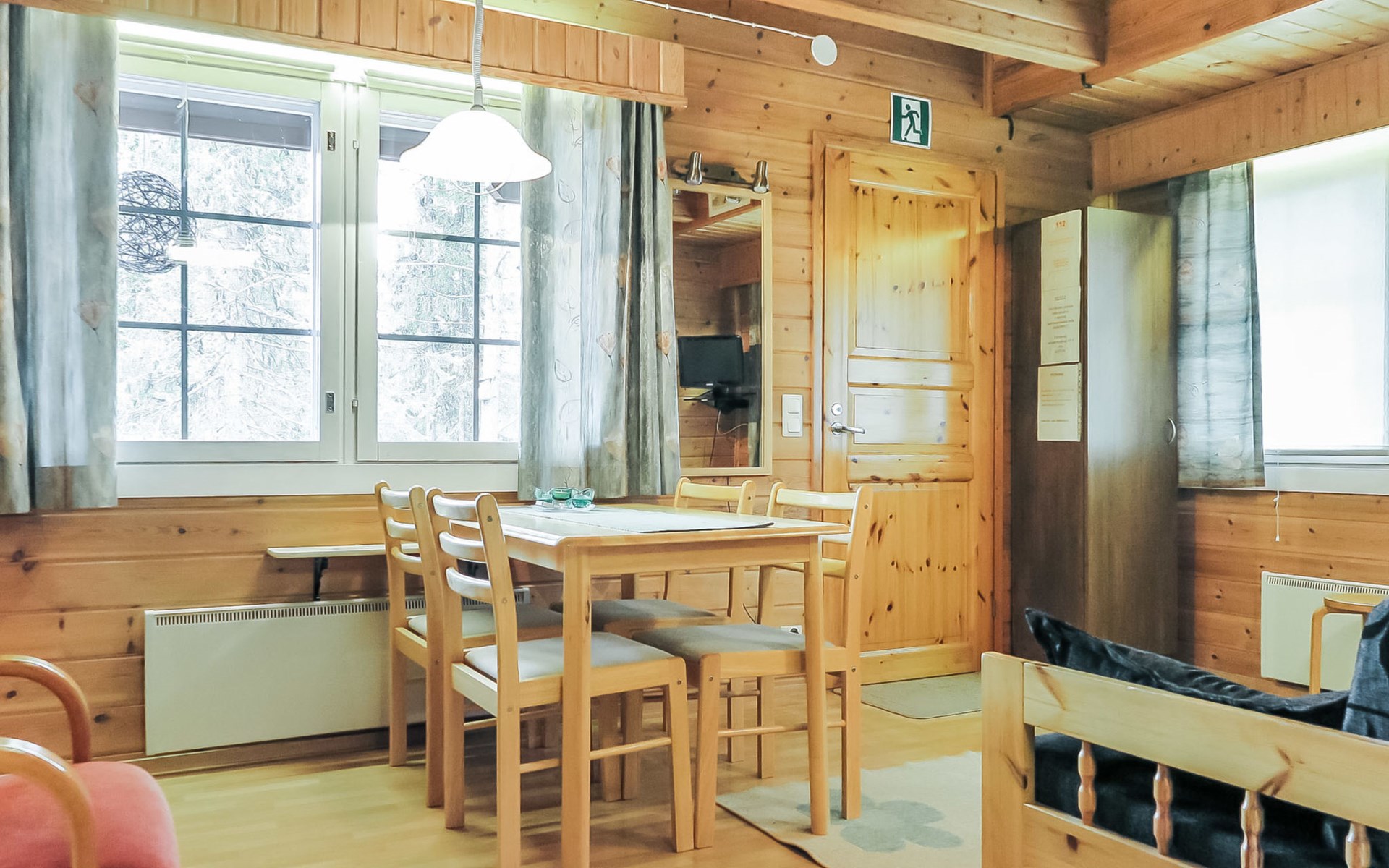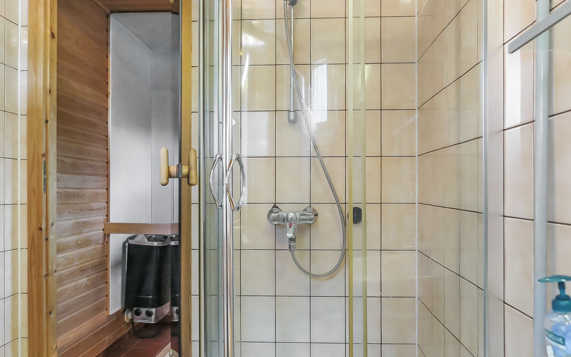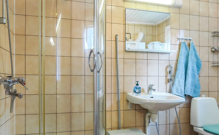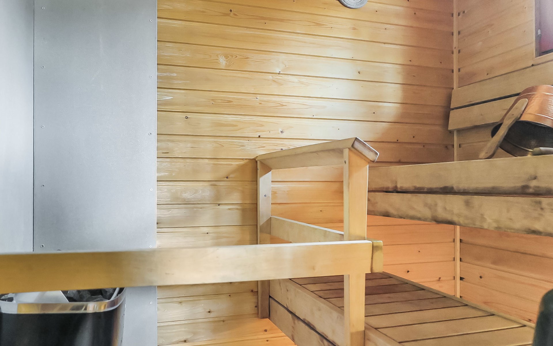 Living room/kitchen, 2 bedrooms, two beds in both, sauna with electric sauna stove, washroom/WC (shower cubicle), lobby and small covered porch.