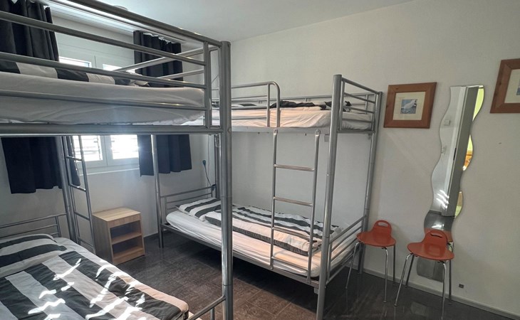 4-room apartment on the 2nd floor: living room, open kitchen, 1 bed room (140x200m) with shower and lavabo , 1 doublebed room (160x200m) and one bed room with each 2 bunk beds, bathroom with shower and bathtub/toilet, separate toilet.