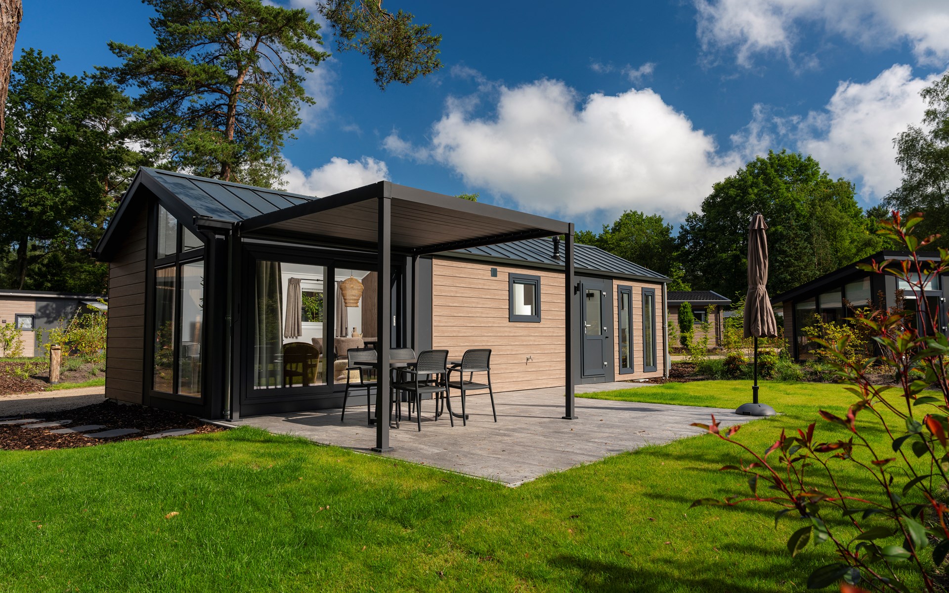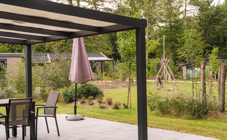 Naast de stijlvolle inrichting biedt de lodge ook extra comfort met airconditioning, die zowel kan verwarmen als koelen, voor een optimaal binnenklimaat in elk seizoen. Buiten geniet u van de luxe pergola, zodat u zelfs op warme dagen of tijdens een lichte regenbui heerlijk buiten kunt zitten.