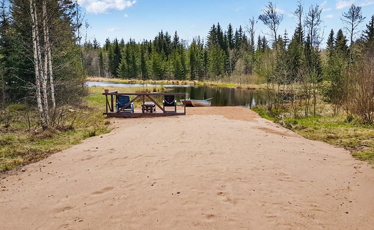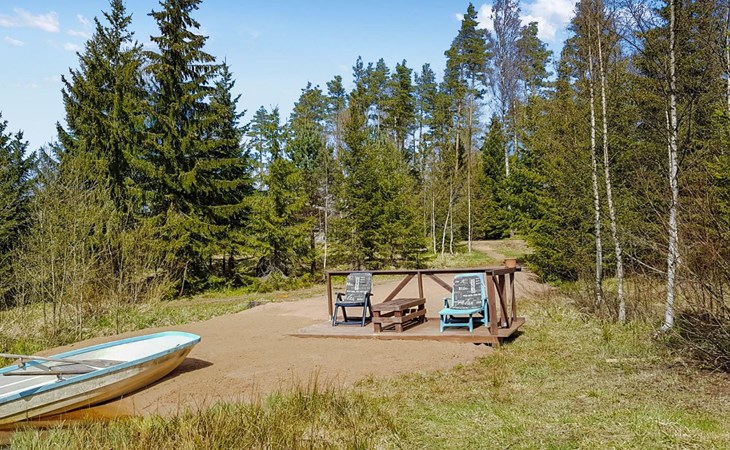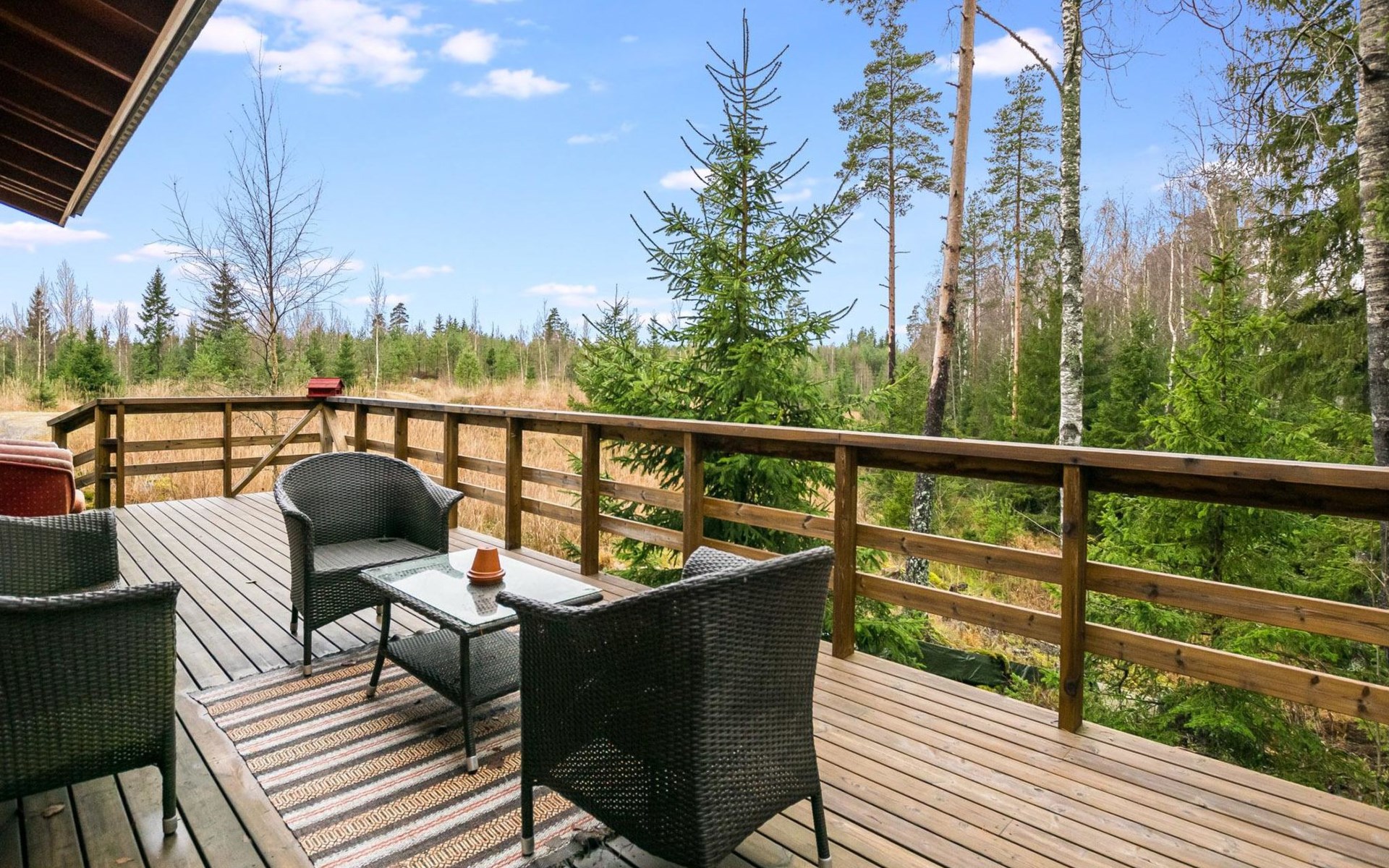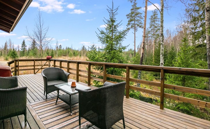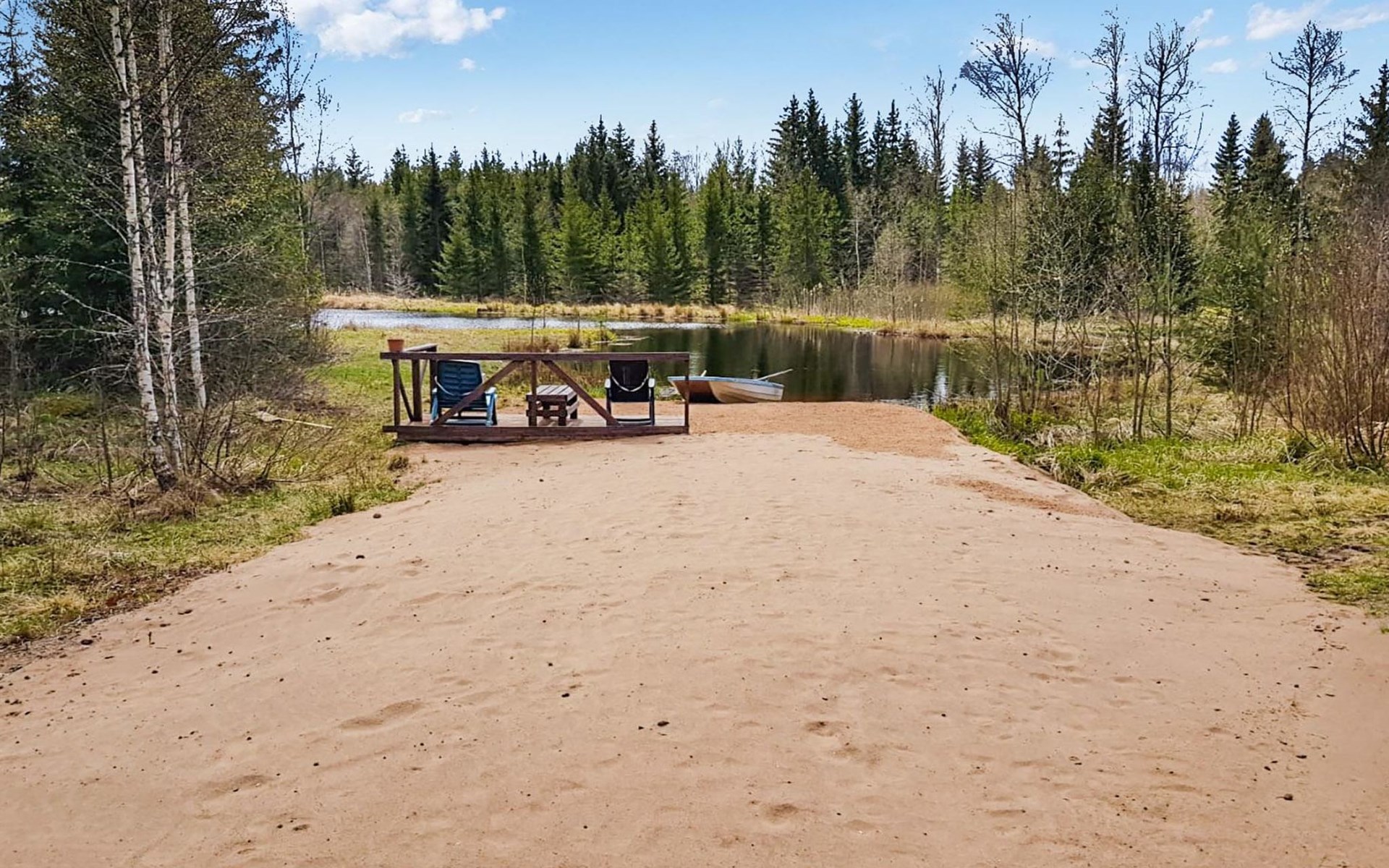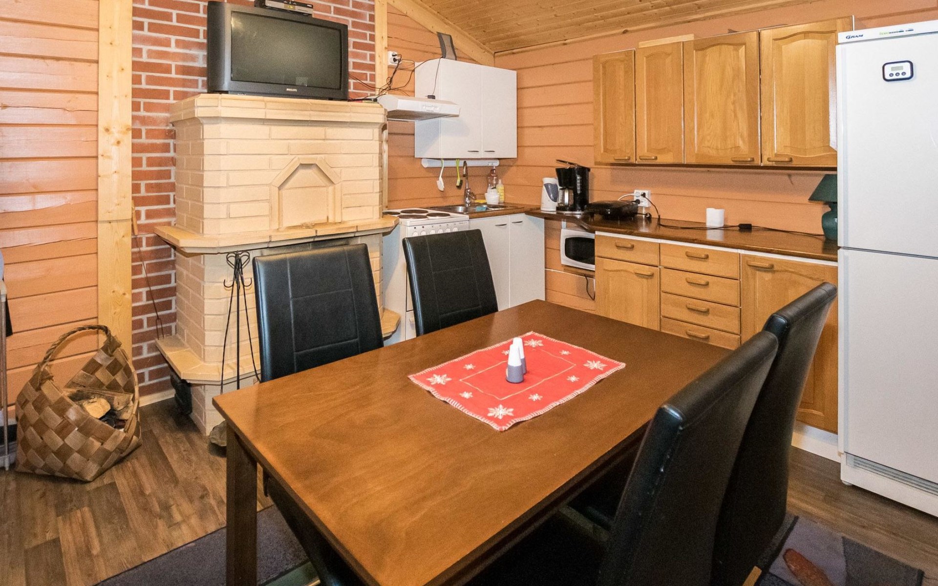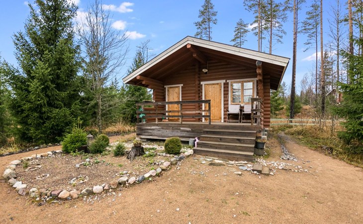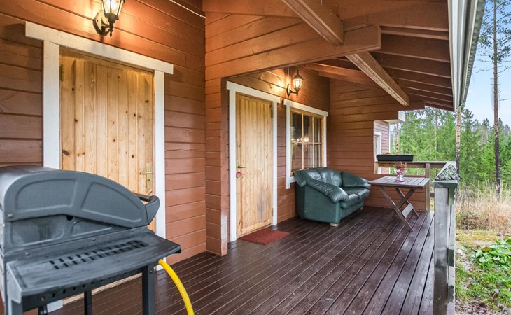 Log cottage 2012, expanded 2014, kitchen (fireplace), living room with 2 beds (exit to back terrace). Through the front terrace to the washroom (where hydro-massage shower and wc). Air source heat pump ( heating and cooling). Gas grill.