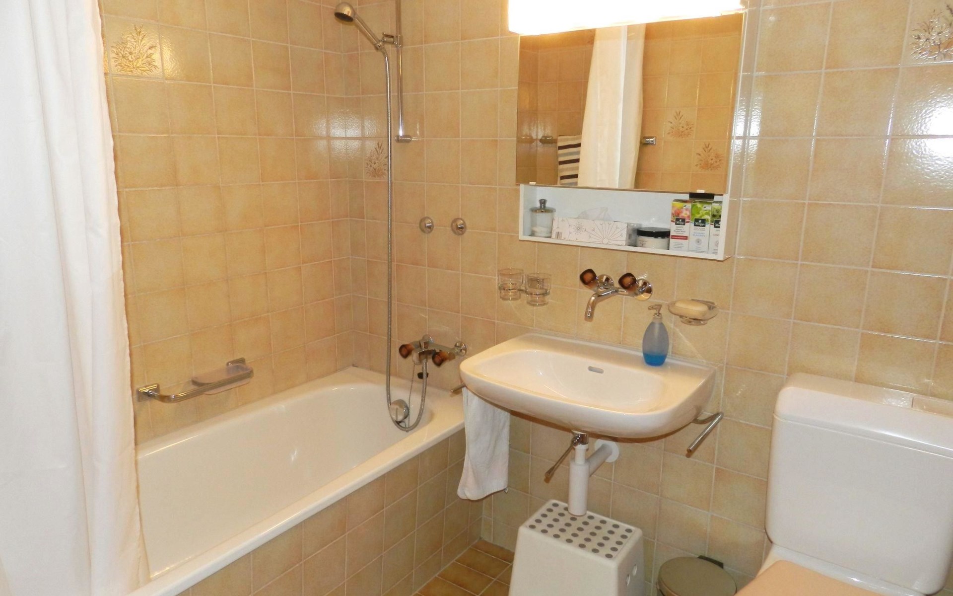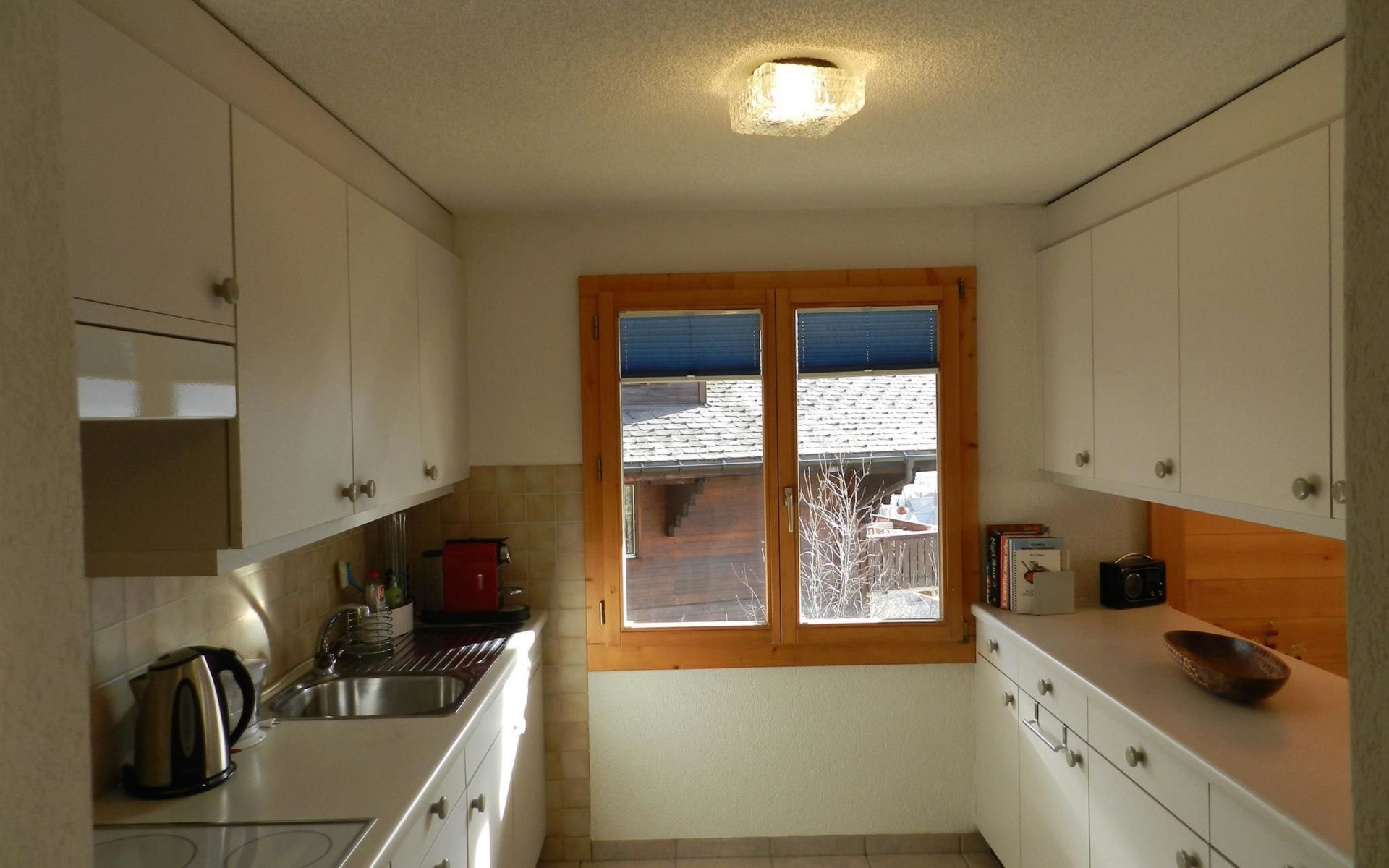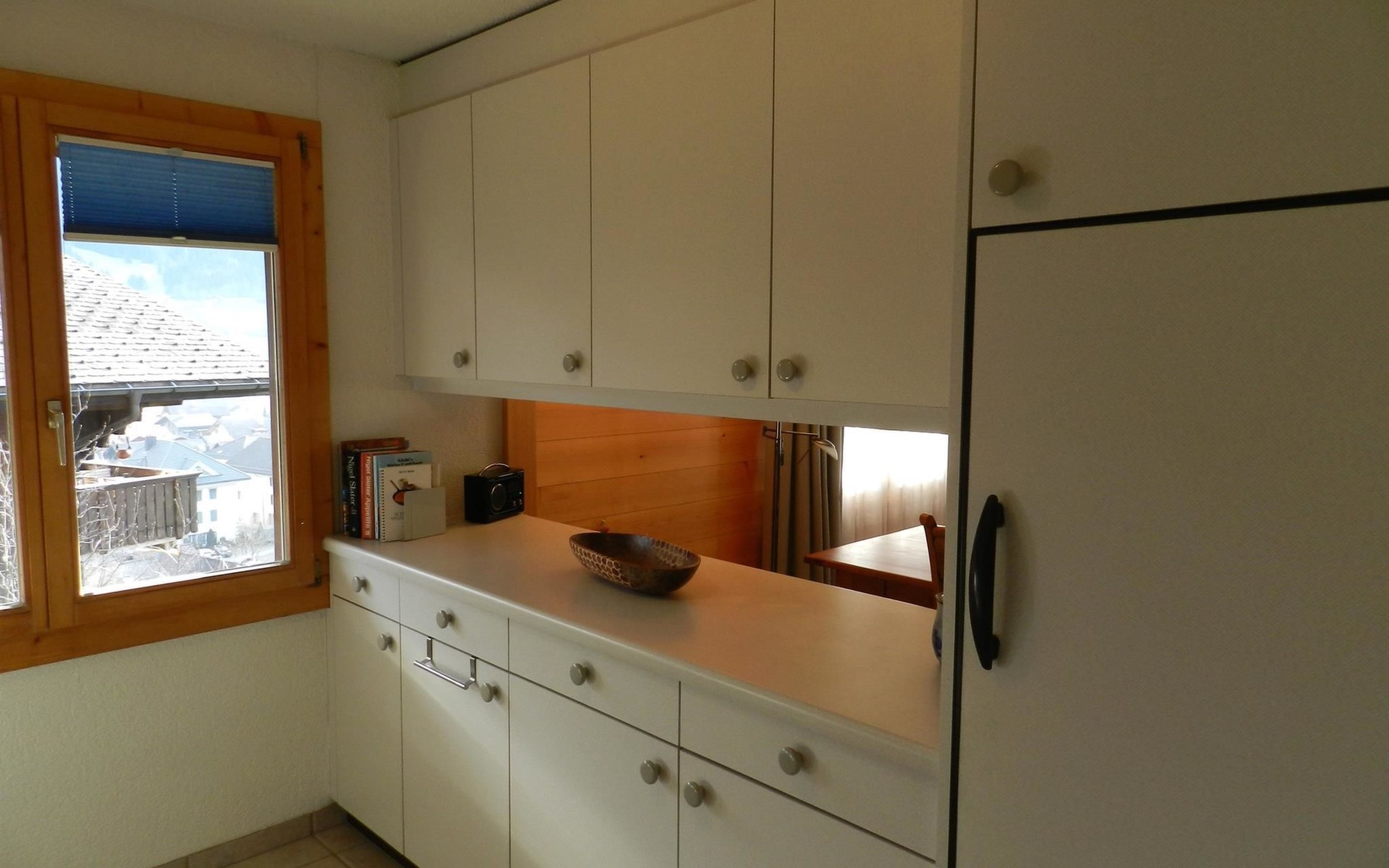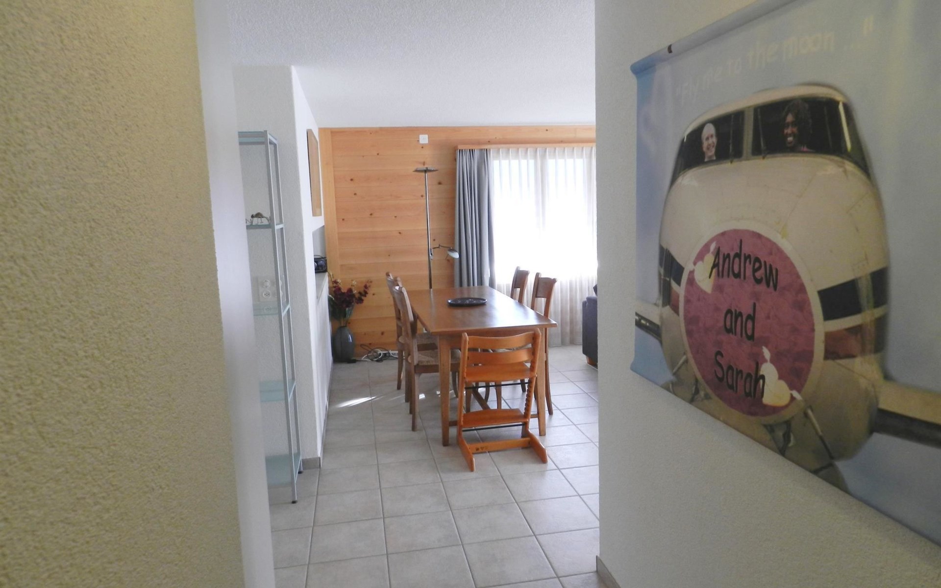 Living-/dining room with kitchen (among other things furnished with ceramic stove, oven, refrigerator with deep-freezer compartment, dishwasher, coffee machine with capsules (Nespresso) as well as a fondue-, raclette-set and table grill), dining table with 4 chairs, 2 sofas, TV and radio. 1 bathroom with bathtub/toilet. 1 bedroom with 1 double bed (180x200cm), big cupboard, 1 chair and 1 extra travel mattress. 1 room with pull-out sofa bed (130x200cm) for max. 2 younger children or max. 1 adult, office desk and wardrobe. WiFi. Travel baby cot (60x120cm) incl. bed linen and highchair available.