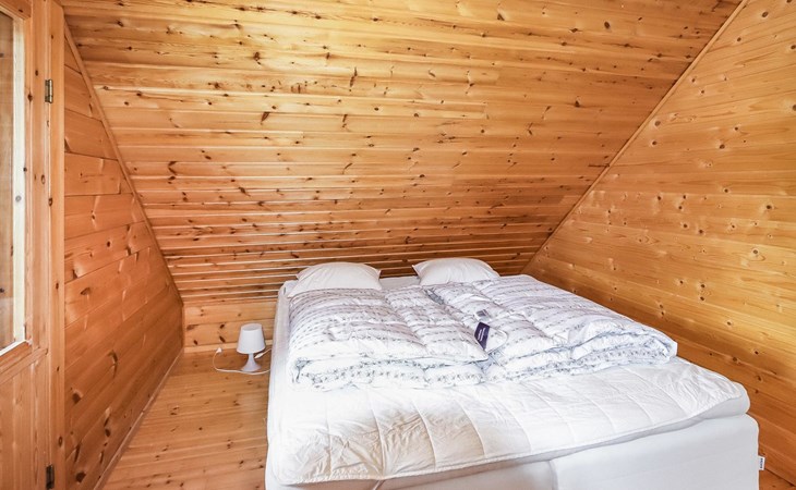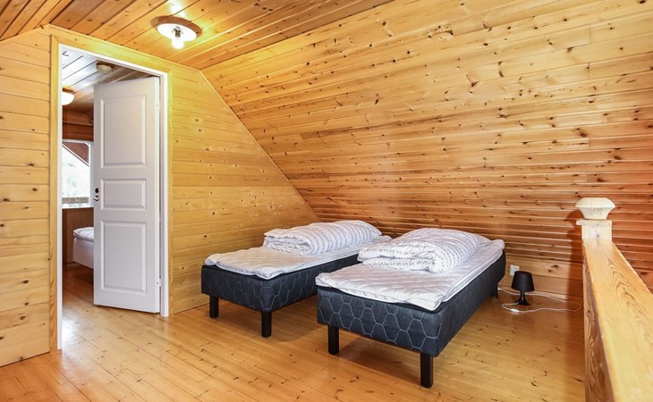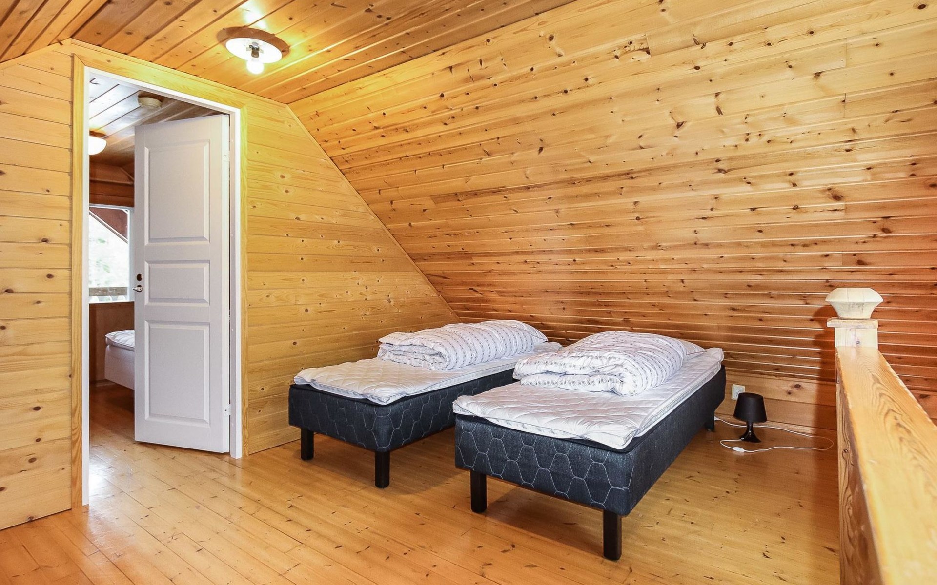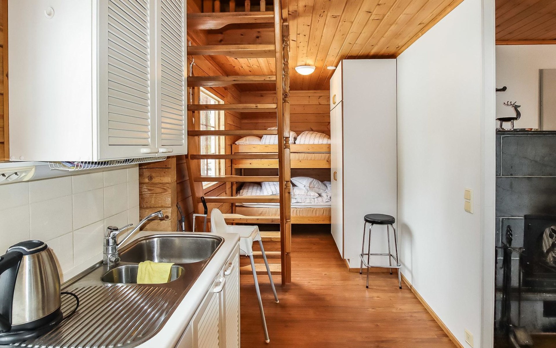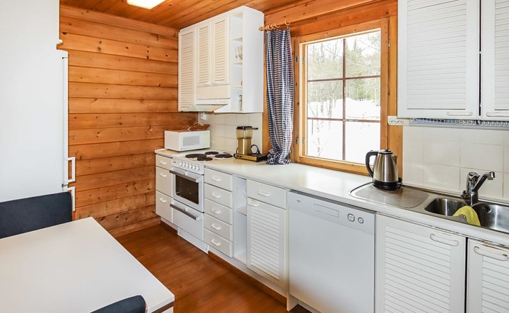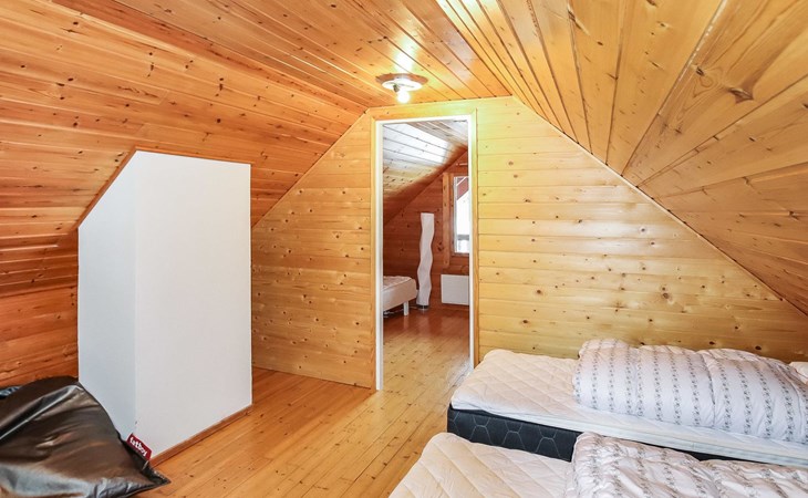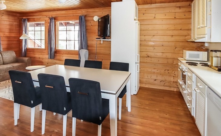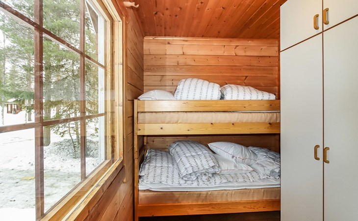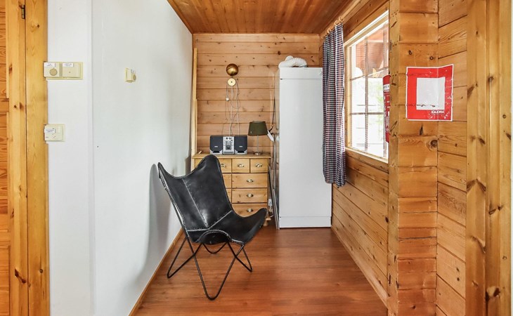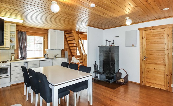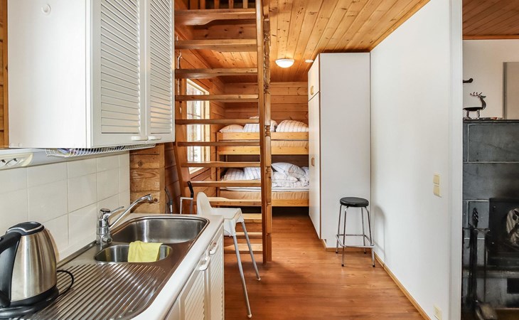 Kitchen, 2 sleeping corner, loft, sauna, shower room/toilet, balcony, fireplace, bunk beds in the sleeping corners, 4 beds on the loft.
