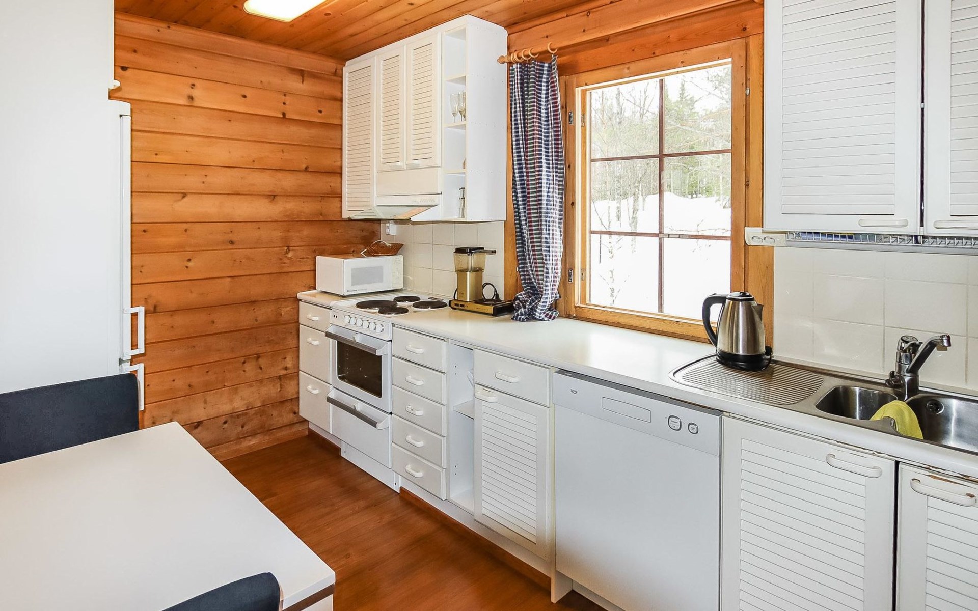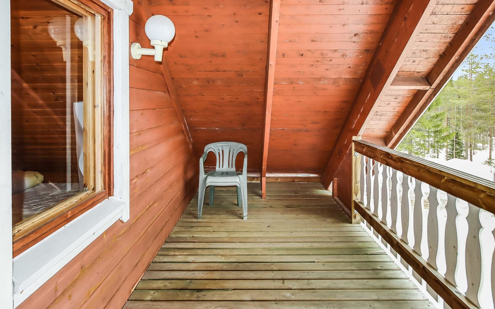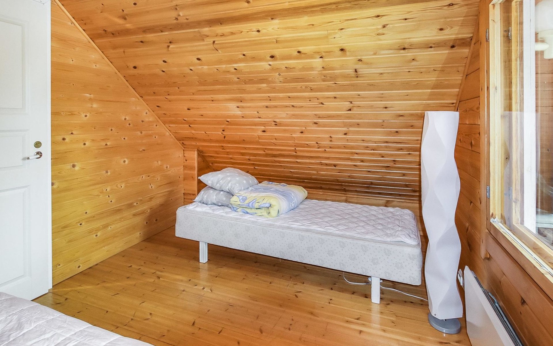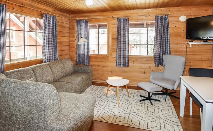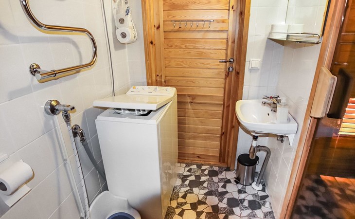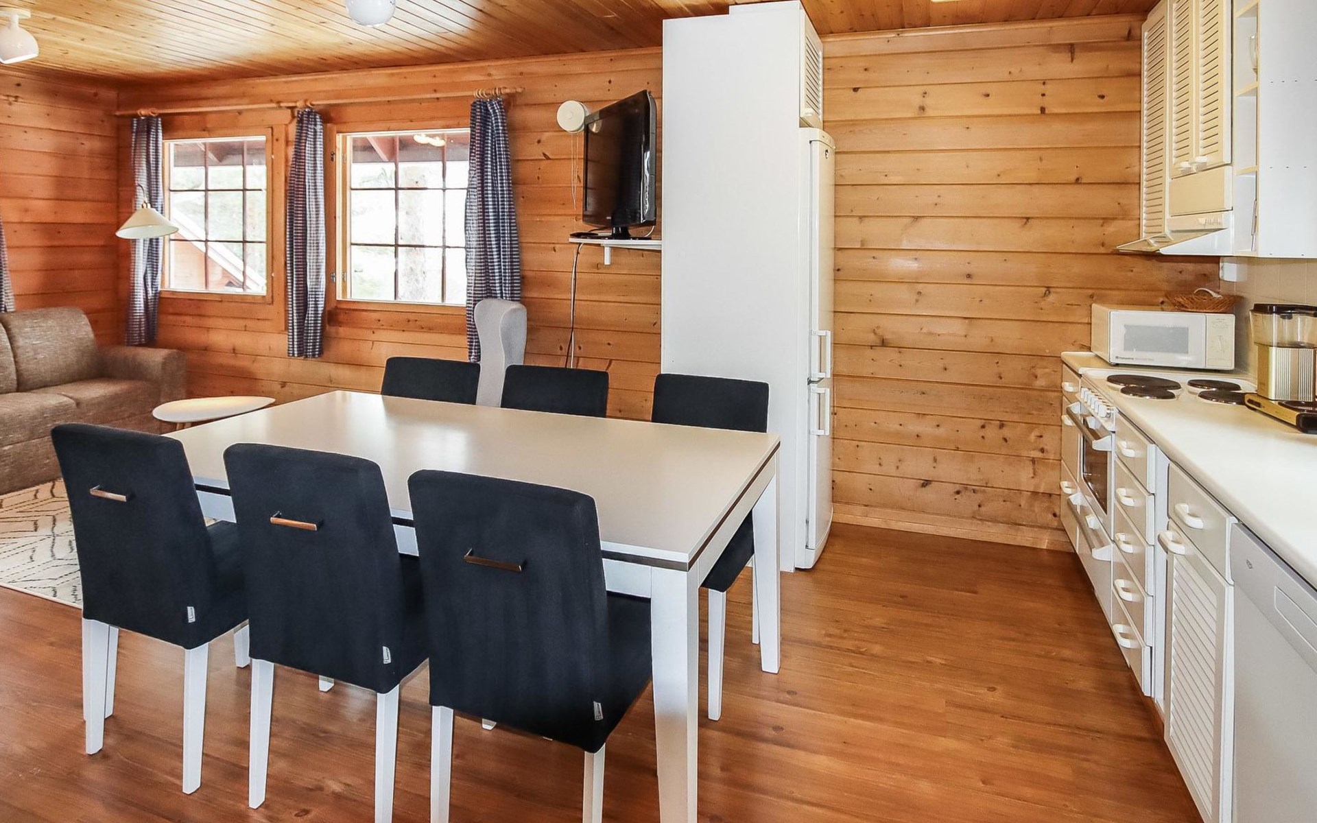 Kitchen, 2 sleeping corner, loft, sauna, shower room/toilet, balcony, fireplace, bunk beds in the sleeping corners, 4 beds on the loft.