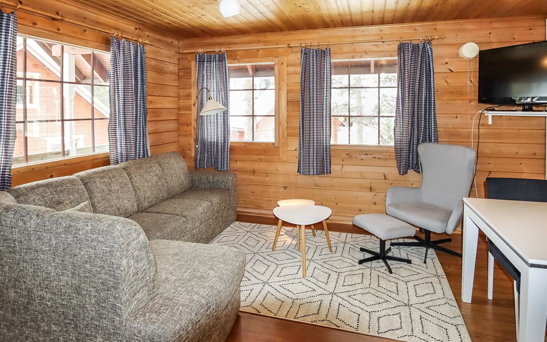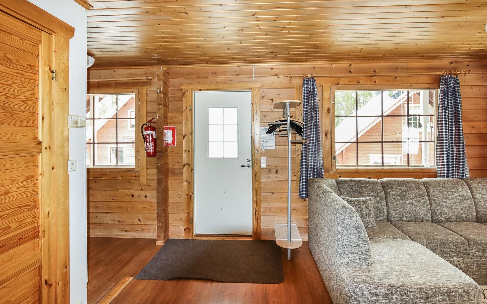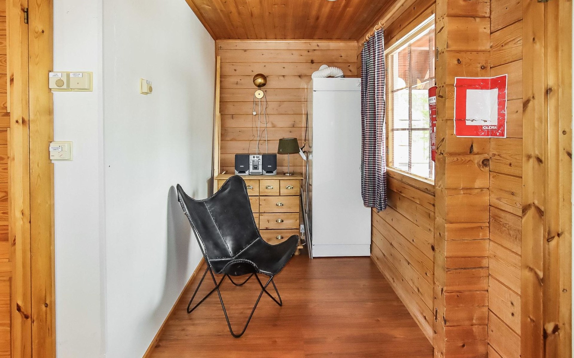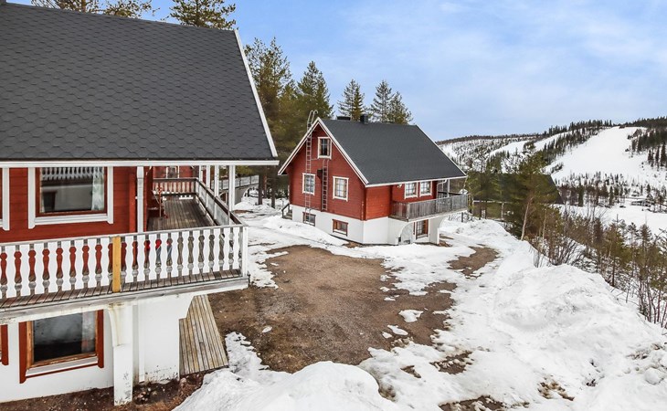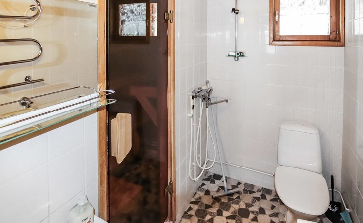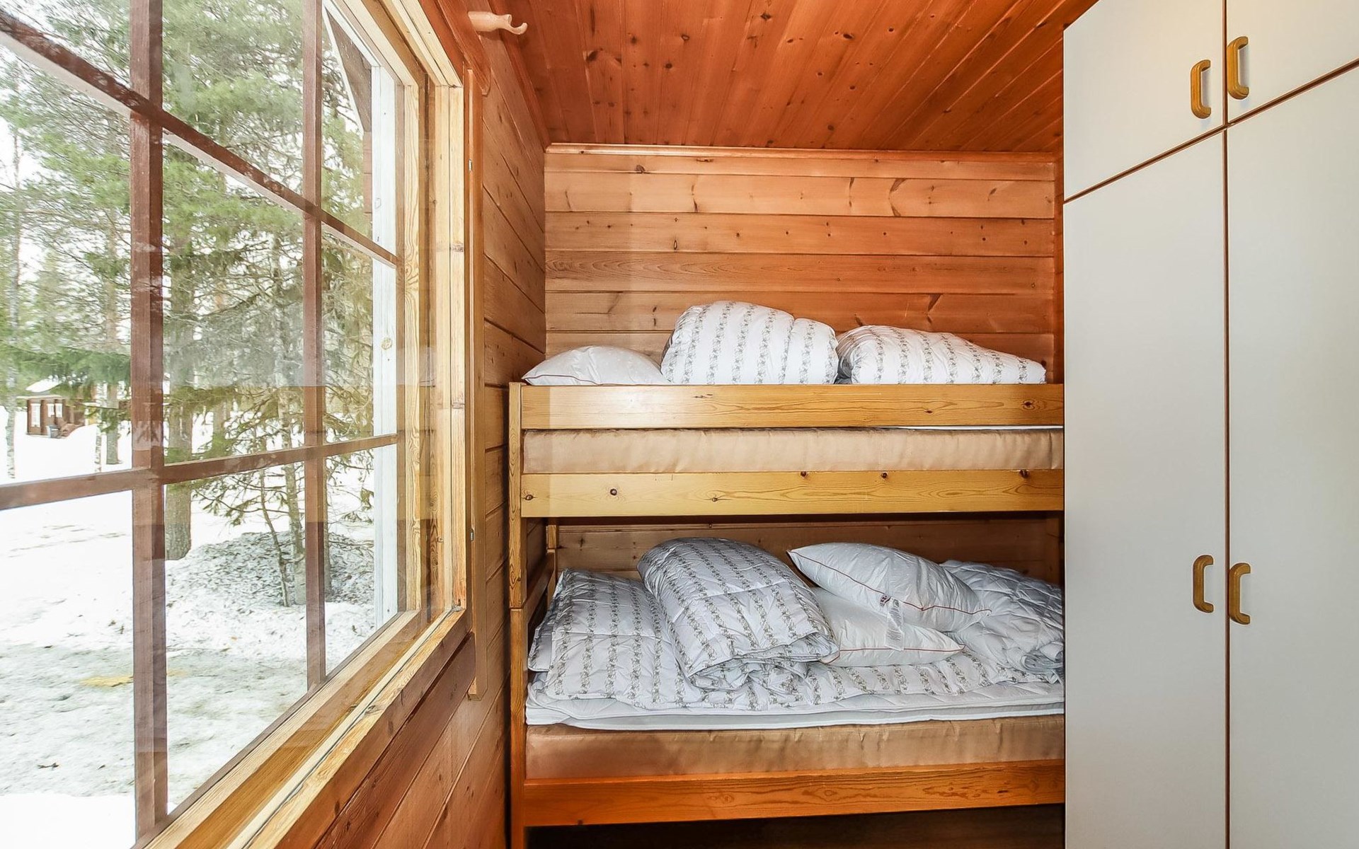 Kitchen, 2 sleeping corner, loft, sauna, shower room/toilet, balcony, fireplace, bunk beds in the sleeping corners, 4 beds on the loft.