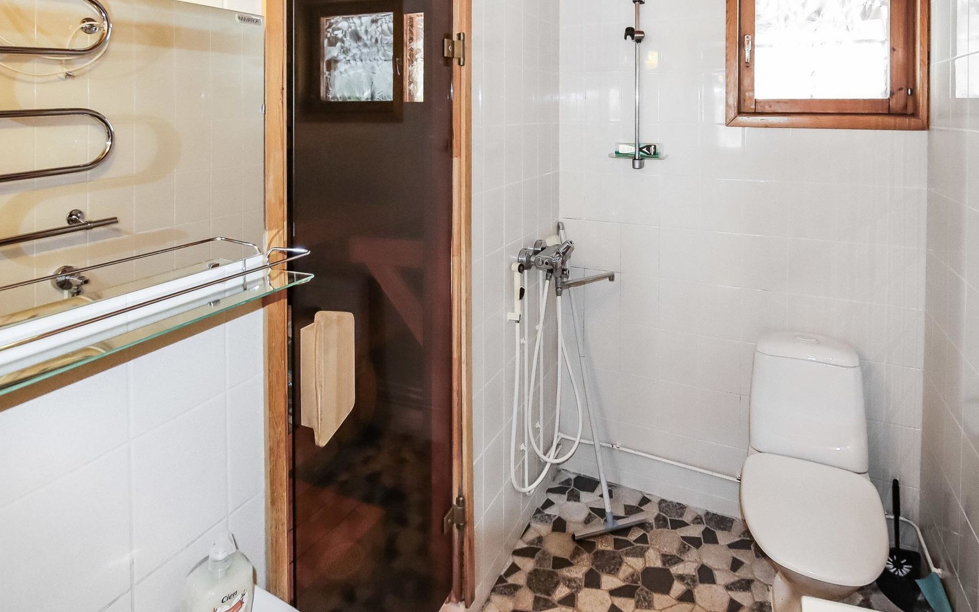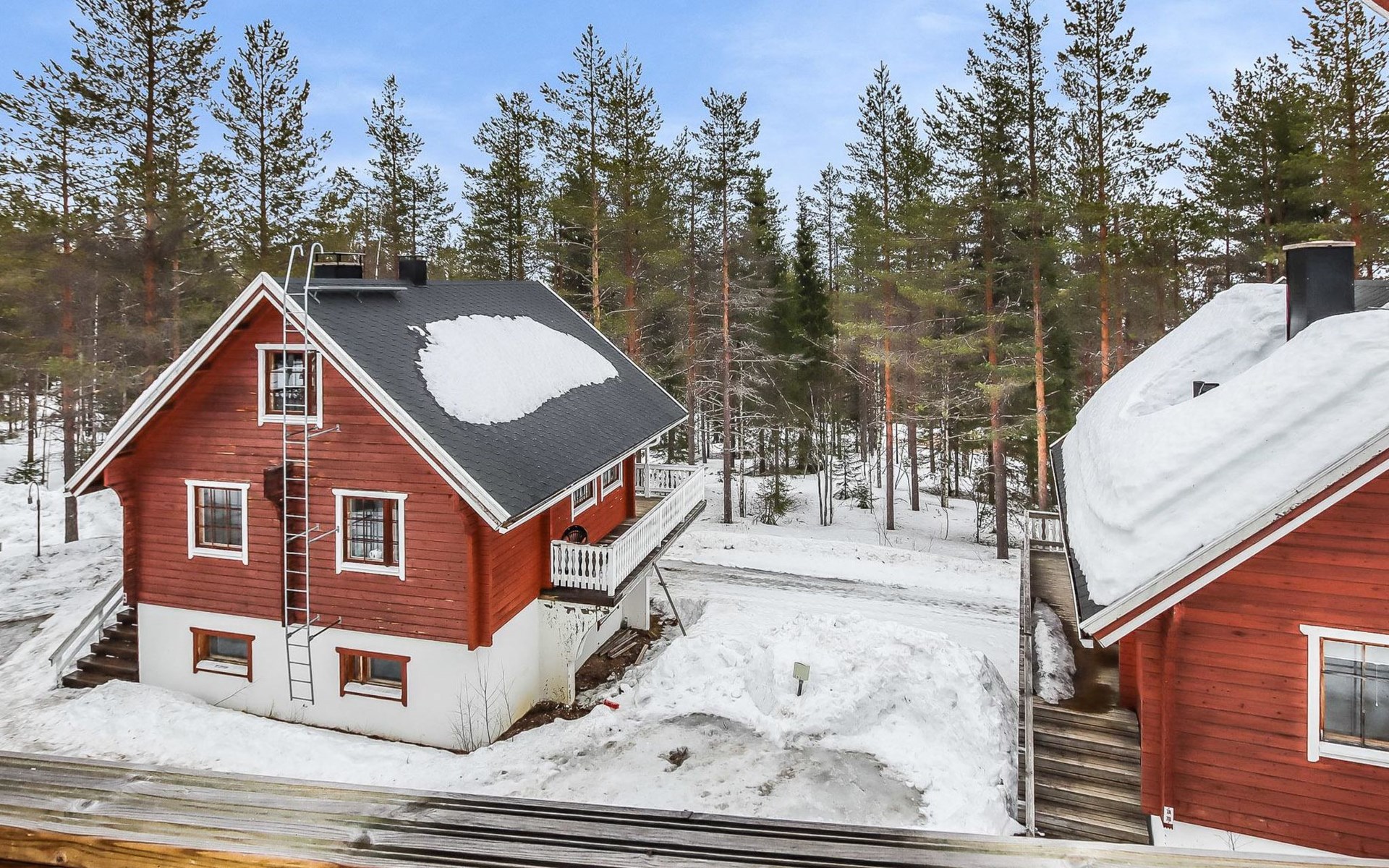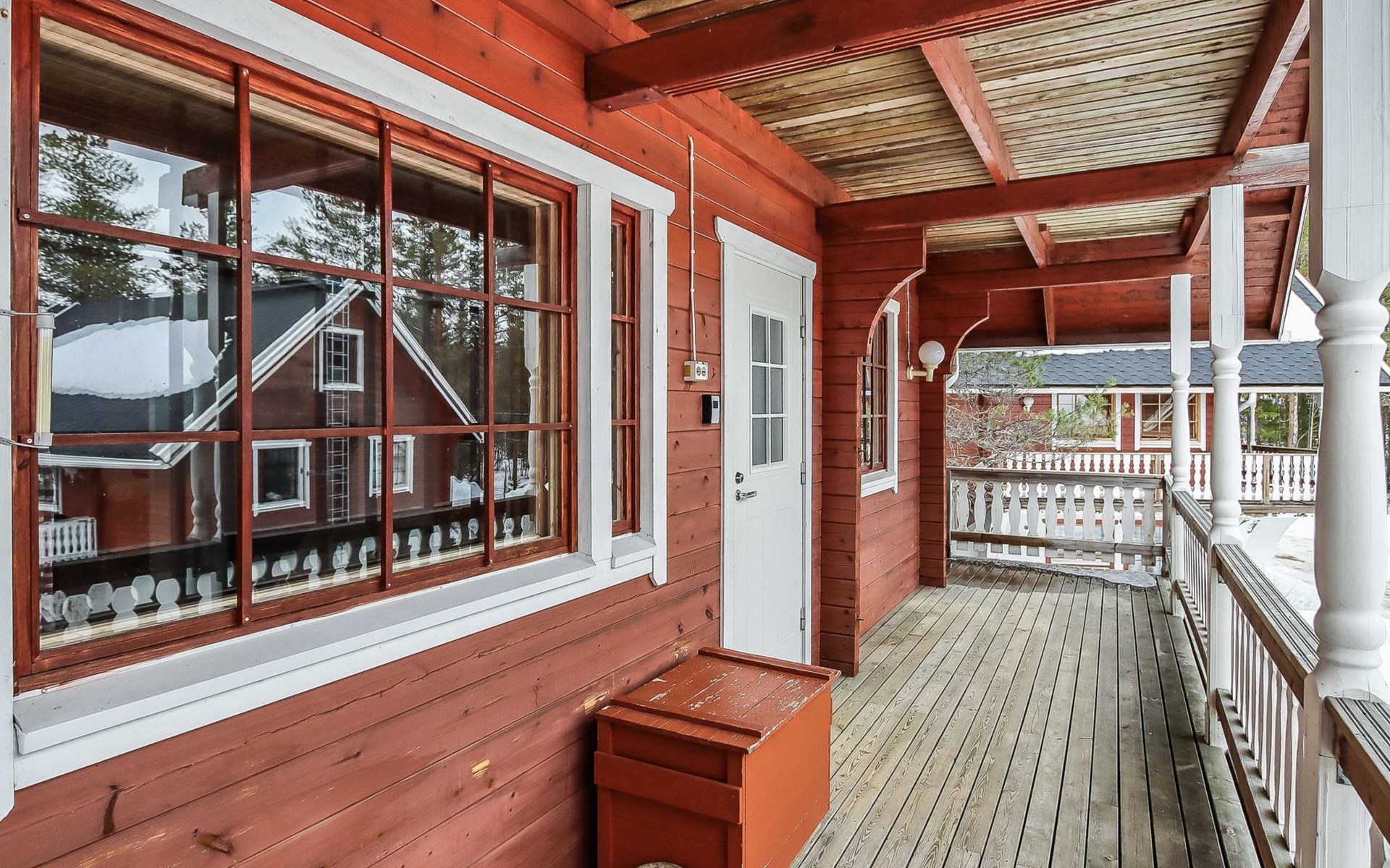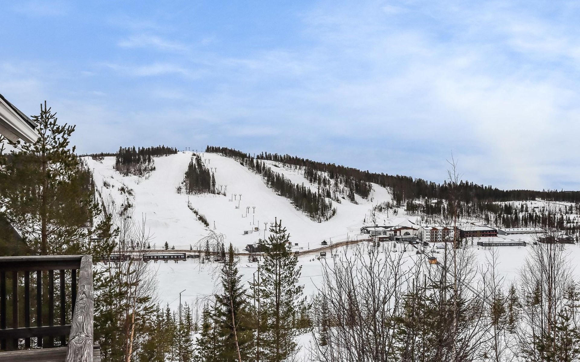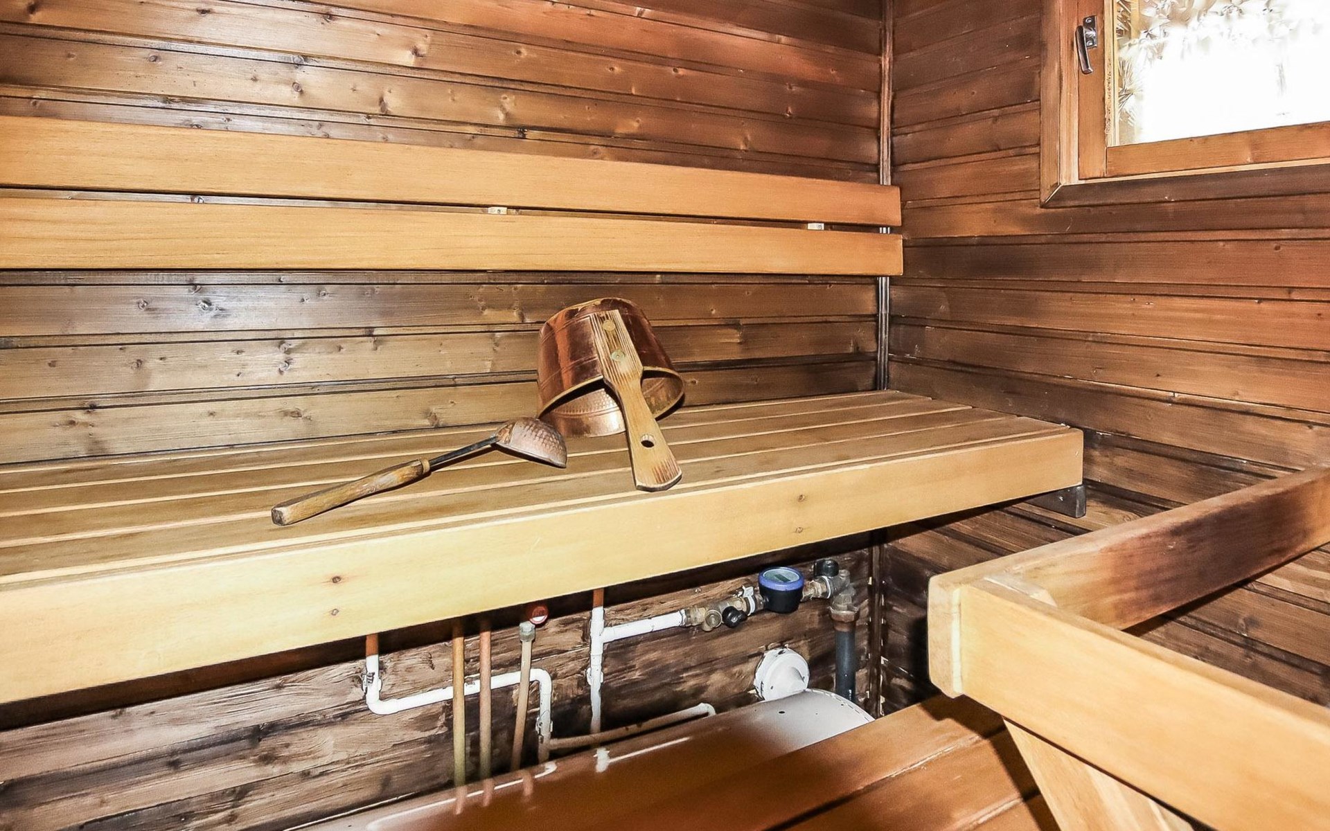 Kitchen, 2 sleeping corner, loft, sauna, shower room/toilet, balcony, fireplace, bunk beds in the sleeping corners, 4 beds on the loft.