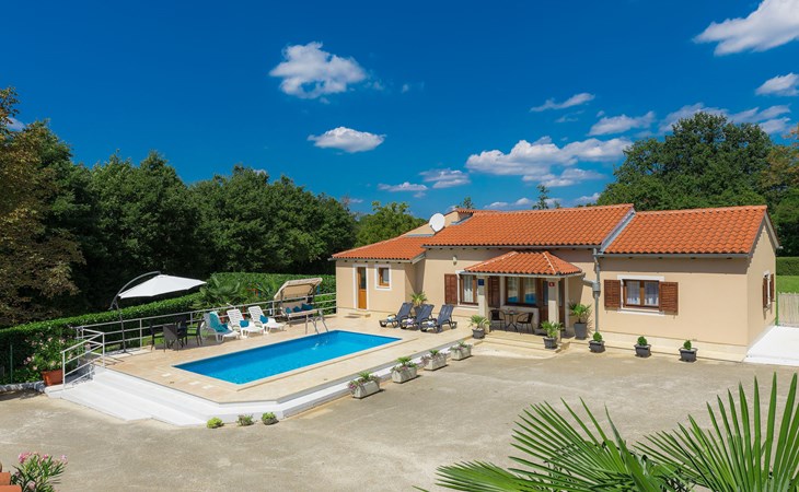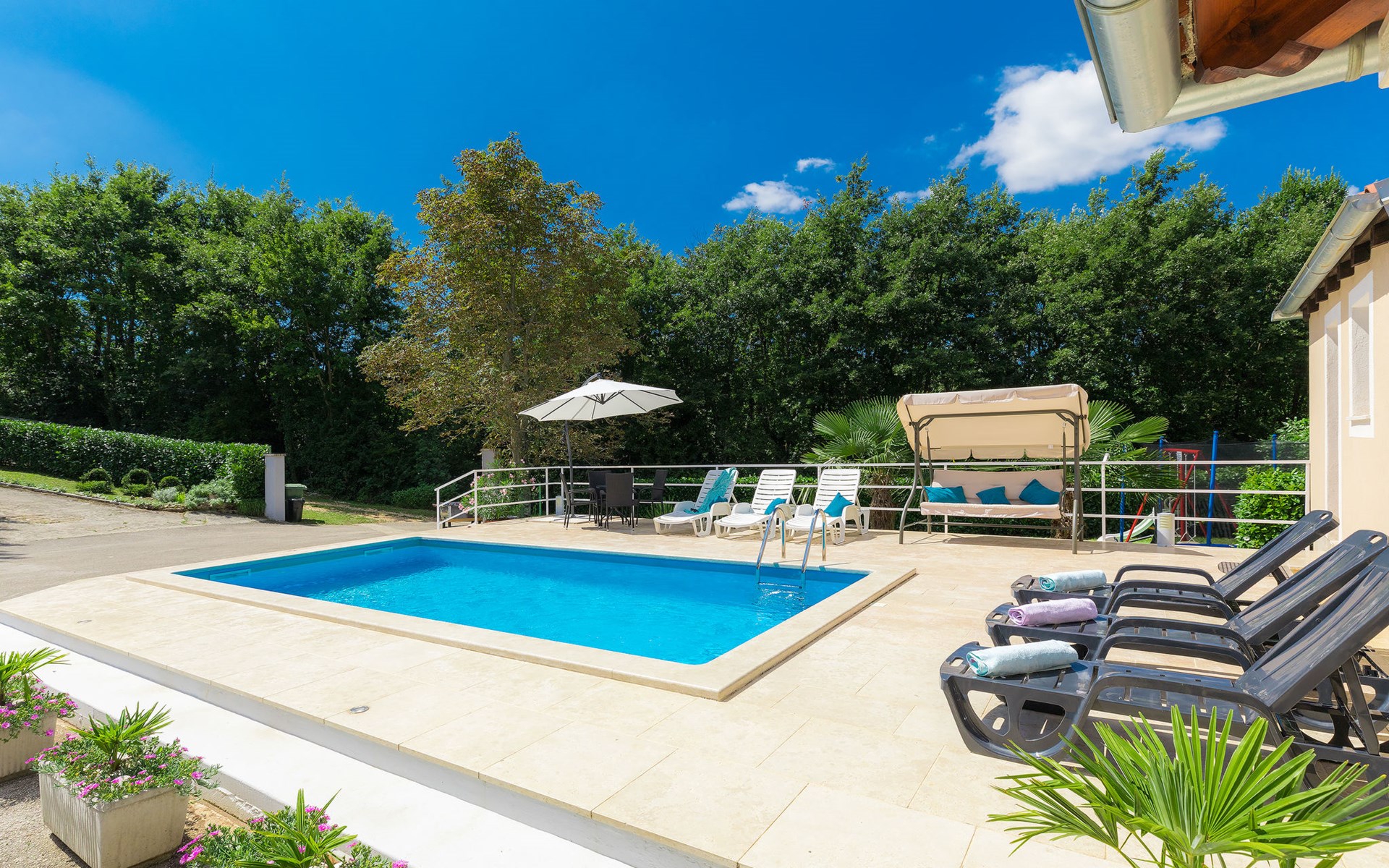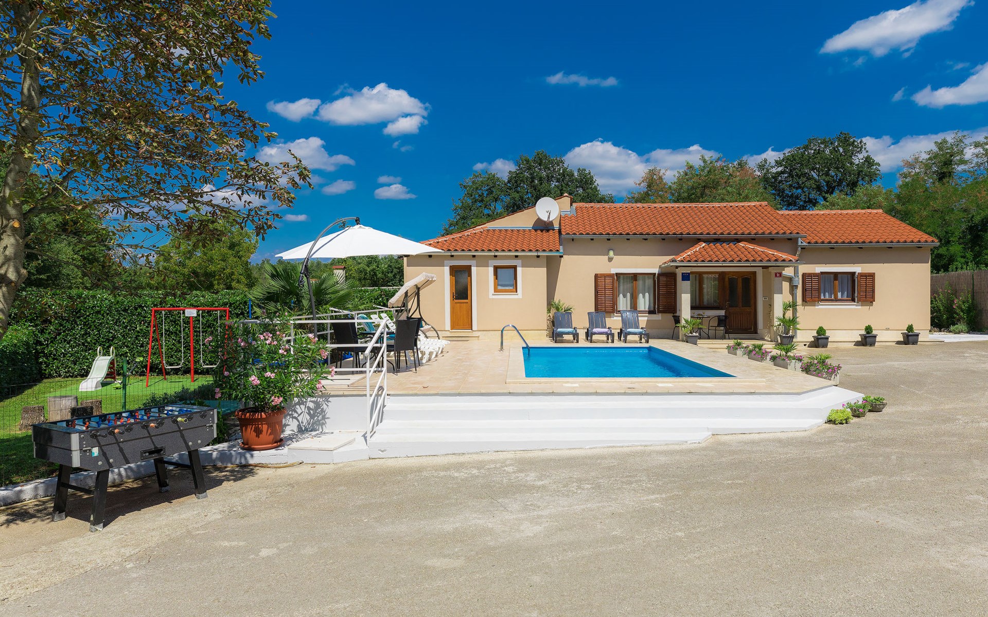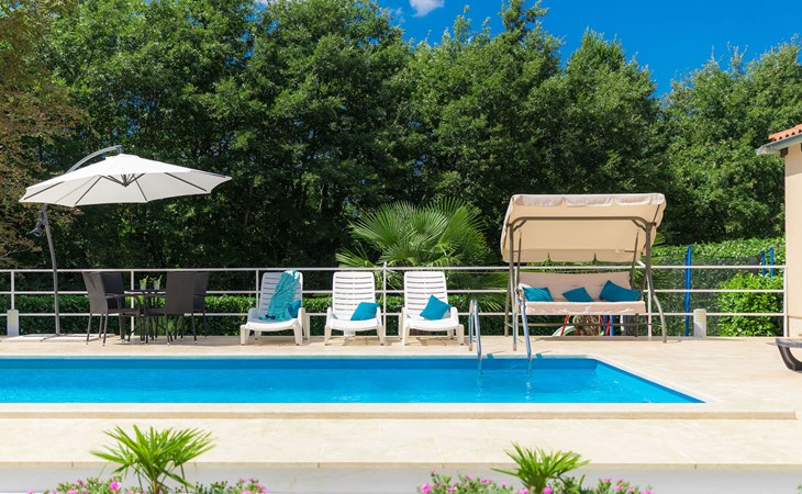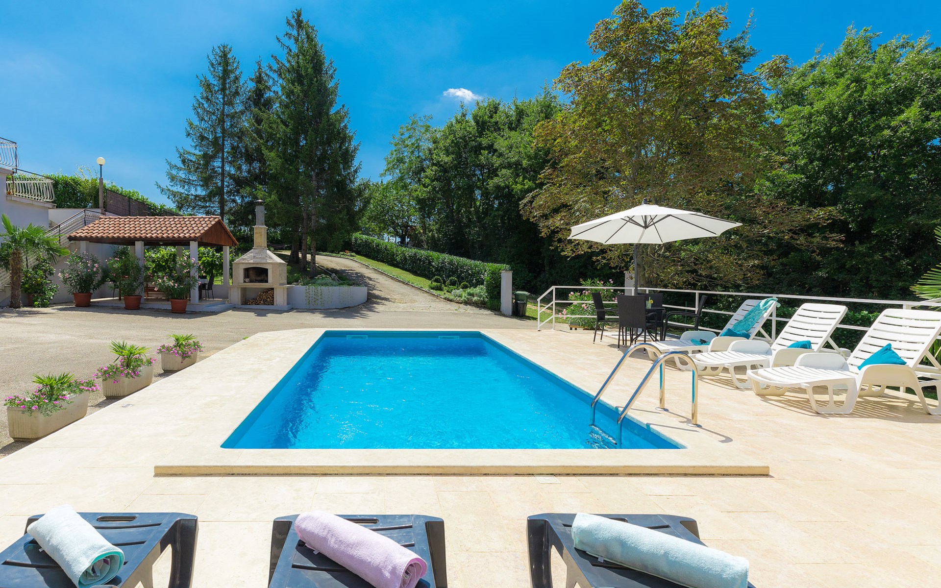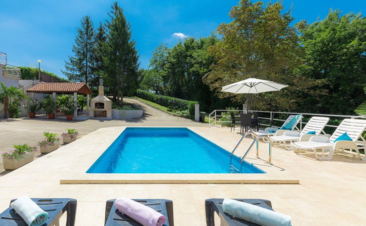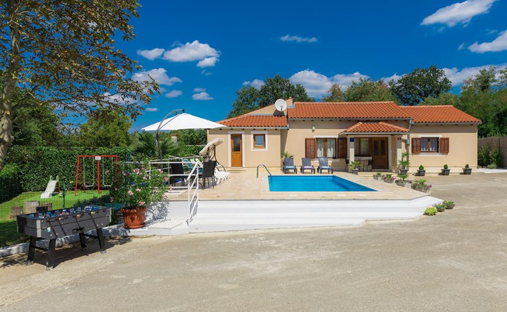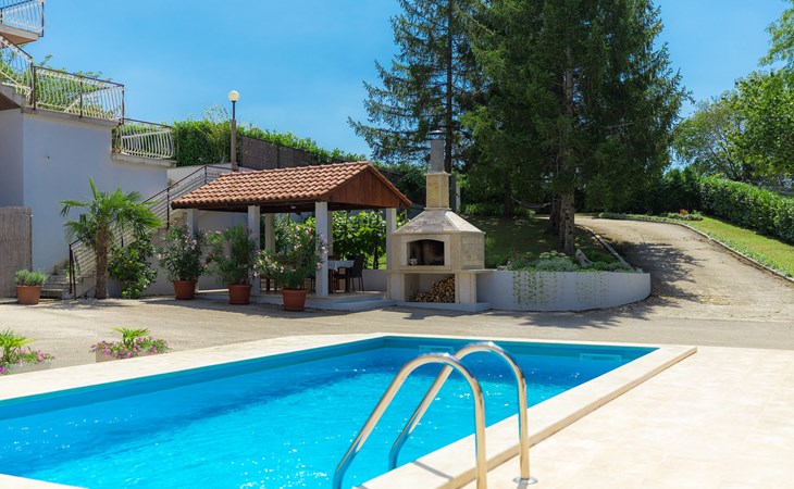 Eengezinswoning "Liberat". In het gehucht Zgrablići, 3 km van het centrum van Žminj, 20 km van zee. Voor medegebruik: terrein 5.000 m2 met gazon en planten. Voor alleengebruik: openluchtzwembad hoekig (7 x 3 m, 23 m2, 130 cm diepte, seizoensgebonden beschikbaarheid: 15.Mei. - 30.Sep.). WC bij het zwembad, buitendouche, prieel, terras, tuinmeubelen, barbecue, kinderspeelplaats (glijbaan, schommel). In het huis: internetaansluiting, wasmachine. Parkeerplaats op het terrein. Winkel 3 km, supermarkt 3 km, restaurant 1 km, bushalte 4 km, rotsstrand 28 km. De eigenaar woont op hetzelfde terrein.