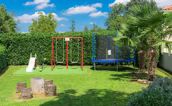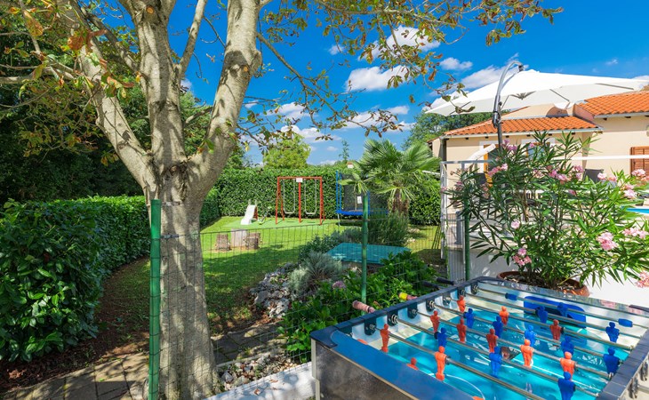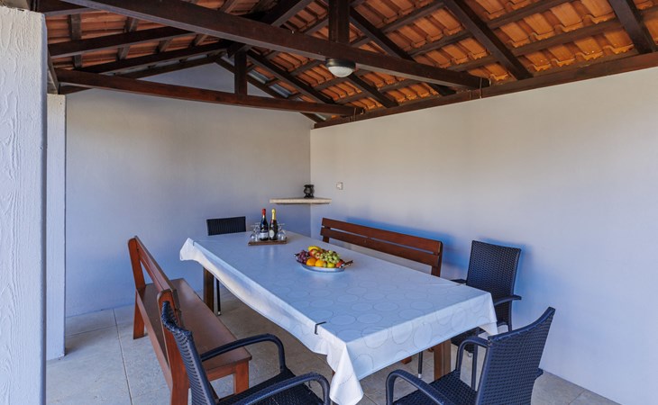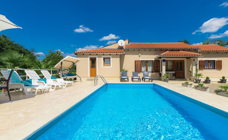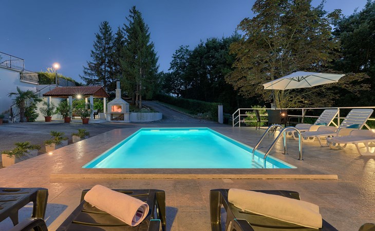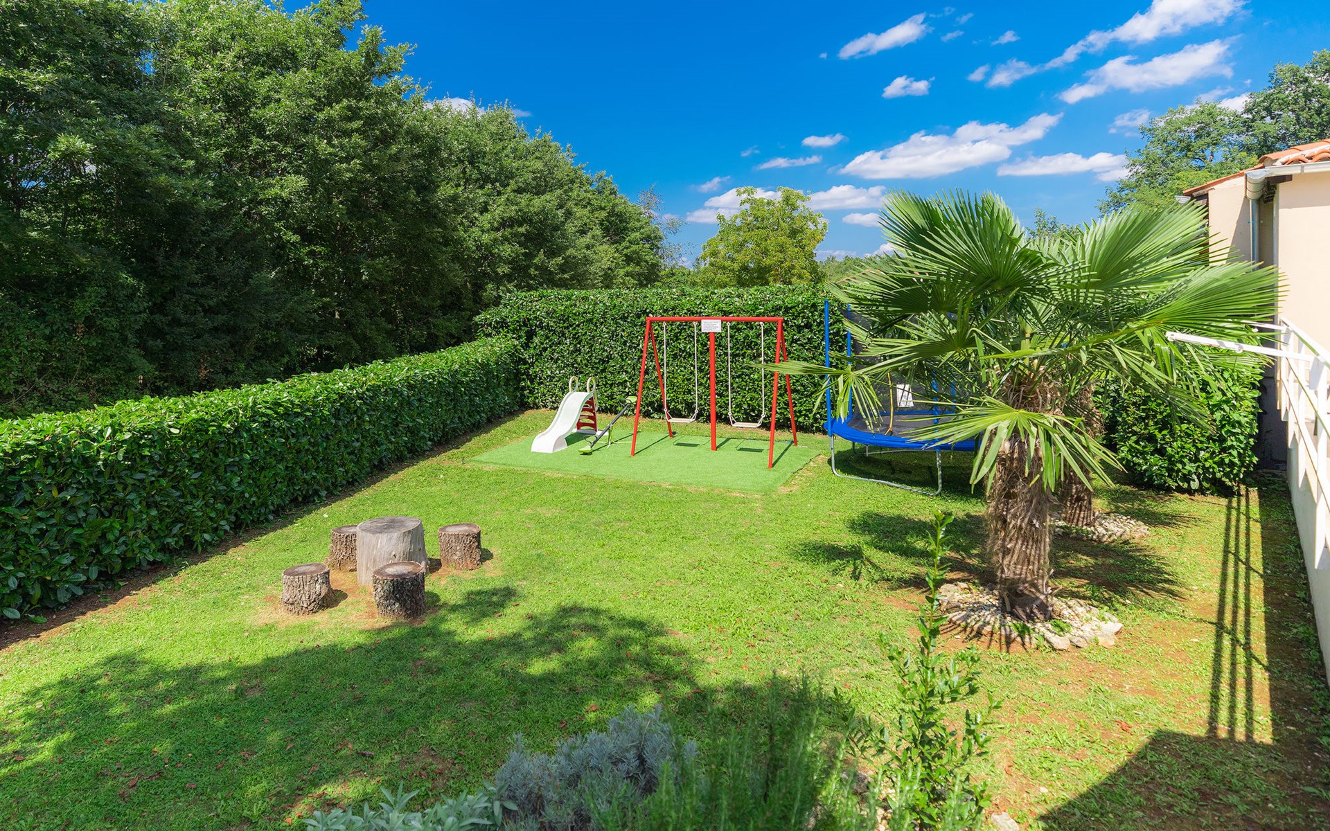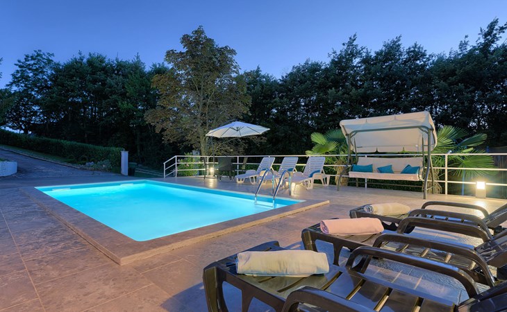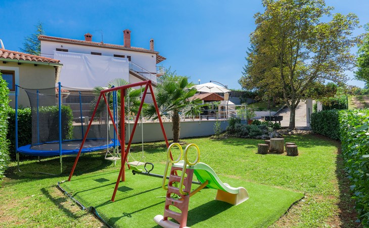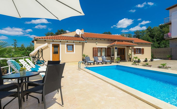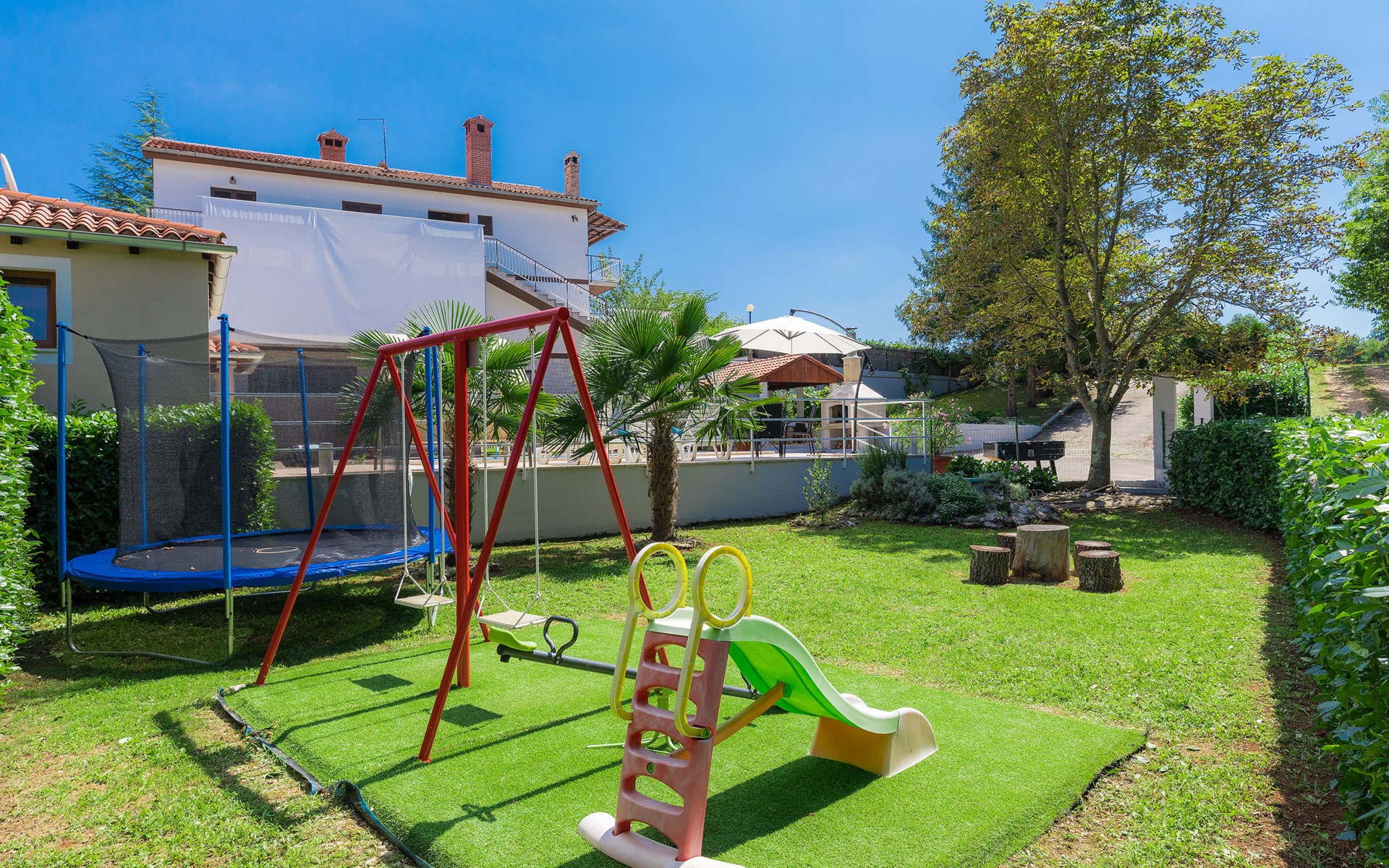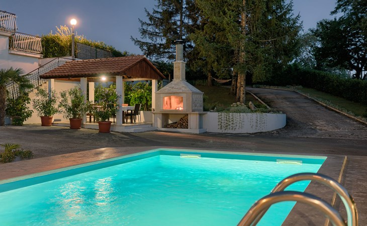 Eengezinswoning "Liberat". In het gehucht Zgrablići, 3 km van het centrum van Žminj, 20 km van zee. Voor medegebruik: terrein 5.000 m2 met gazon en planten. Voor alleengebruik: openluchtzwembad hoekig (7 x 3 m, 23 m2, 130 cm diepte, seizoensgebonden beschikbaarheid: 15.Mei. - 30.Sep.). WC bij het zwembad, buitendouche, prieel, terras, tuinmeubelen, barbecue, kinderspeelplaats (glijbaan, schommel). In het huis: internetaansluiting, wasmachine. Parkeerplaats op het terrein. Winkel 3 km, supermarkt 3 km, restaurant 1 km, bushalte 4 km, rotsstrand 28 km. De eigenaar woont op hetzelfde terrein.