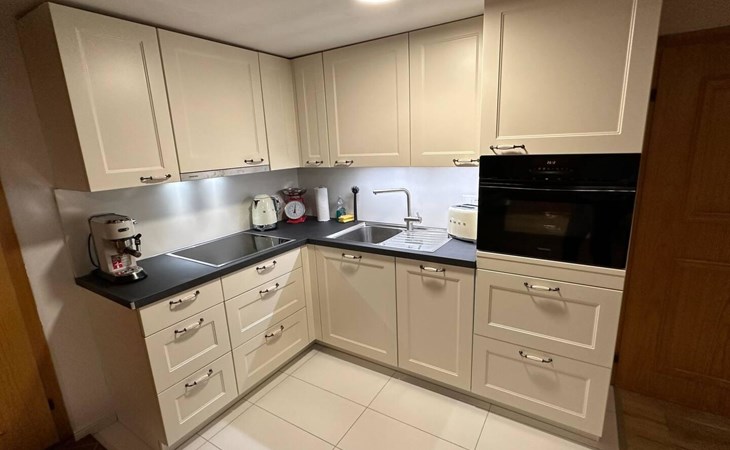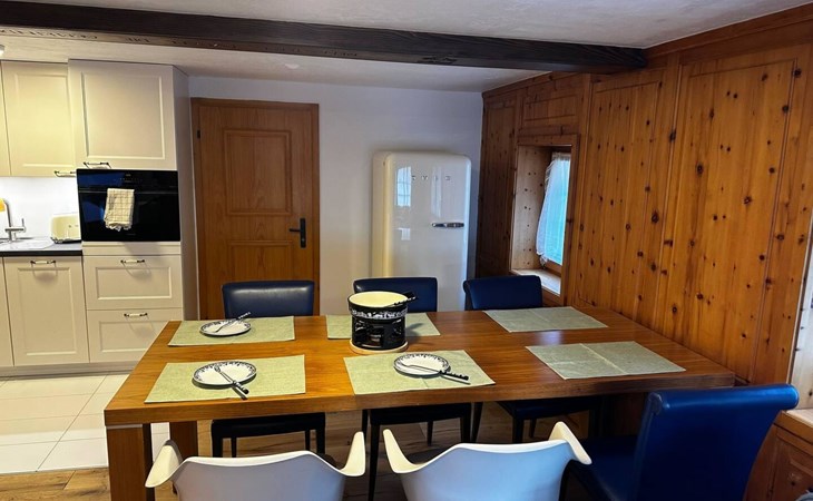 The apartment has 3.5 rooms and accommodates up to 8 people. You will find four single beds and two sofas, all designed for comfort and relaxation. The fully equipped kitchen is a dream for every amateur chef. It features an induction stove, an oven, and a microwave to assist you in preparing your meals. A large SMEG refrigerator provides ample space for all your food and beverages. There is also a large dining table where you can enjoy meals together. If you need to work during your stay, there are two separate work areas that are perfect for a home office. The “Old Community Room” combines historical charm with modern comfort and is the perfect place for your next vacation or business trip. We look forward to welcoming you!