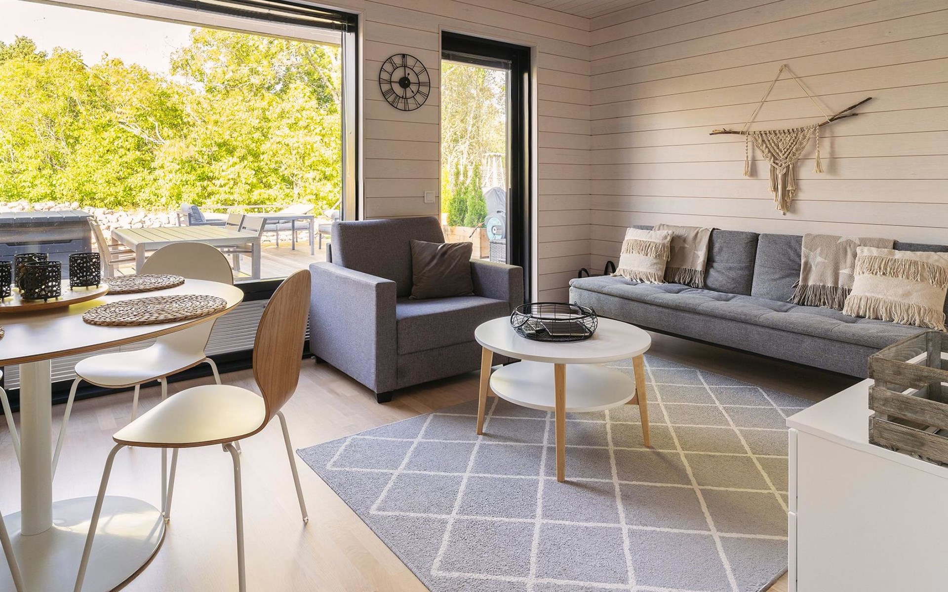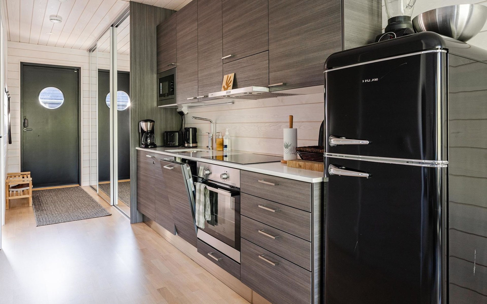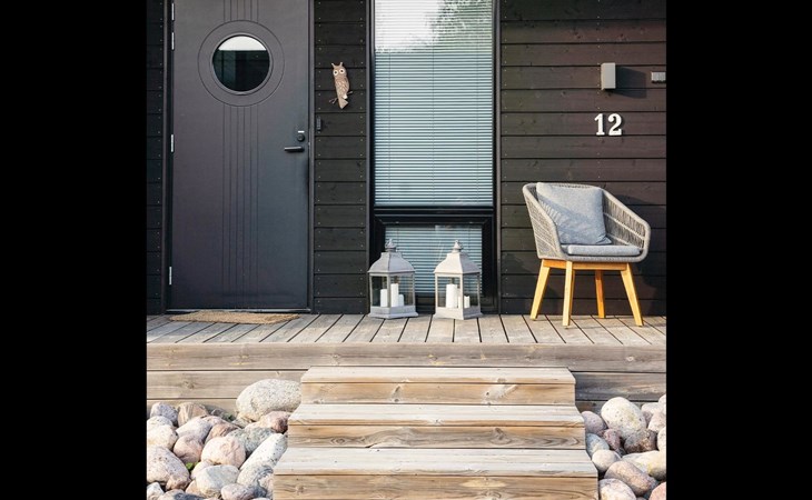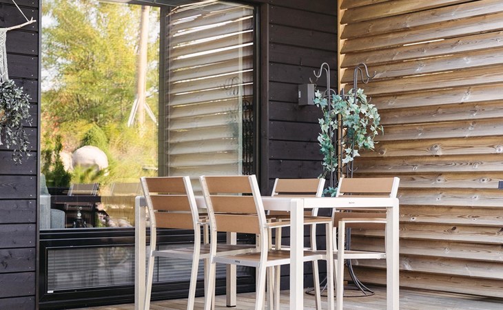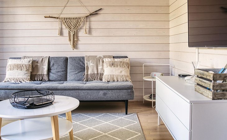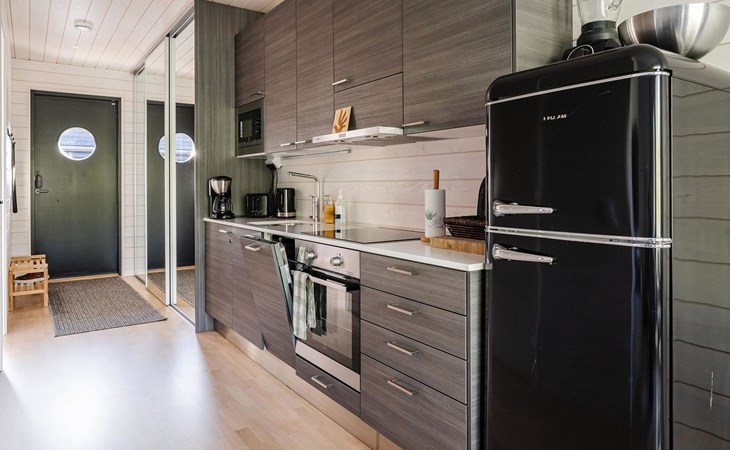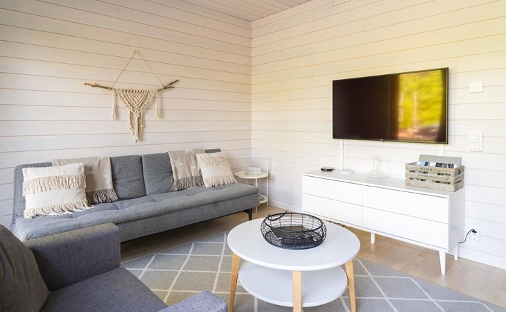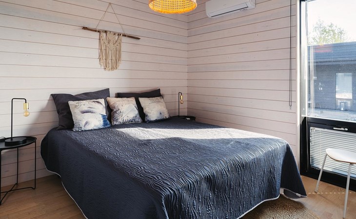 Magnificent 45 m² holiday apartment, built in May 2019. Living room with sofa bed 120 cm wide, chair (can be opened to a 80 cm extra bed), kitchen, bedroom with two 90 cm wide beds, electric sauna, shower, separate WC, air source heat pump (for cooling), high-speed wired internet connection.