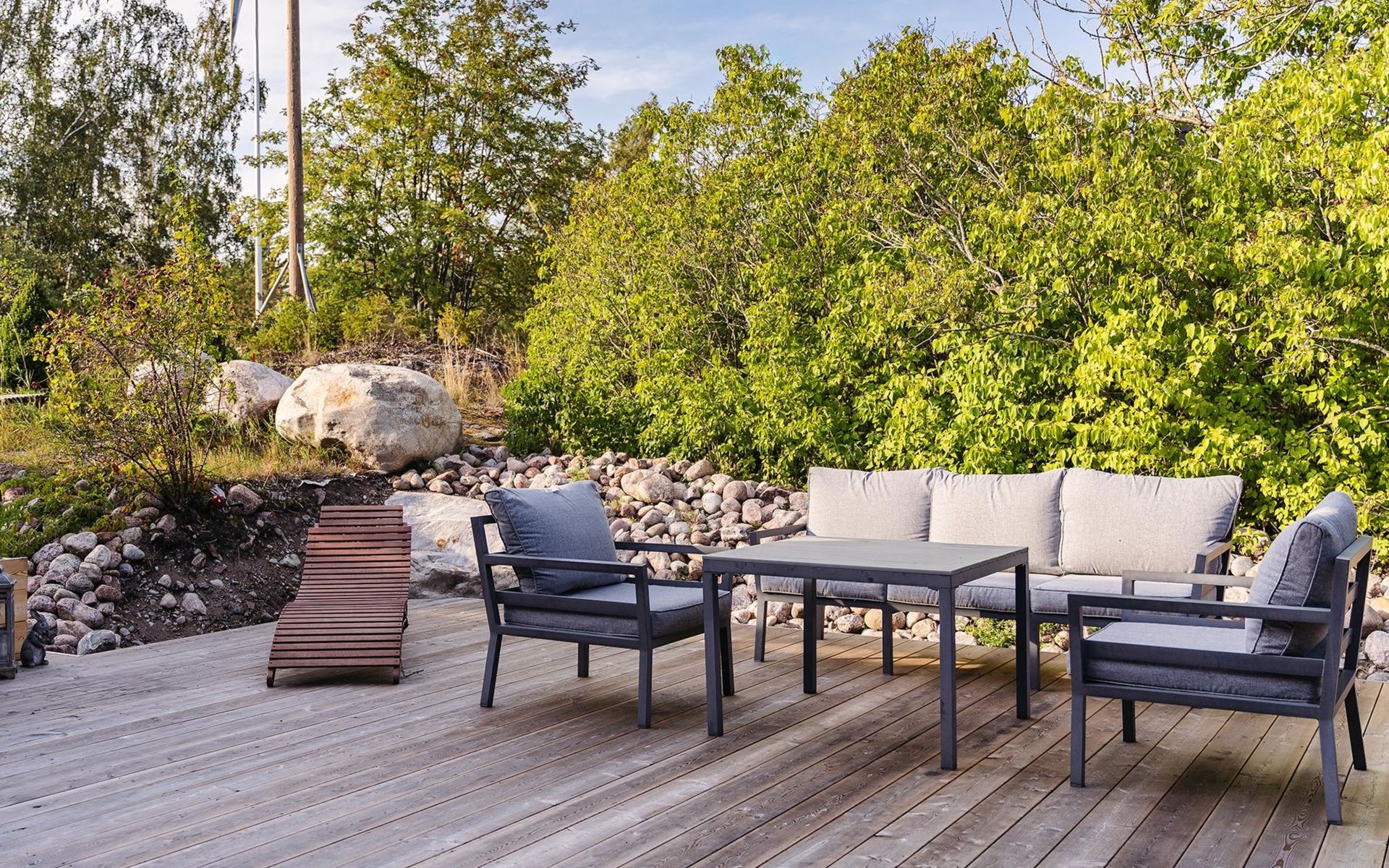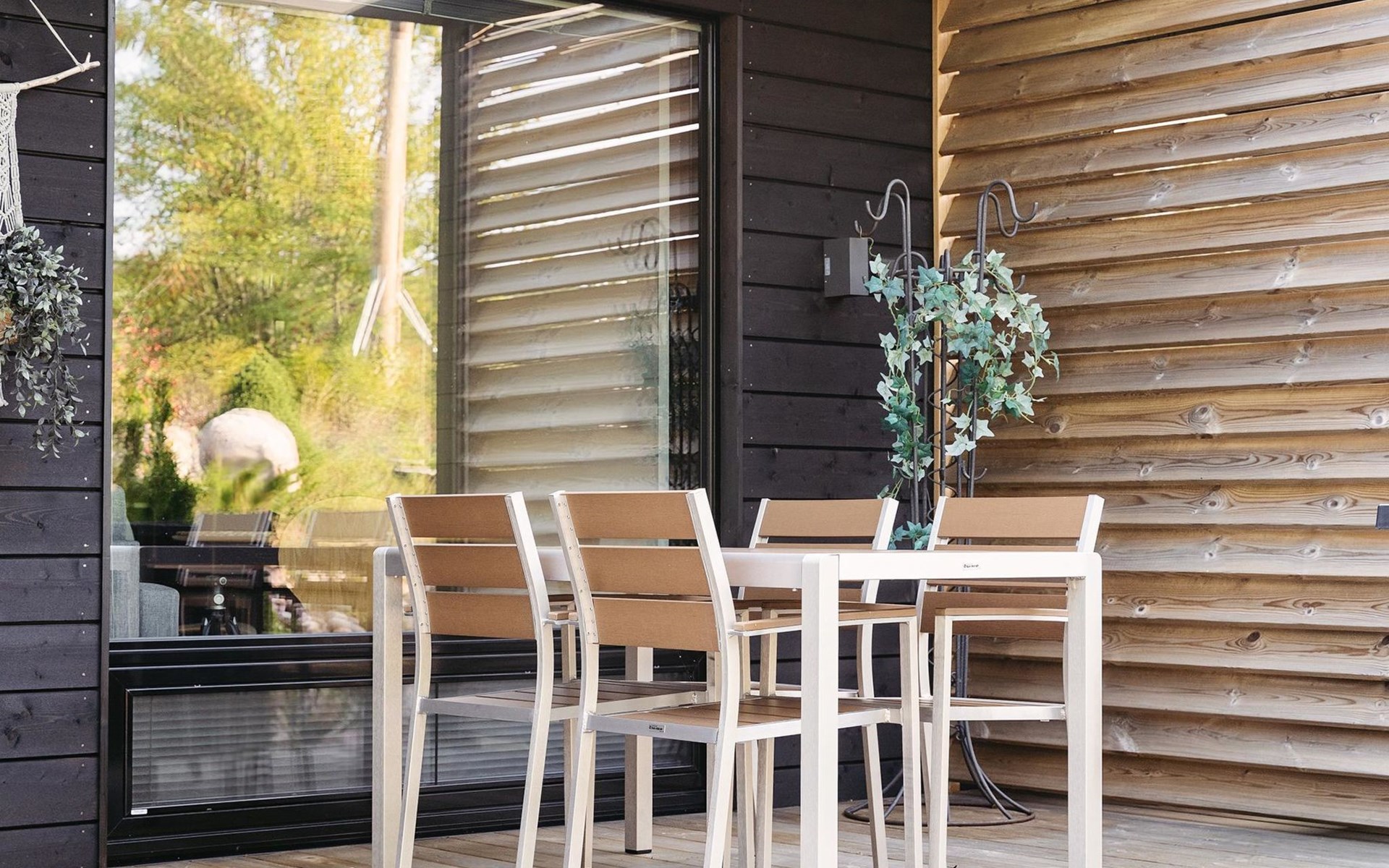 Partially covered terrace with wooden furniture.