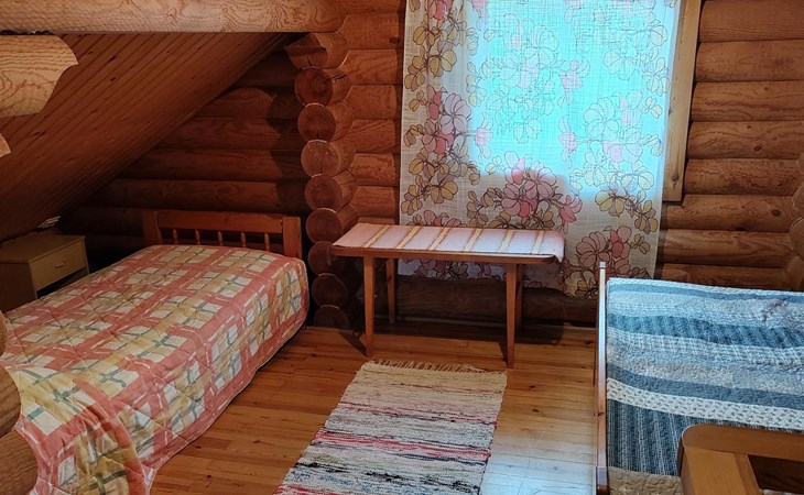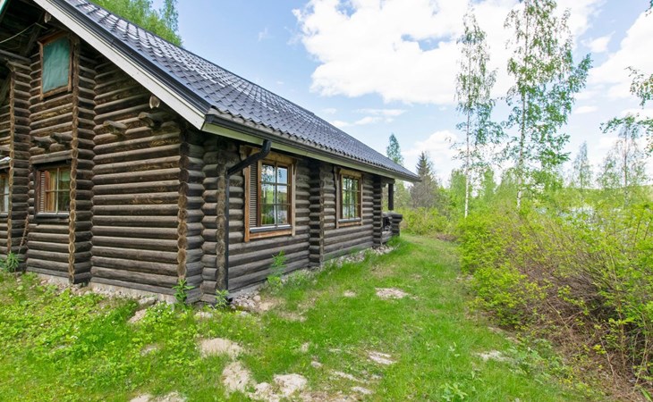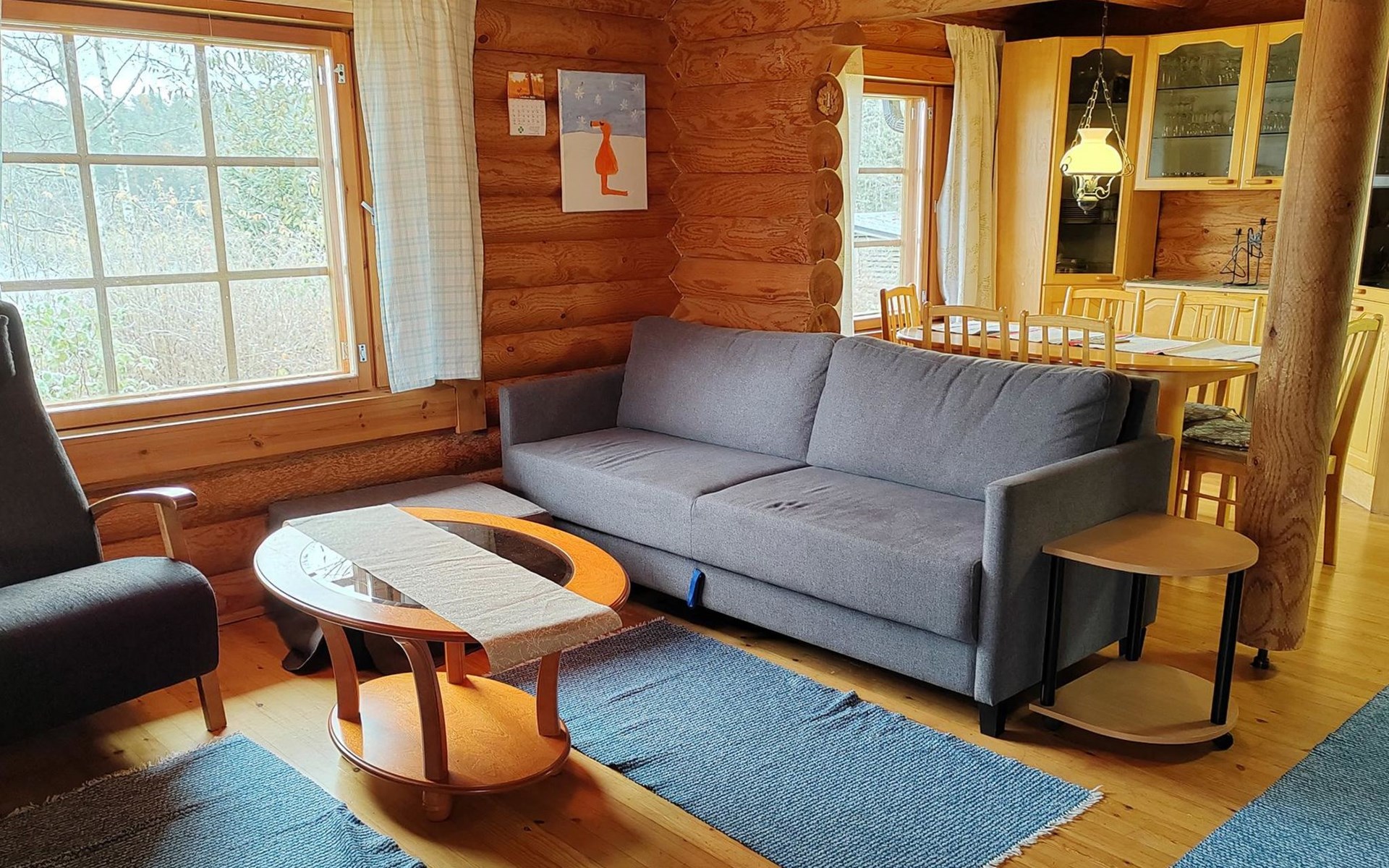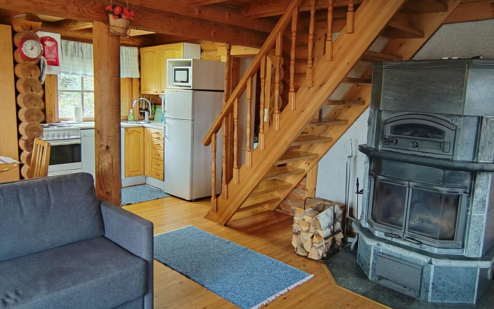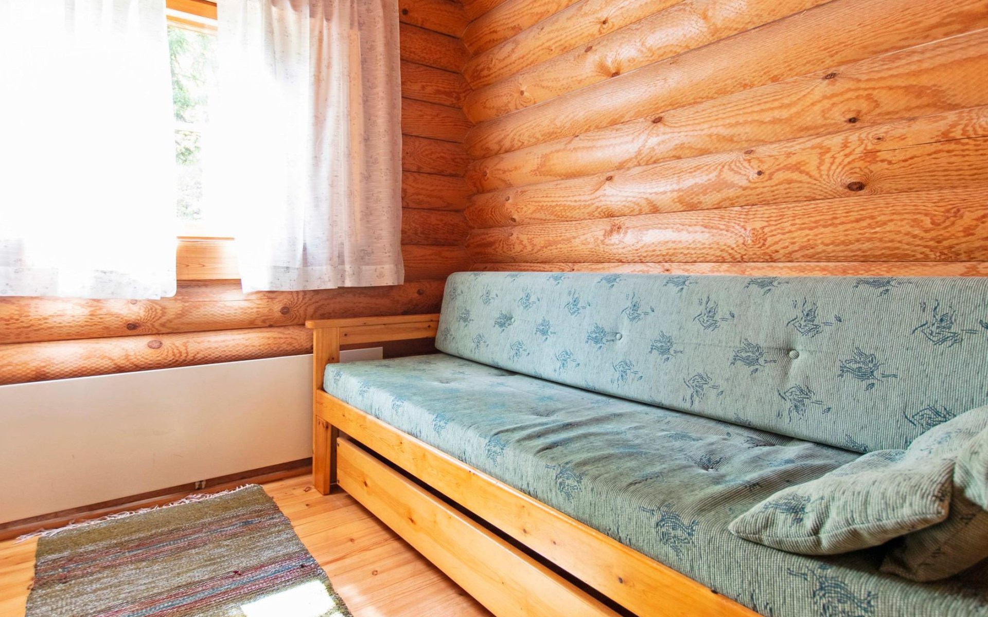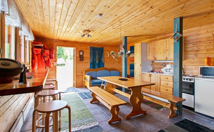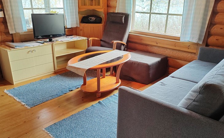 Log-built cabin (built in 1993), living room (sofa bed), bedroom (sofa bed, 140x190 cm extra bed for two), living room / kitchen, washroom with WC, sauna (wood-burning sauna stove), loft with double bed and one single bed (75 x 190 cm) and travel cot for a child.