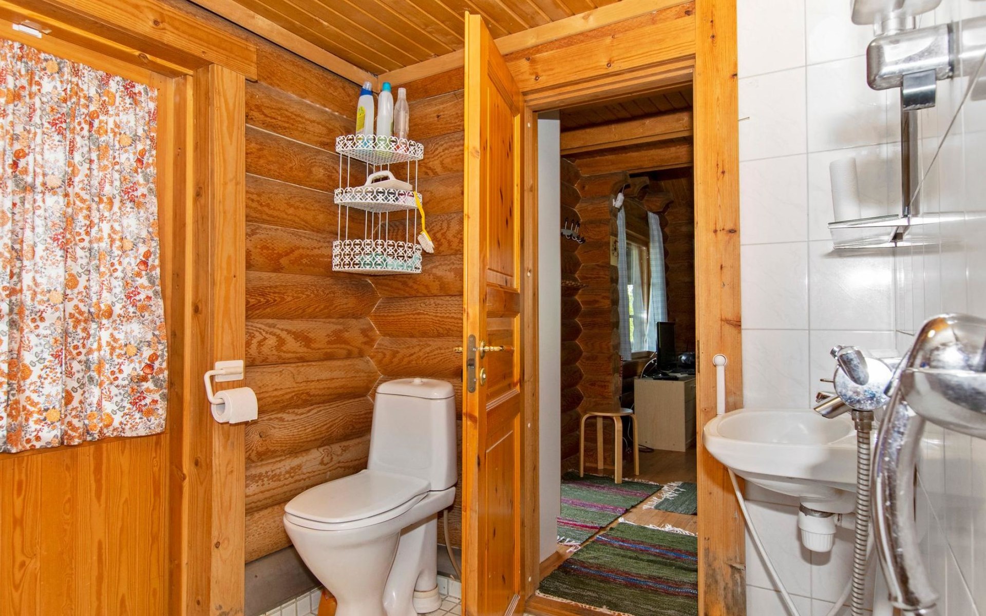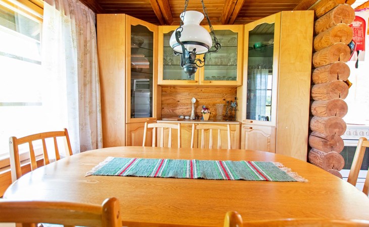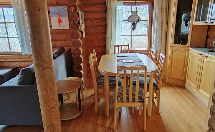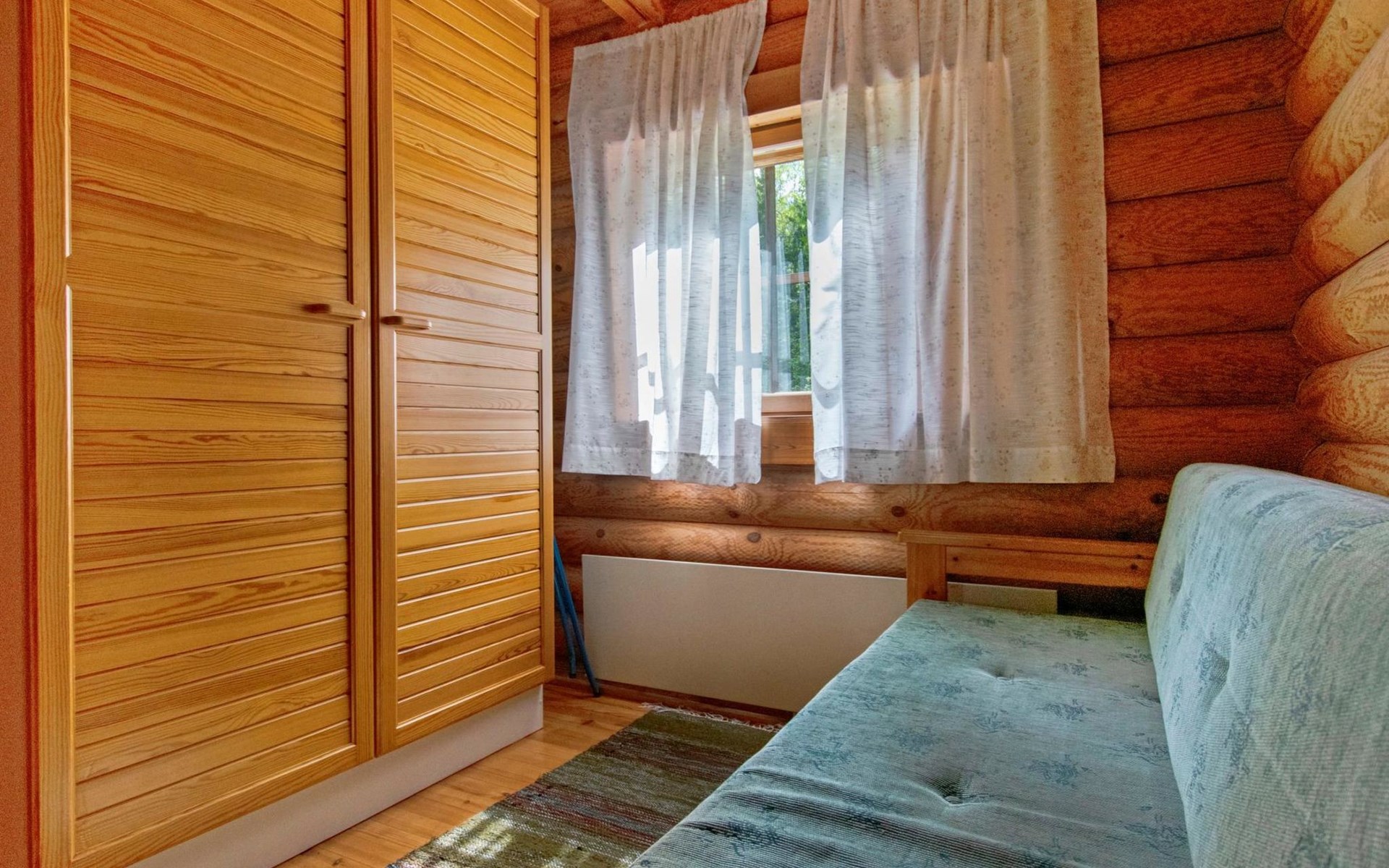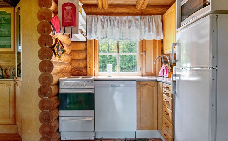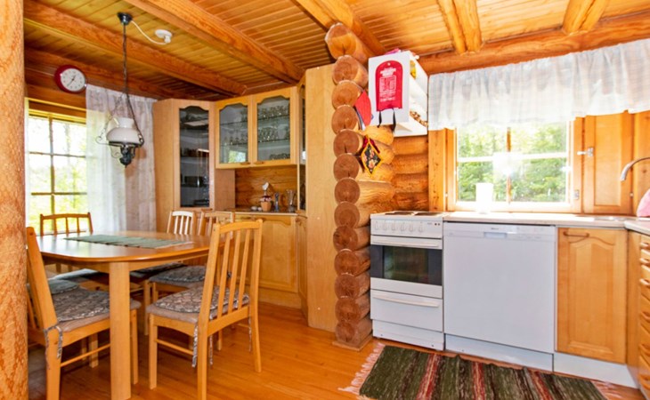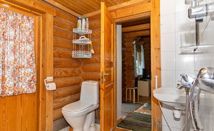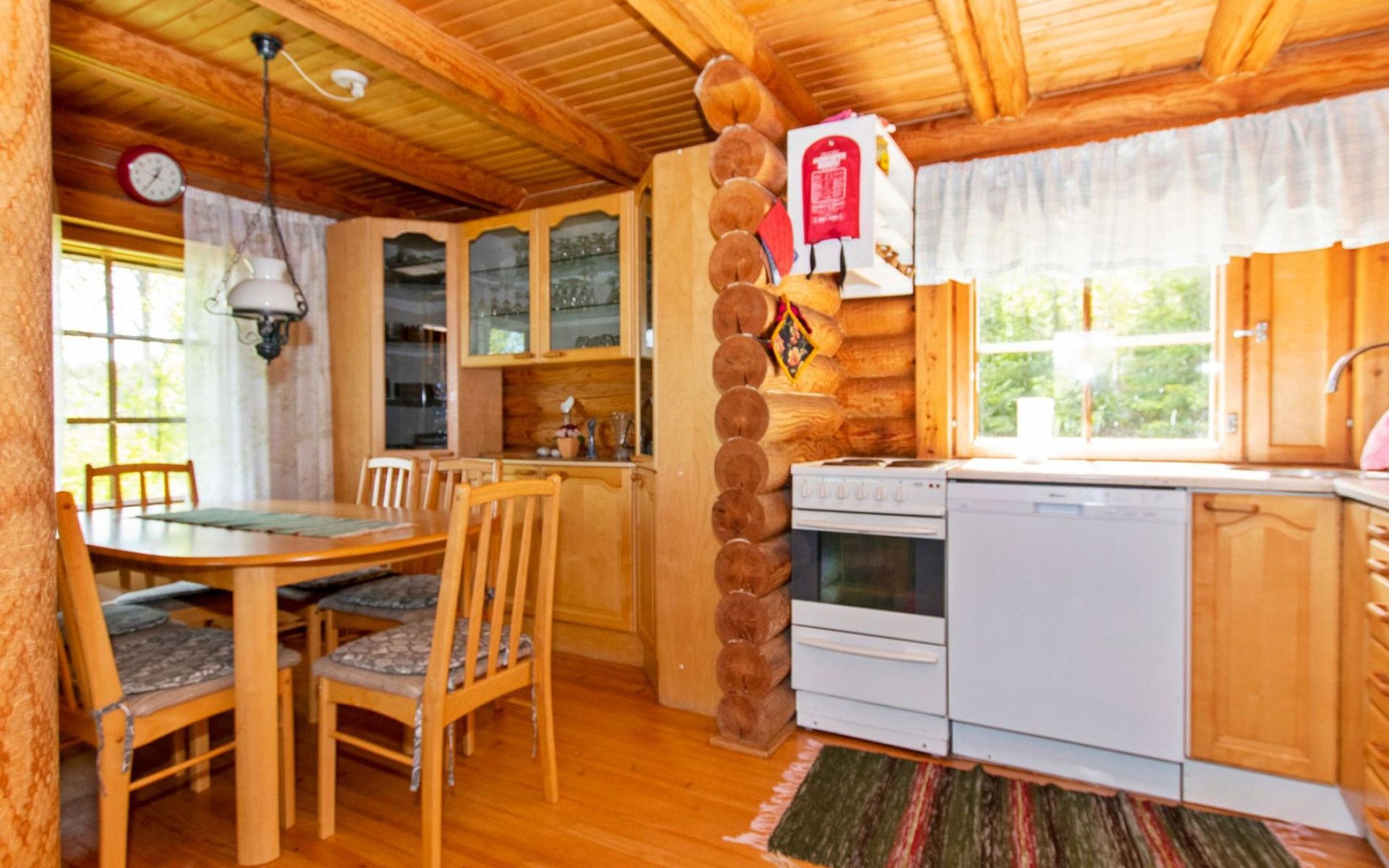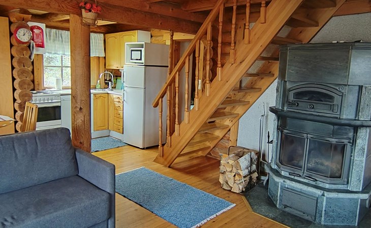 Log-built cabin (built in 1993), living room (sofa bed), bedroom (sofa bed, 140x190 cm extra bed for two), living room / kitchen, washroom with WC, sauna (wood-burning sauna stove), loft with double bed and one single bed (75 x 190 cm) and travel cot for a child.