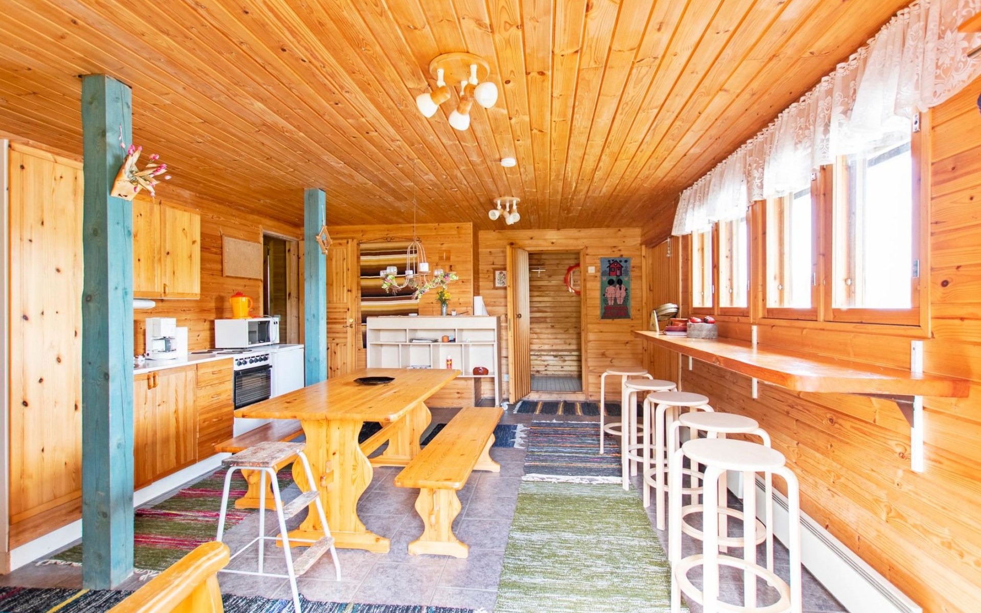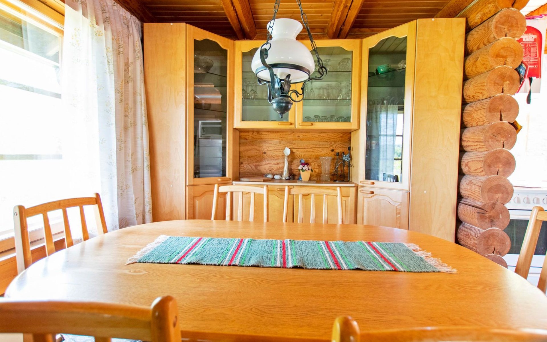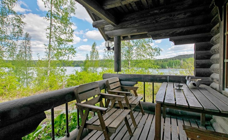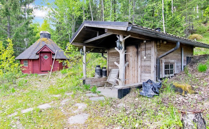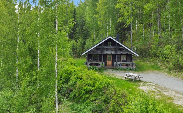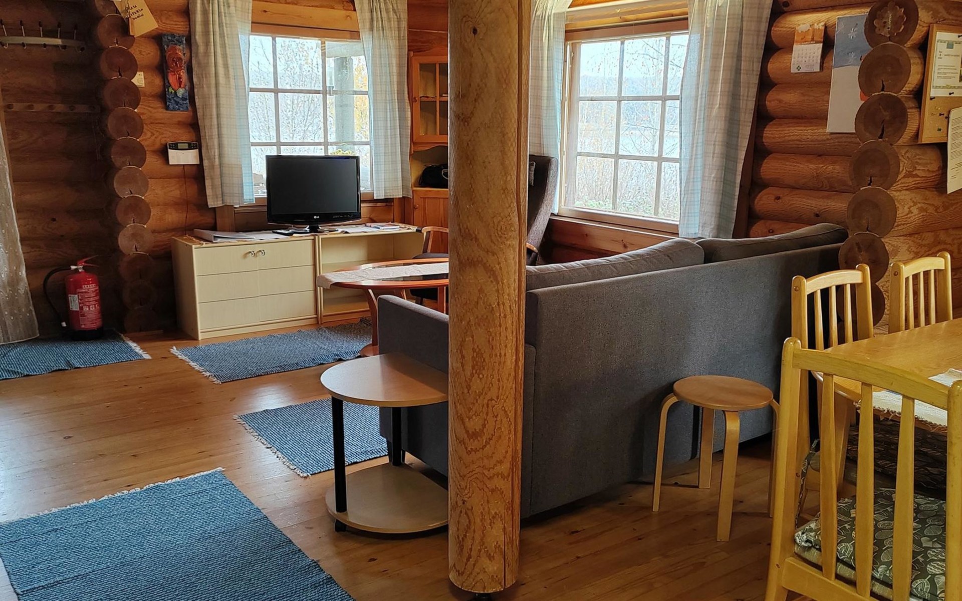 Log-built cabin (built in 1993), living room (sofa bed), bedroom (sofa bed, 140x190 cm extra bed for two), living room / kitchen, washroom with WC, sauna (wood-burning sauna stove), loft with double bed and one single bed (75 x 190 cm) and travel cot for a child.
