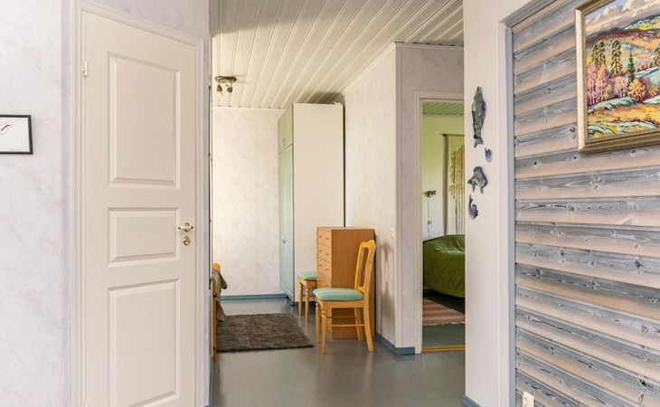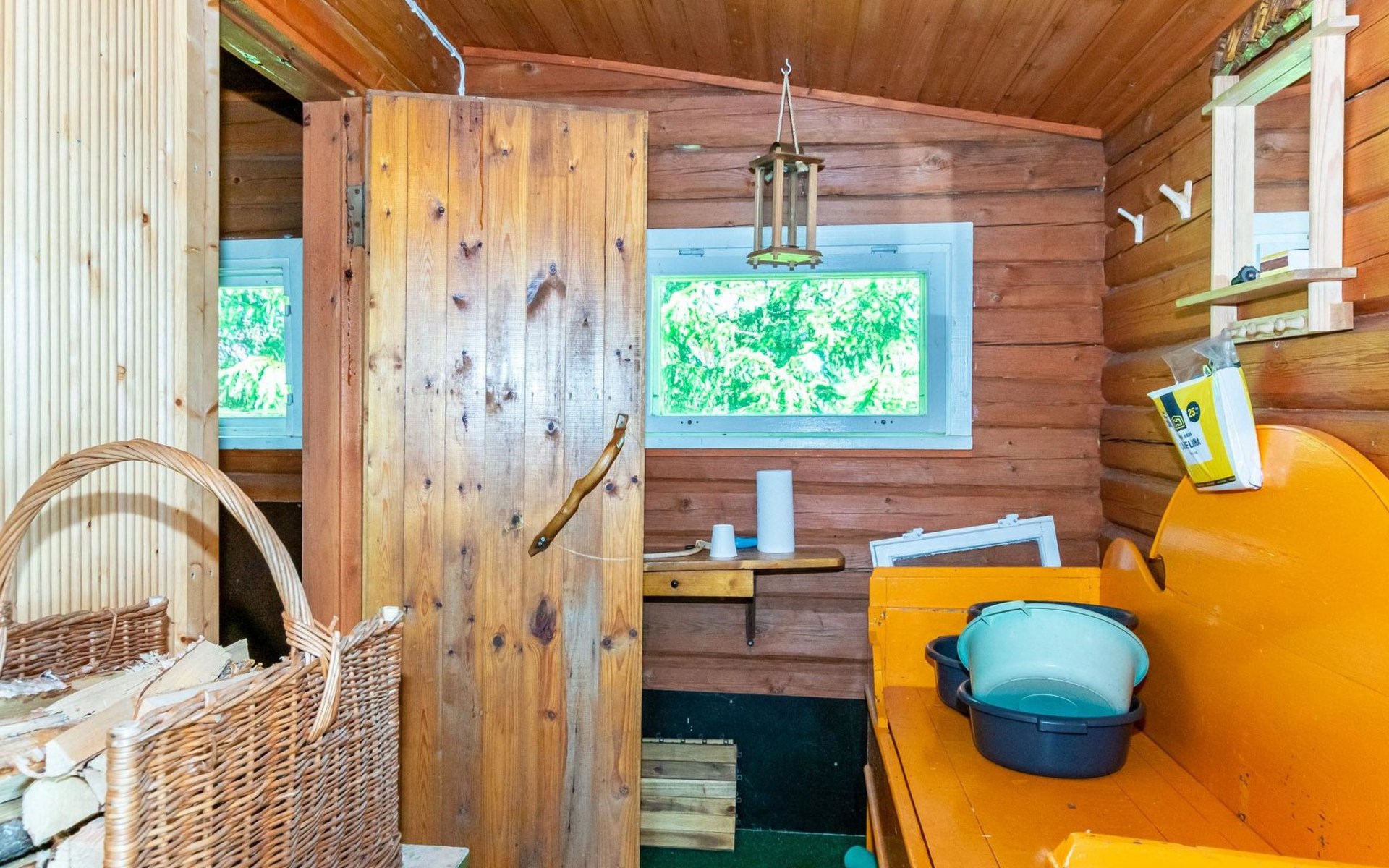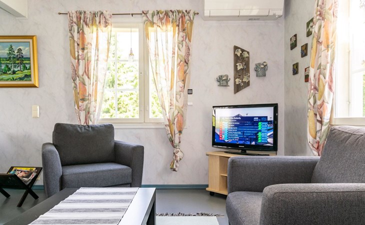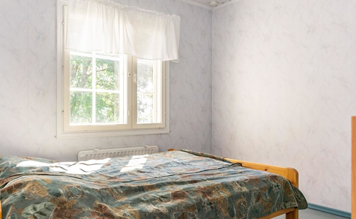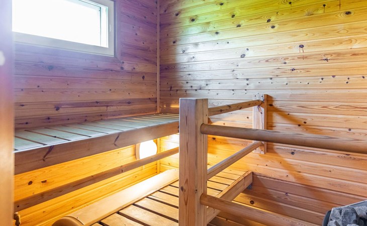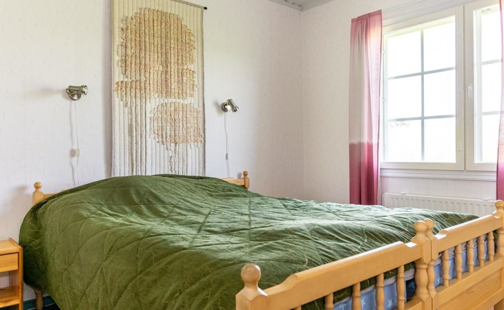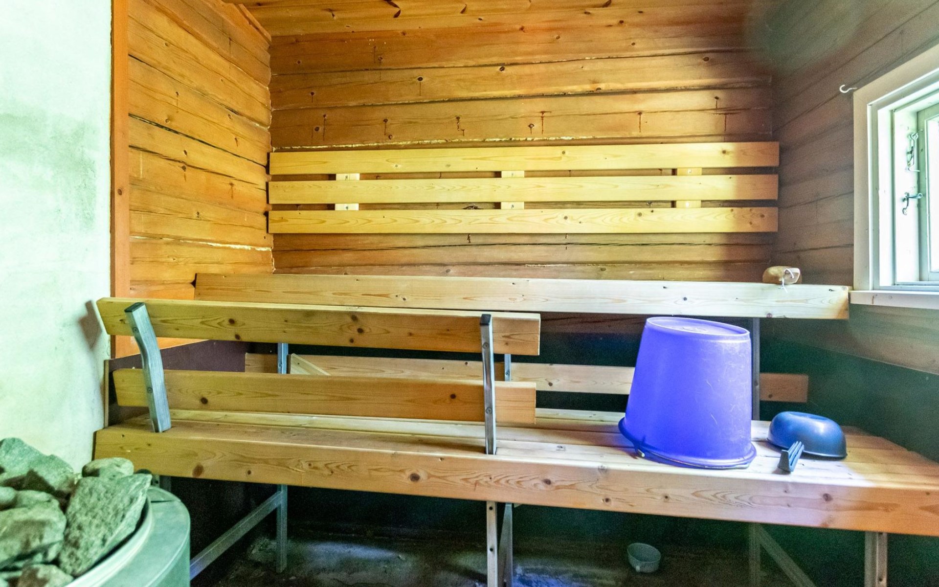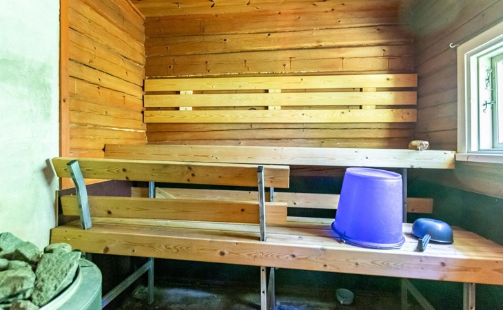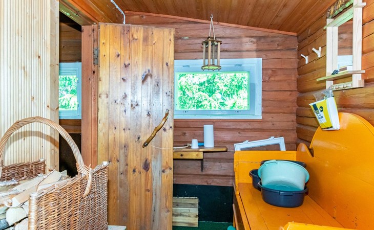 The wooden cabin (2000) features a living room, kitchen, entrance hall, and two bedrooms, each with a double bed. The living room has a sofa bed that converts into a double bed (140 x 200 cm). There is a separate WC, bathroom, and sauna (electric stove). In the yard, there is also a lakeside sauna with a wood-burning stove. The lakesauna is only available from May to September, is not available during the winter. The water for the beach sauna is supplied from a water hose located on the wall of the cottage, which receives cold water from the municipal network.