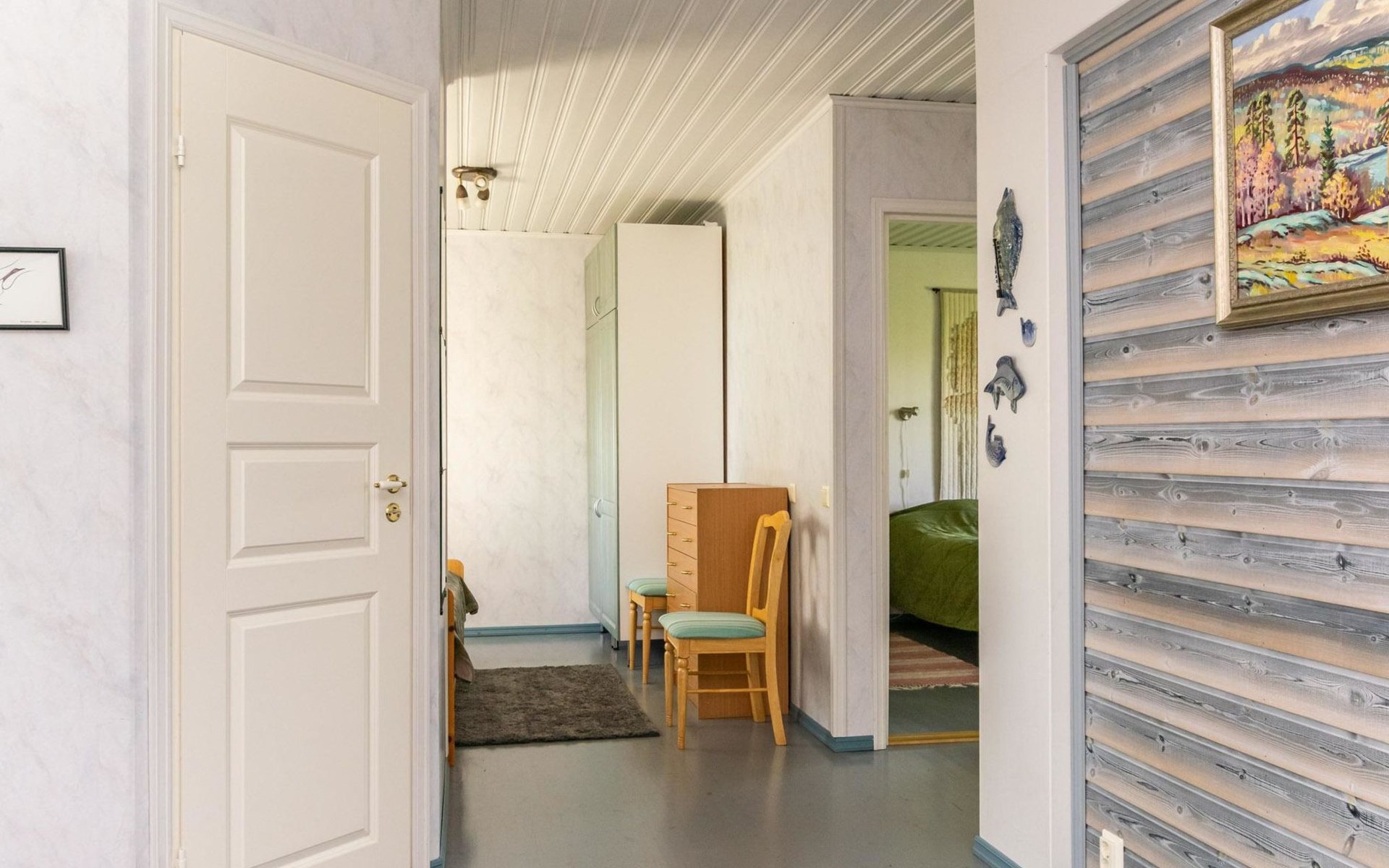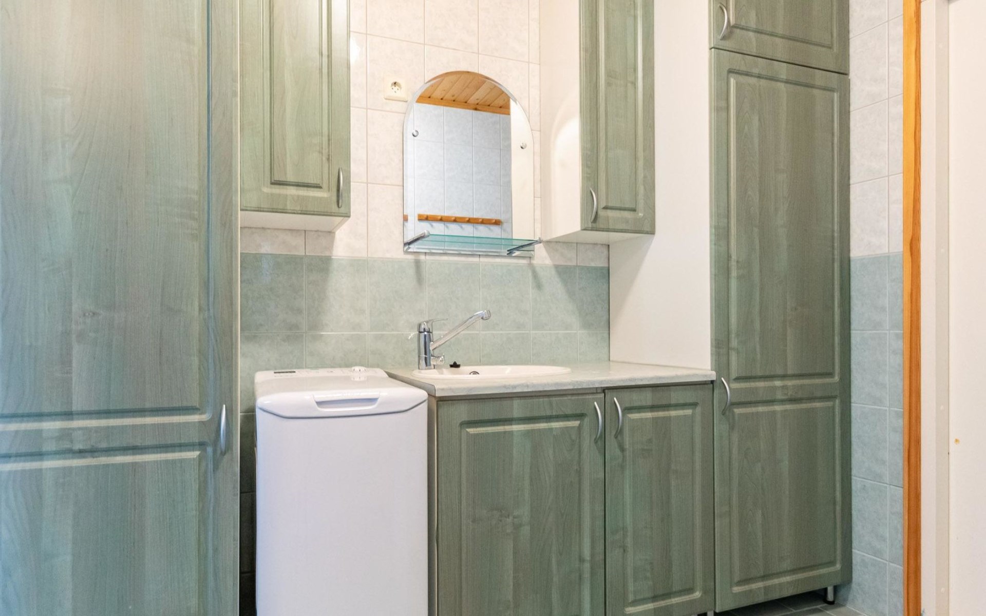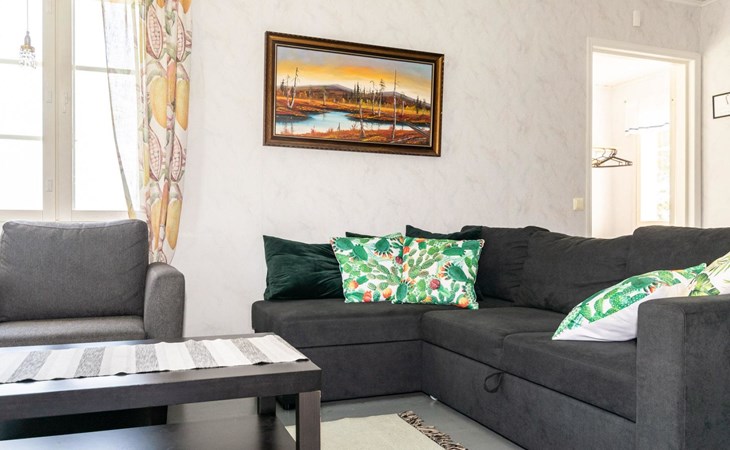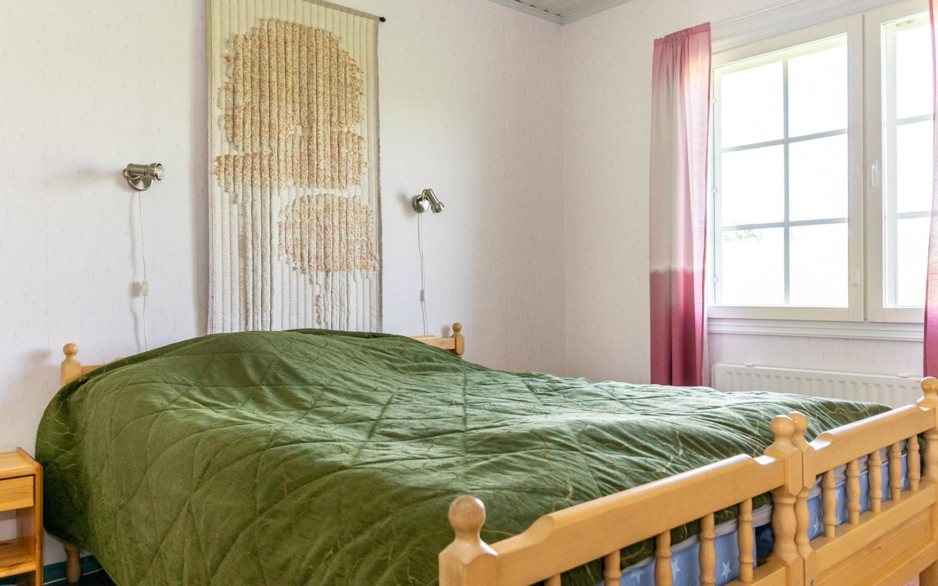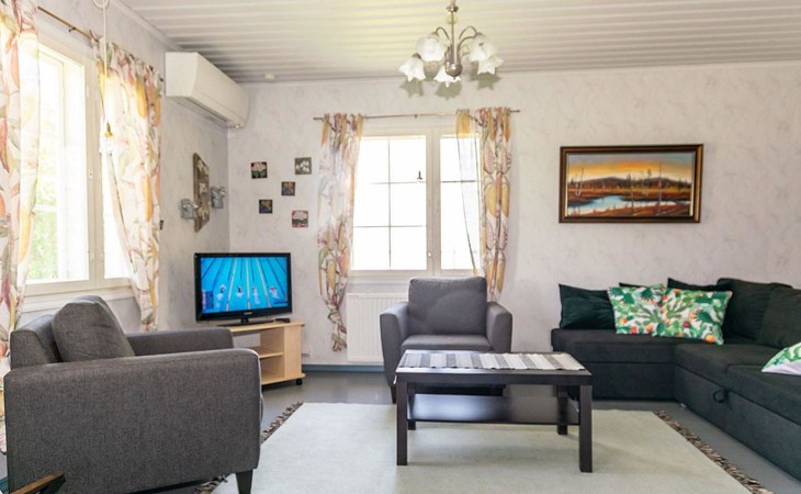 The wooden cabin (2000) features a living room, kitchen, entrance hall, and two bedrooms, each with a double bed. The living room has a sofa bed that converts into a double bed (140 x 200 cm). There is a separate WC, bathroom, and sauna (electric stove). In the yard, there is also a lakeside sauna with a wood-burning stove. The lakesauna is only available from May to September, is not available during the winter. The water for the beach sauna is supplied from a water hose located on the wall of the cottage, which receives cold water from the municipal network.