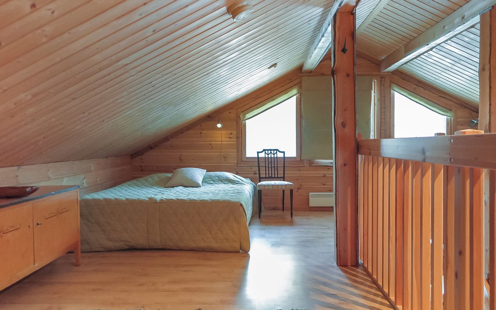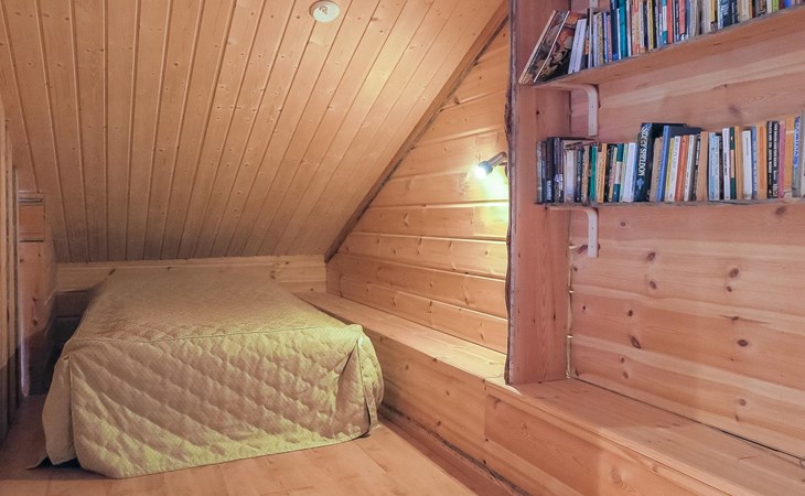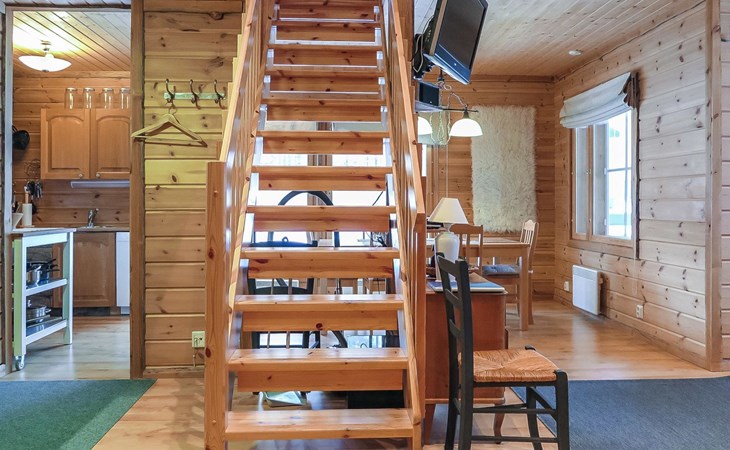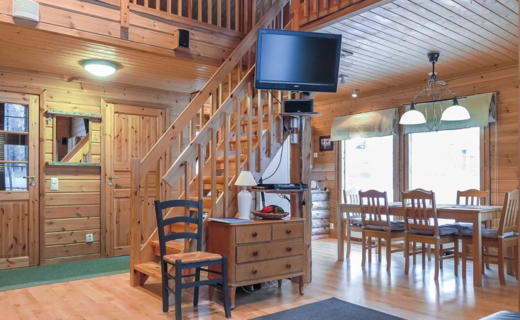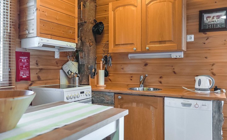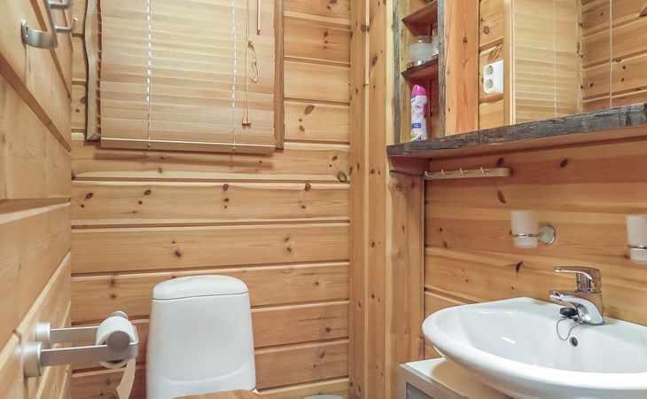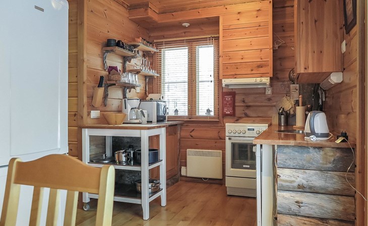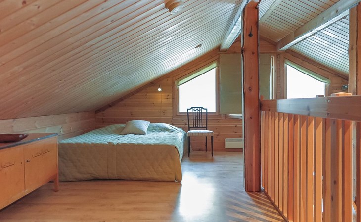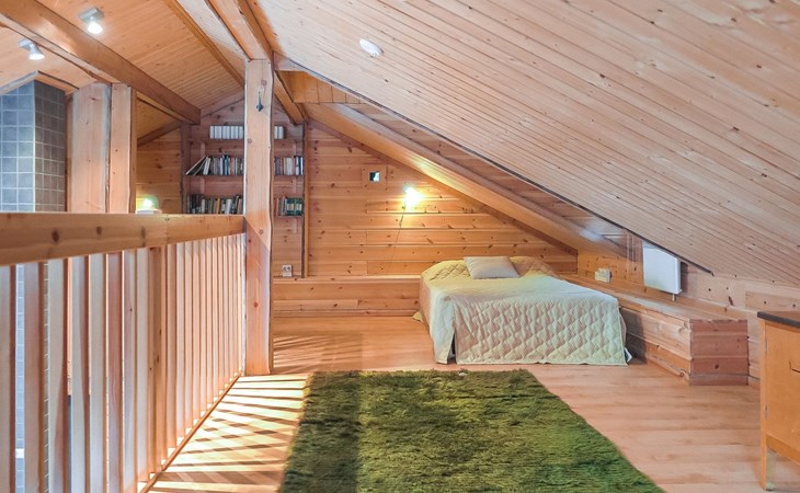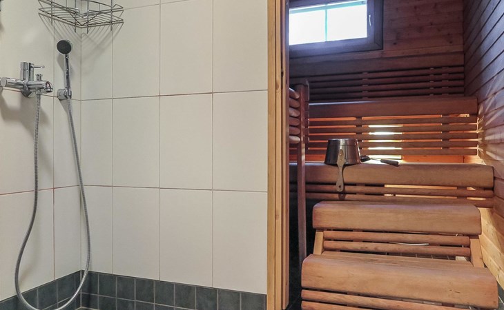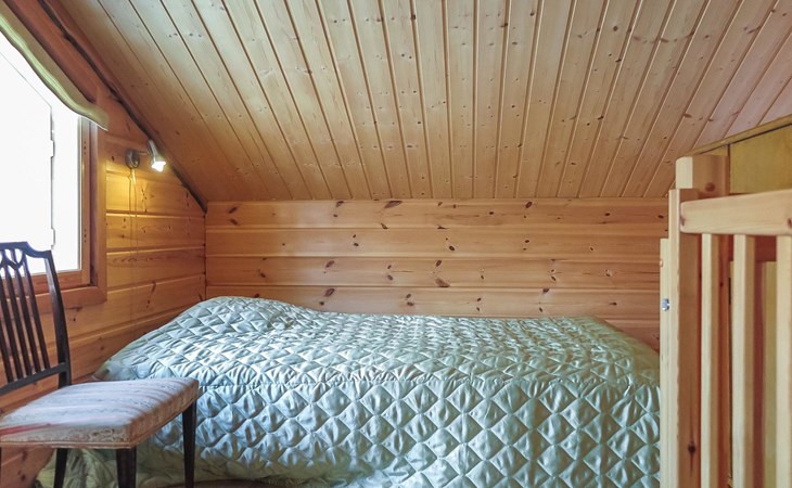 Wooden semi-detached house, built in 2005. Living room with sofa, kitchenette, bedroom with double bed (sliding door). Loft with double bed and 2 single beds (widths 80 cm and 120 cm). Sauna, washing room, separate toilet and small covered porch. The kitchen also has coffee and water kettles, an espresso machine (the customer brings the capsules) and a toaster.